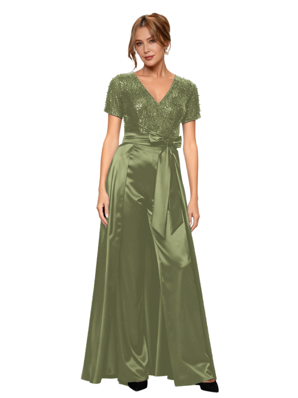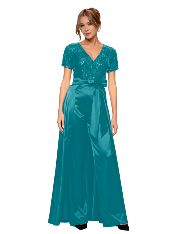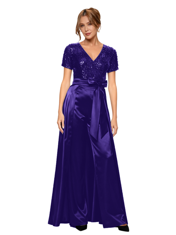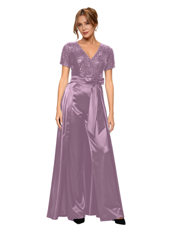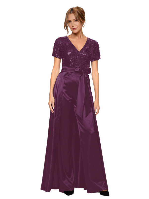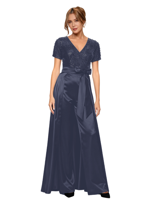 Elegant Short Sleeves Lace Satin Jumpsuit Mother Of The Bride Dresses