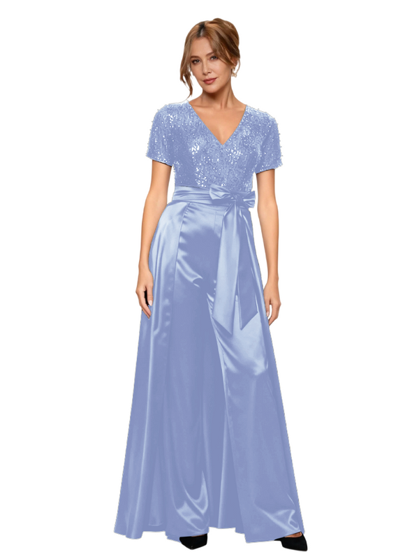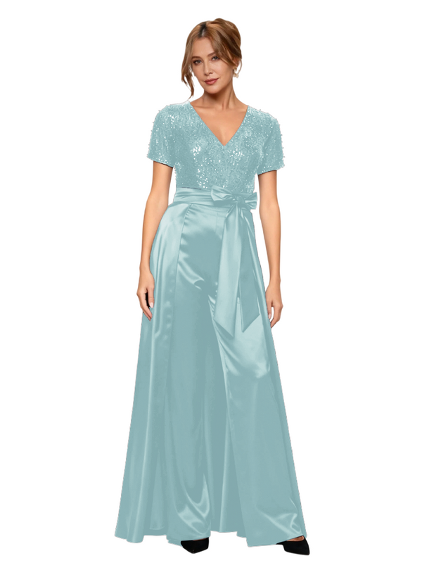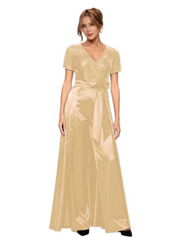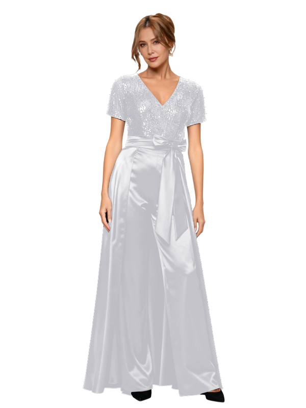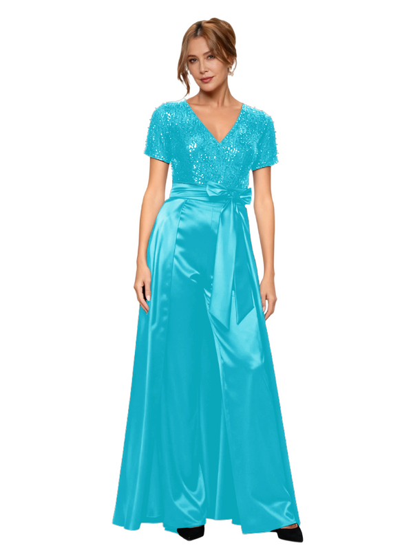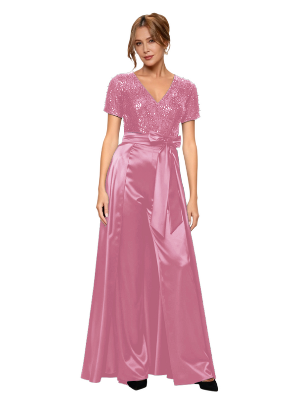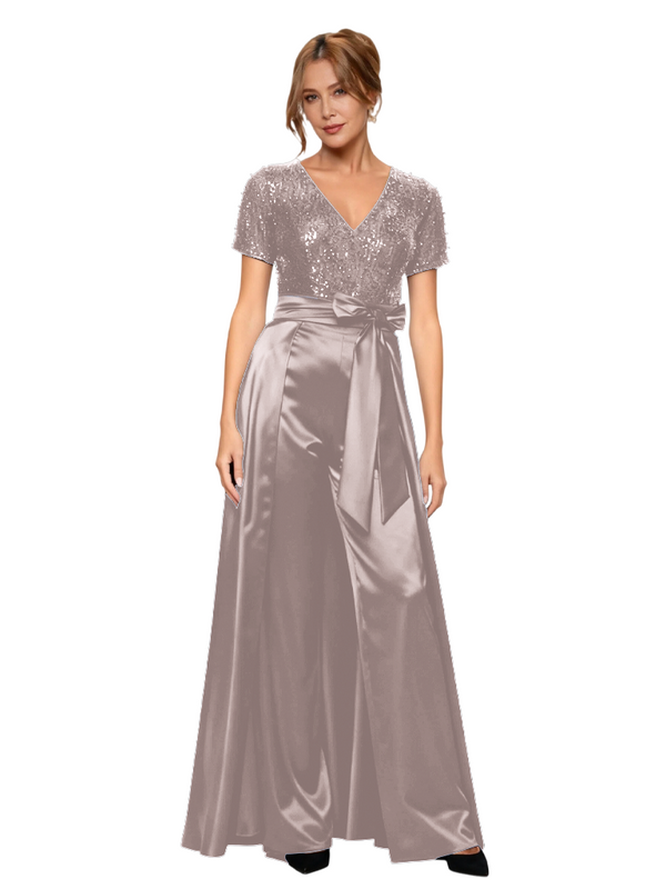 Elegant Short Sleeves Lace Satin Jumpsuit Mother Of The Bride Dresses