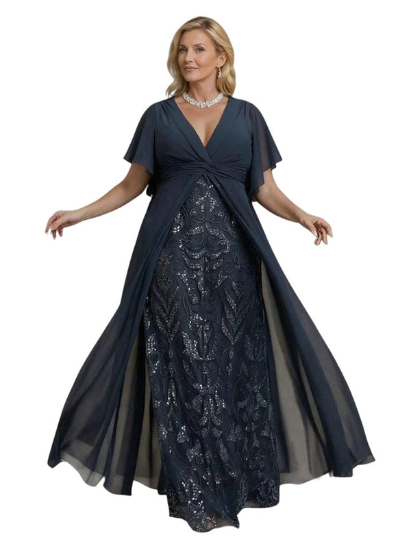 Elegant Lace Short Sleeves Chiffon V-neck Floor-length Mother of The Bride DressesElegant Lace Short Sleeves Chiffon V-neck Floor-length Mother of The Bride Dresses