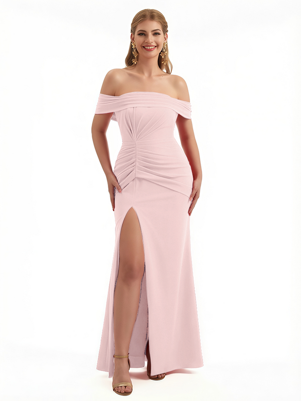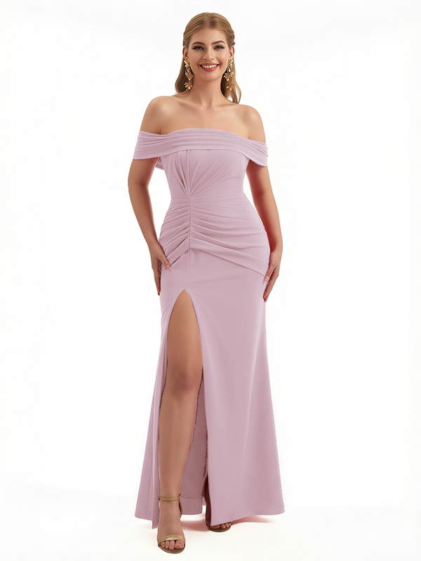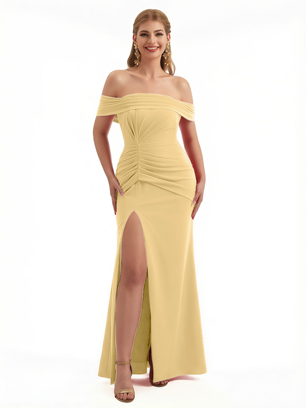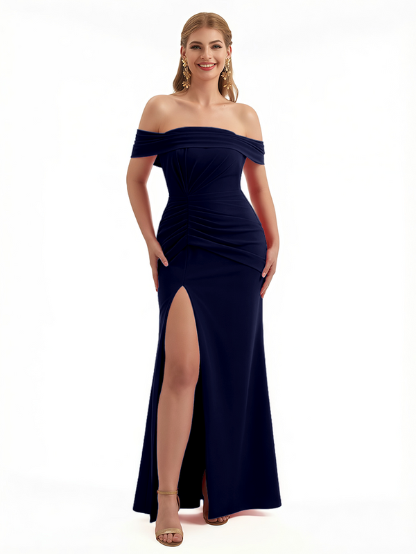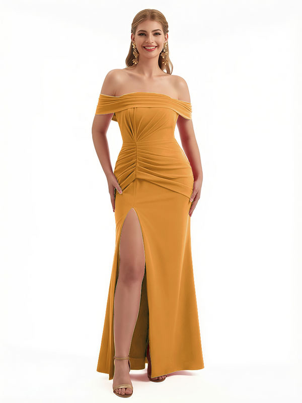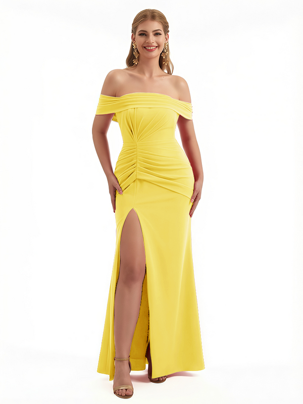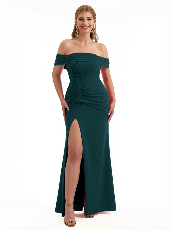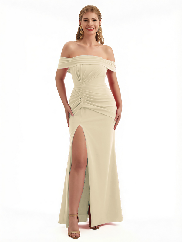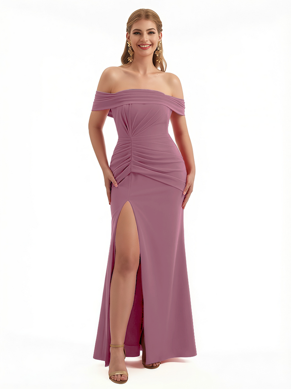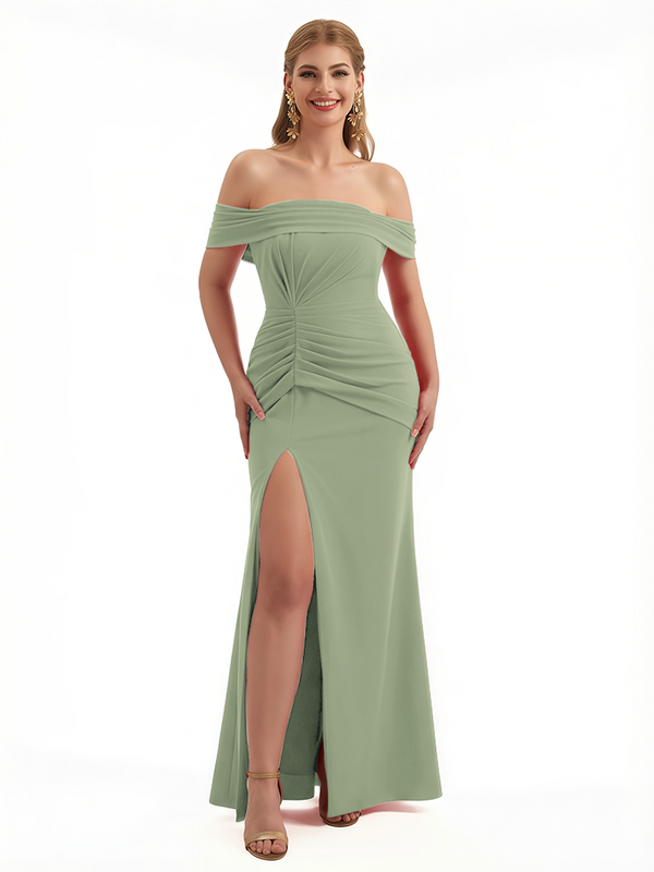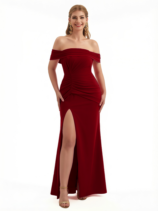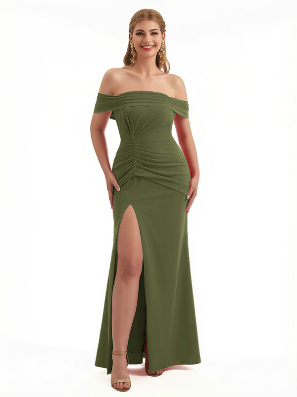 Elegant Off The Shoulder Ruched Stretchy Crepe Mermaid Maxi Evening Gowns For Women Side Slit