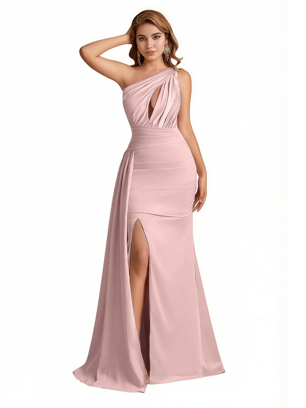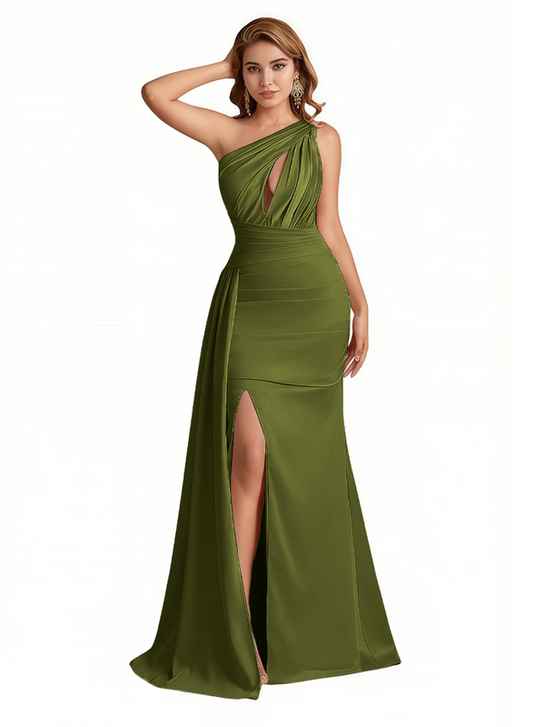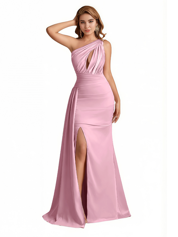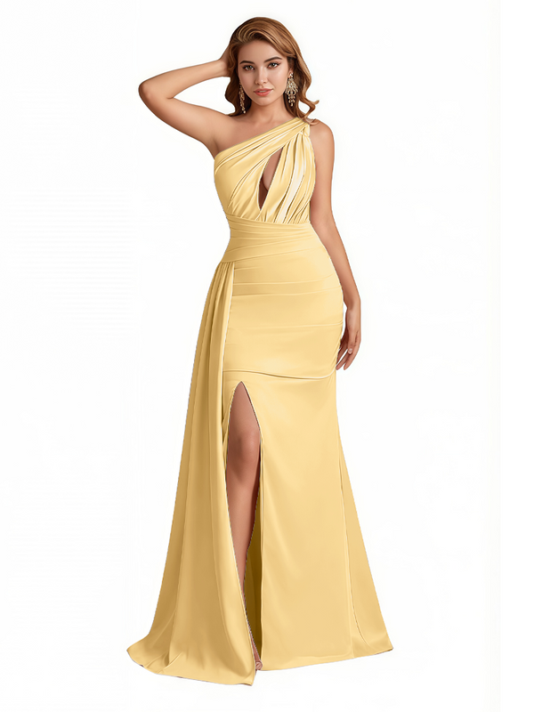 Sexy One Shoulder Mermaid Silky Satin Long Formal Dresses Side Slit