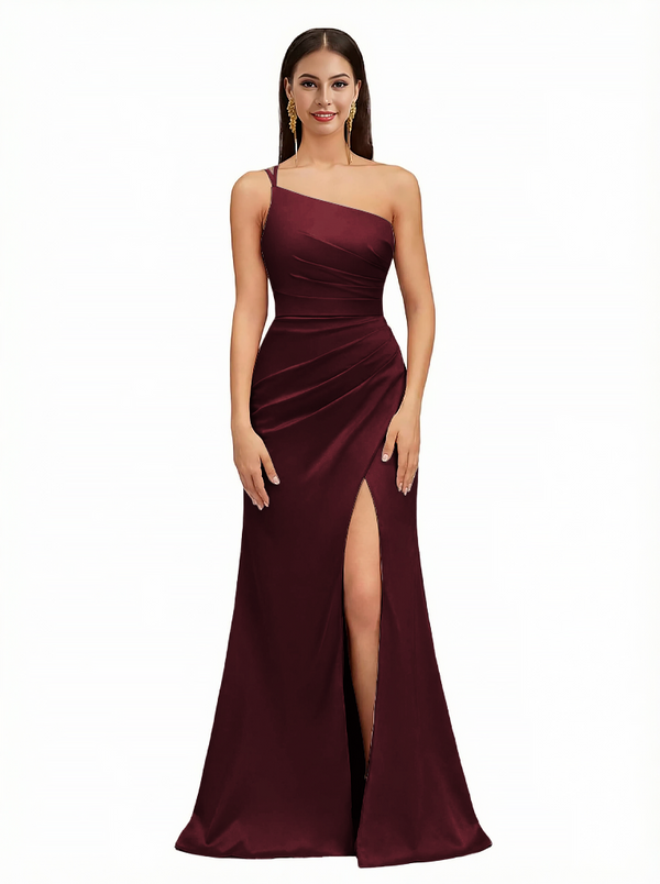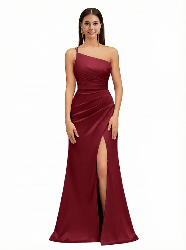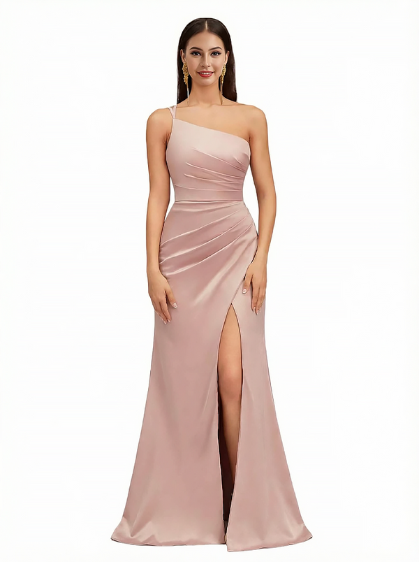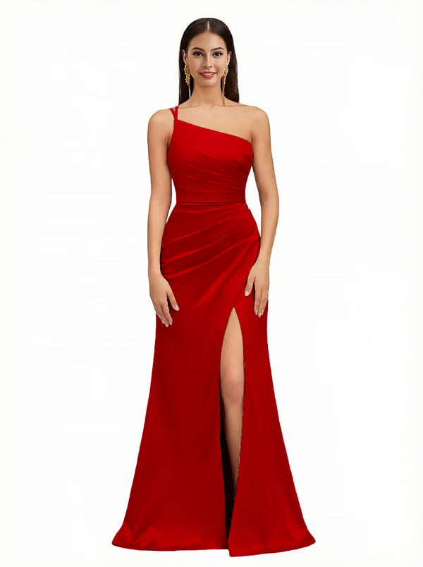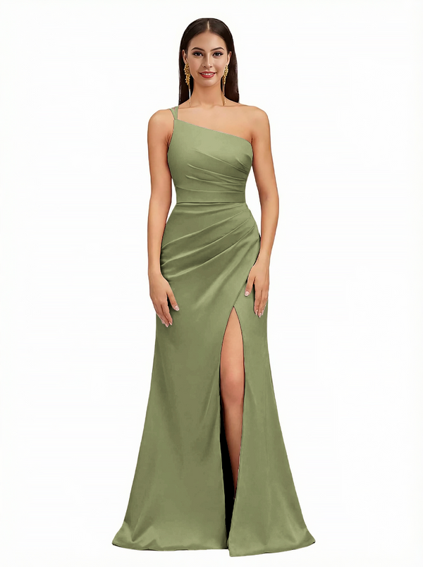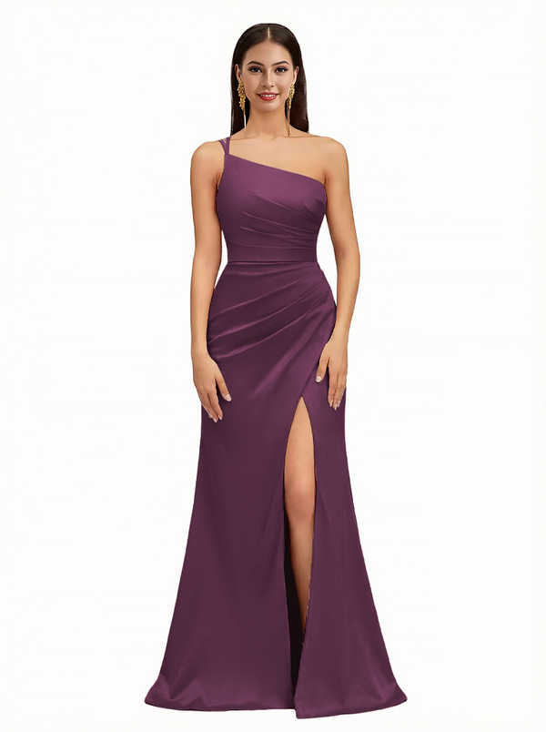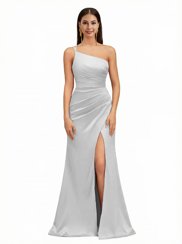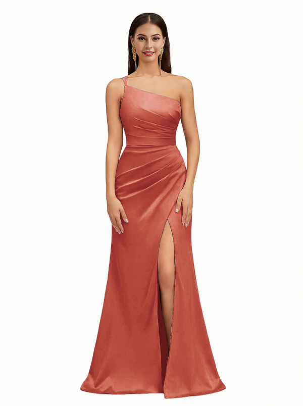Sexy One Shoulder Side Slit Mermaid Silky Satin Ruching Maxi Evening Dresses For Women
