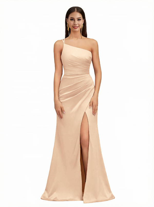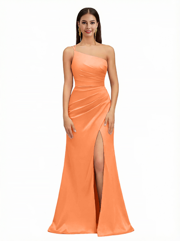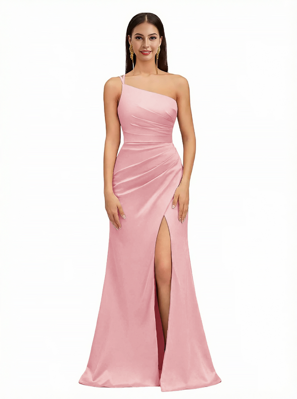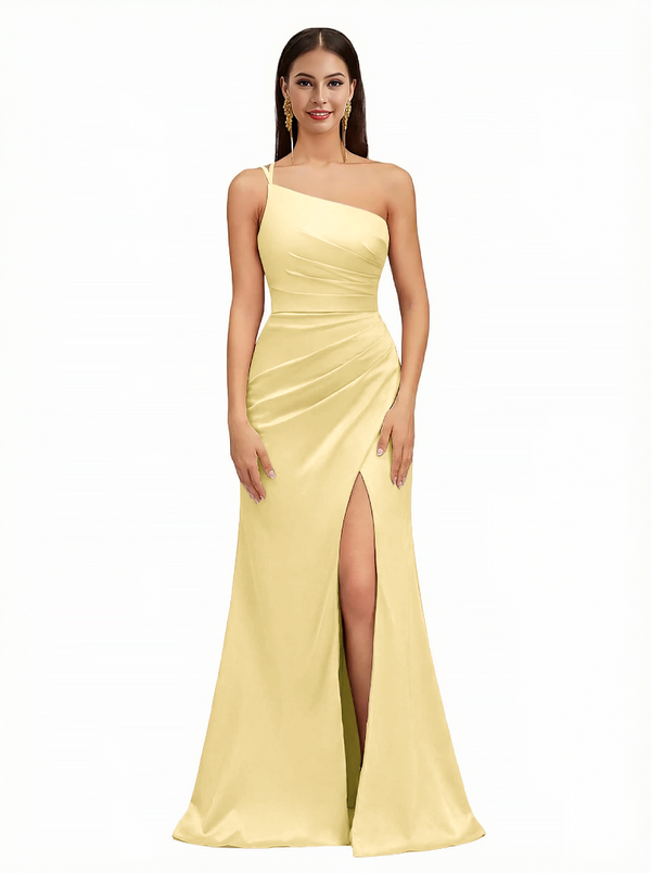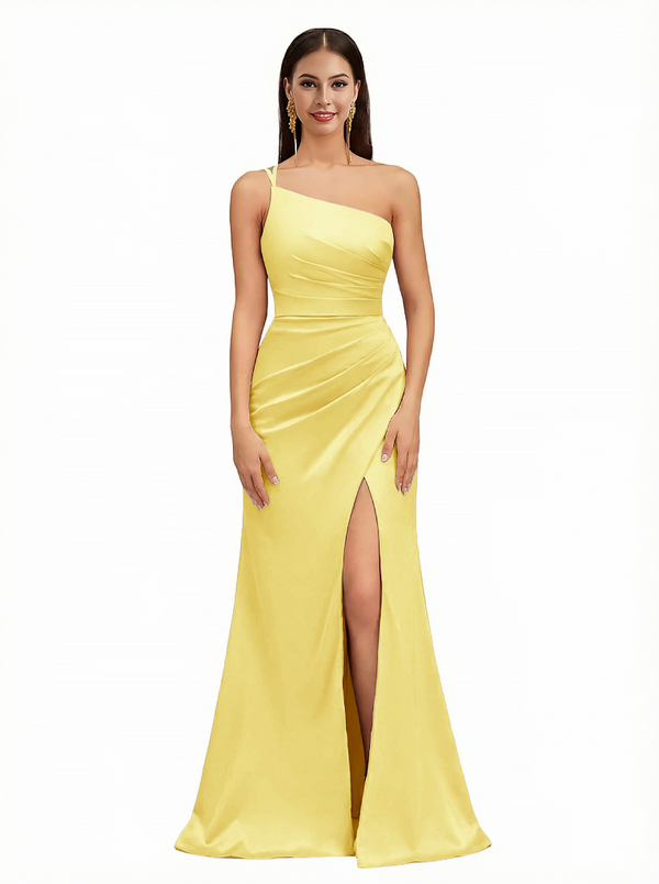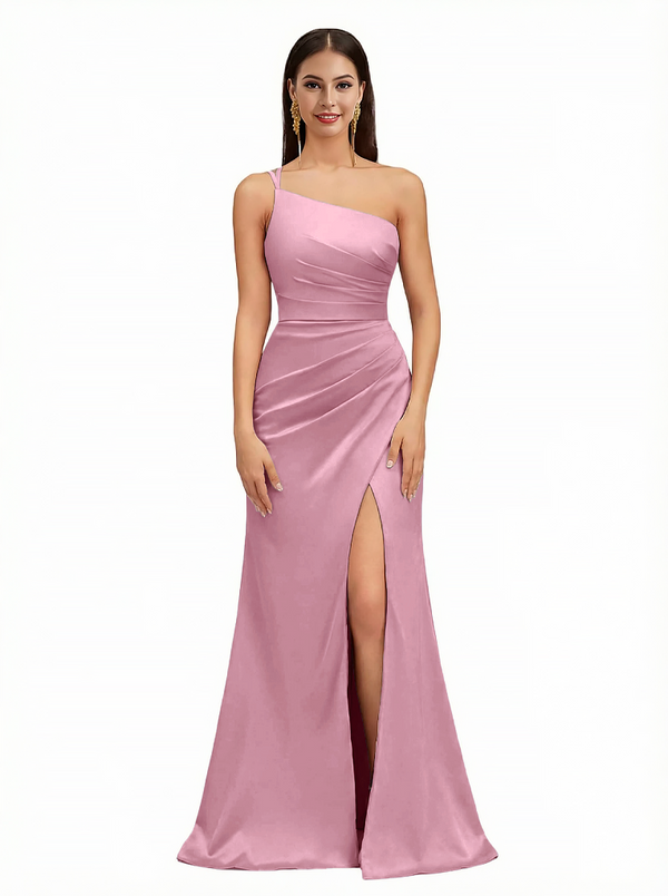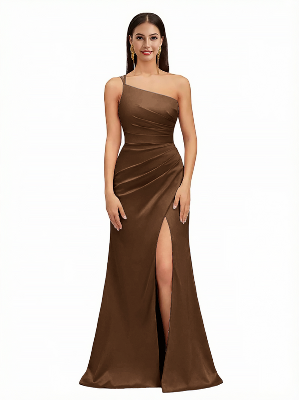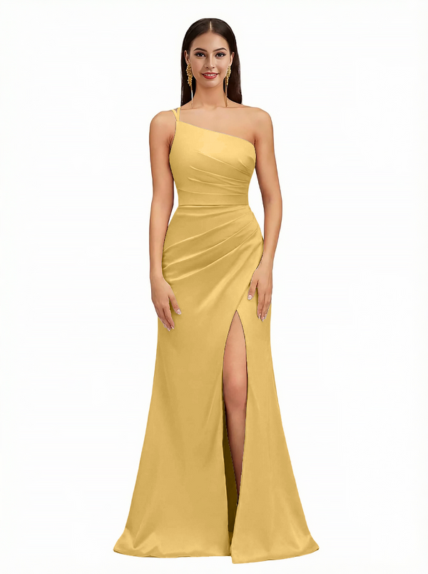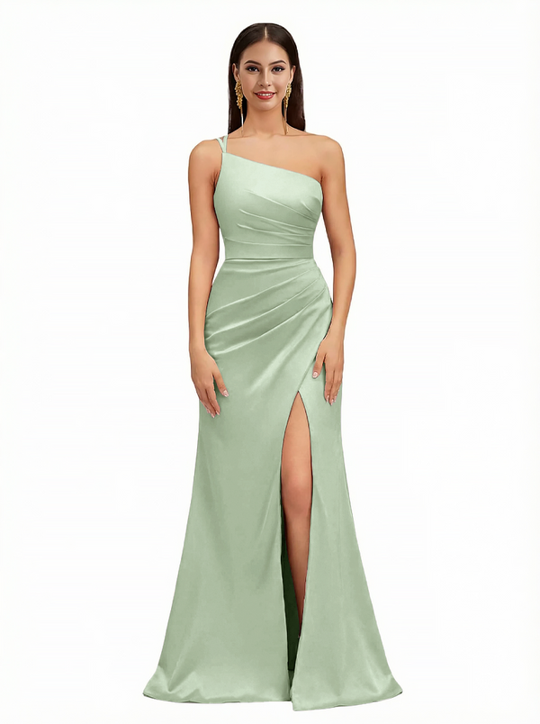 Sexy One Shoulder Side Slit Mermaid Silky Satin Ruching Maxi Evening Dresses For Women