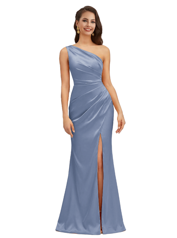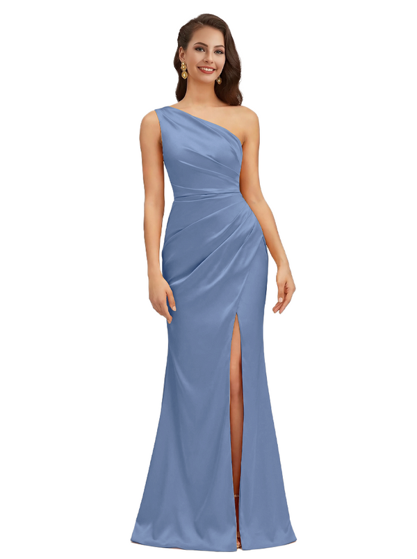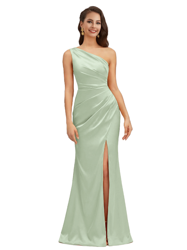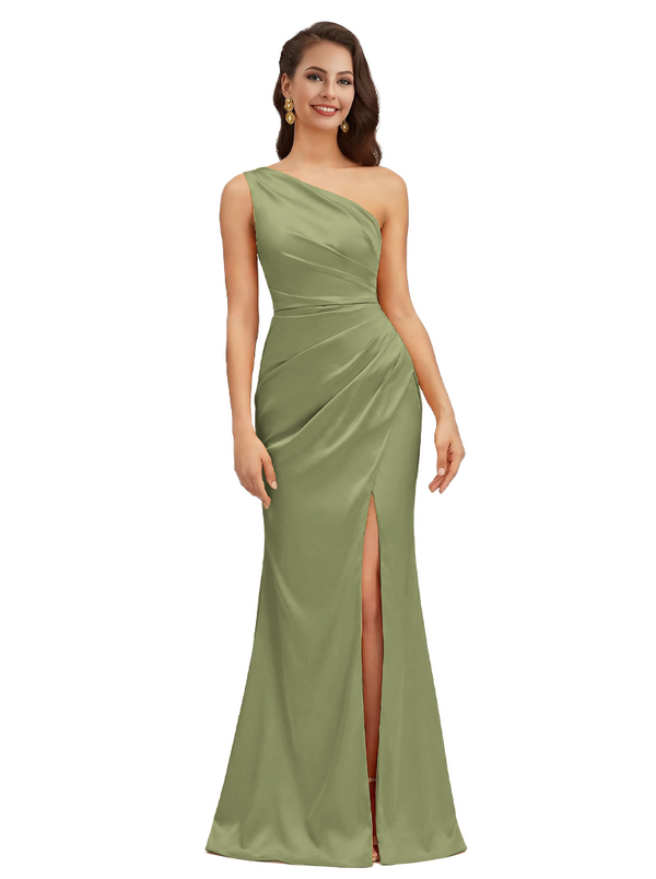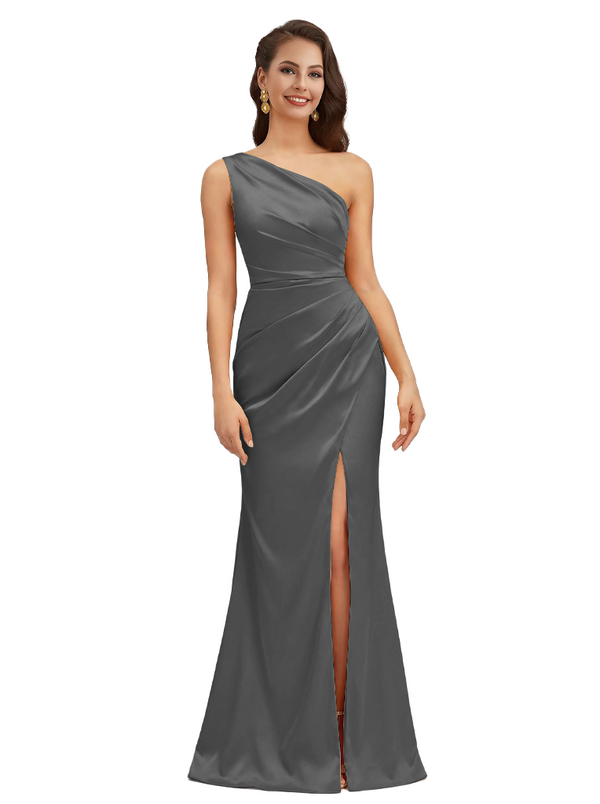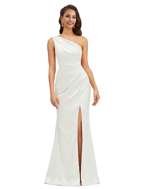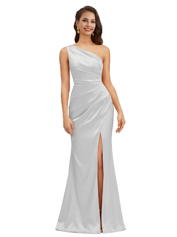 Sexy One Shoulder Side Slit Ruched Silky Satin Mermaid Maxi Formal Dressing For Women