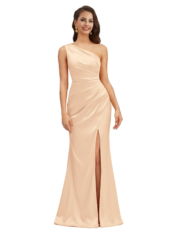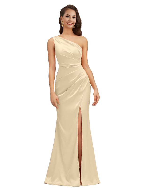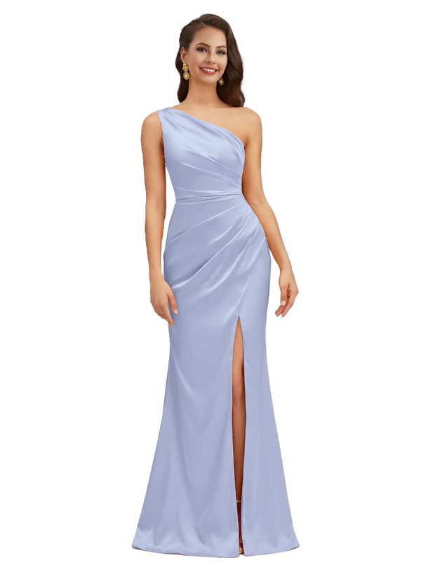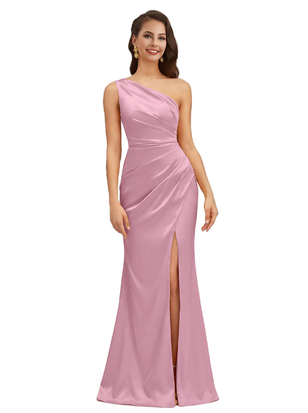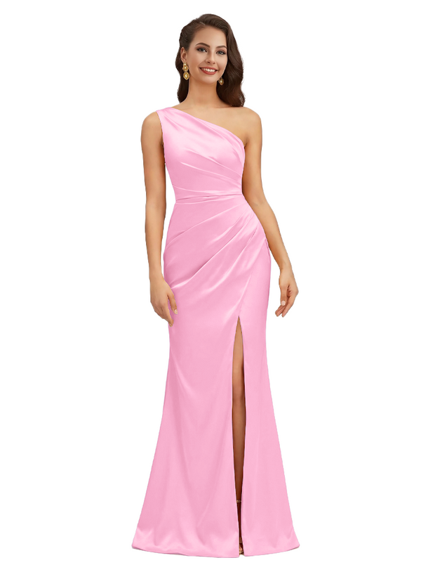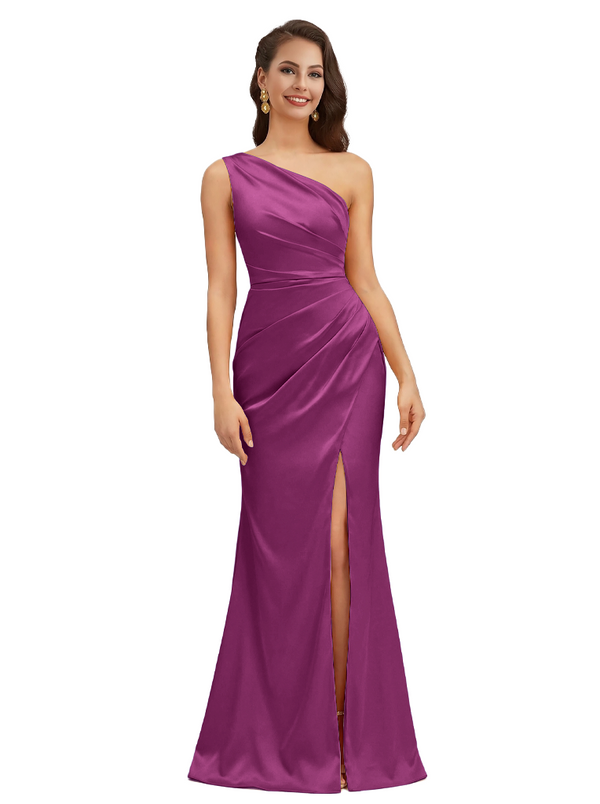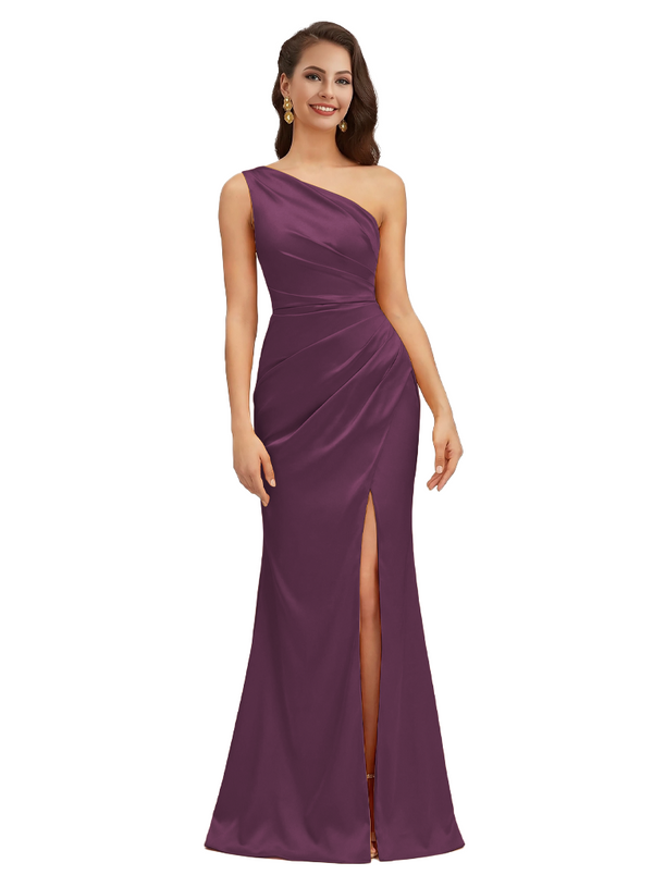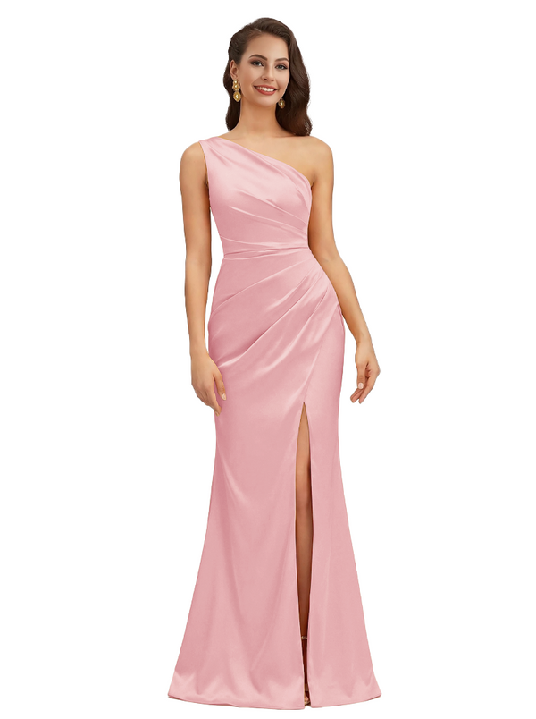 Sexy One Shoulder Side Slit Ruched Silky Satin Mermaid Maxi Formal Dressing For Women