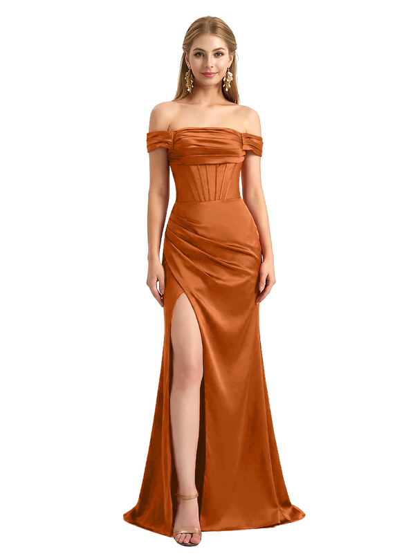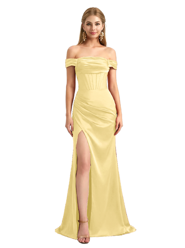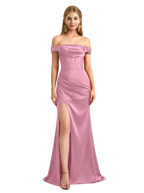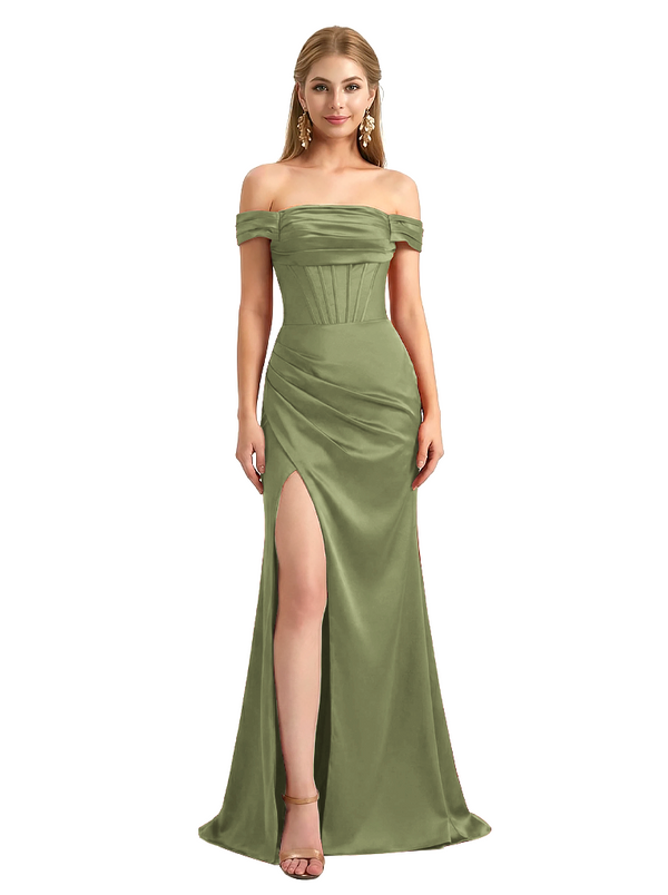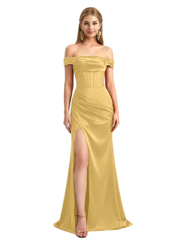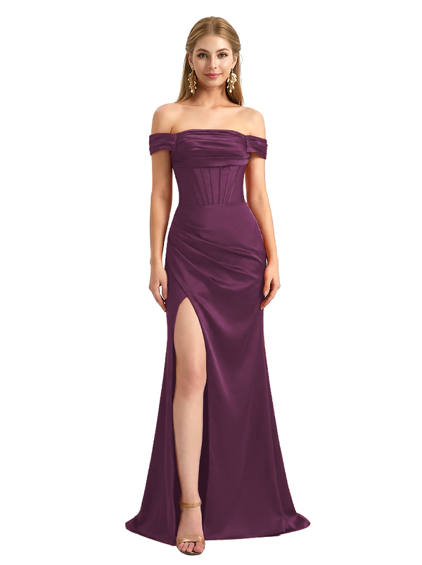 Sexy Side Slit Boning Off The Shoulder Silky Satin Mermaid Maxi Evening Gowns For Women