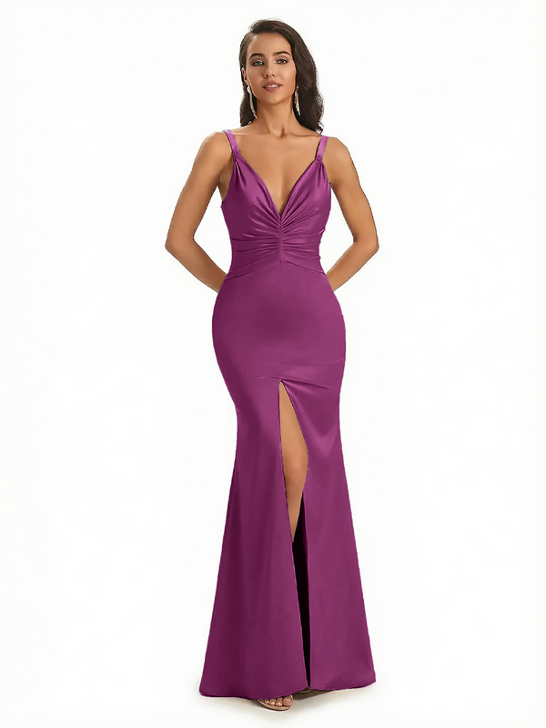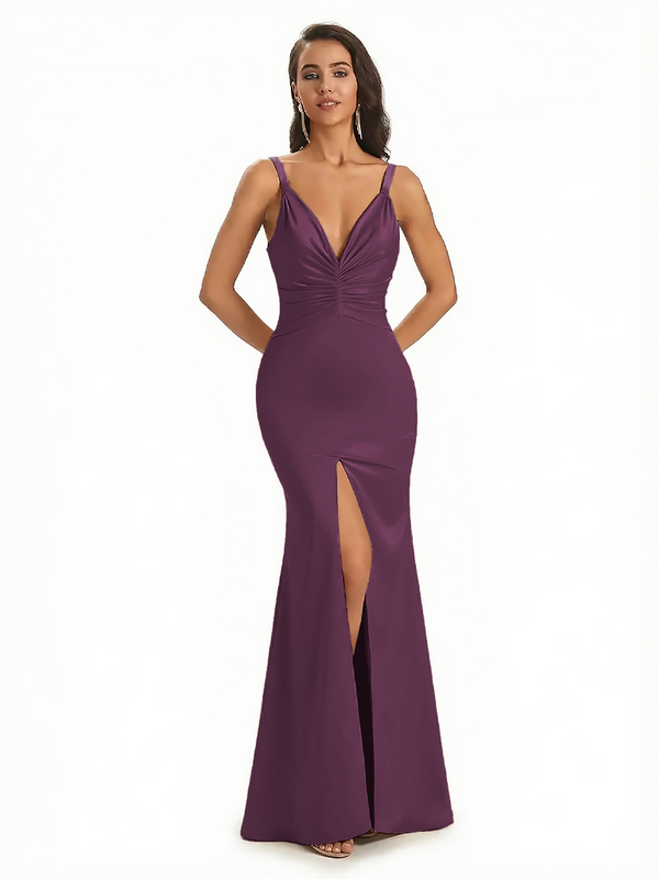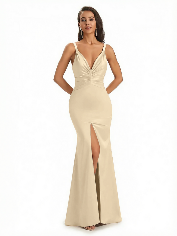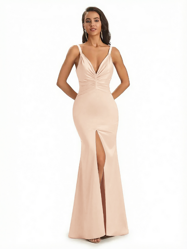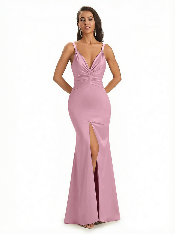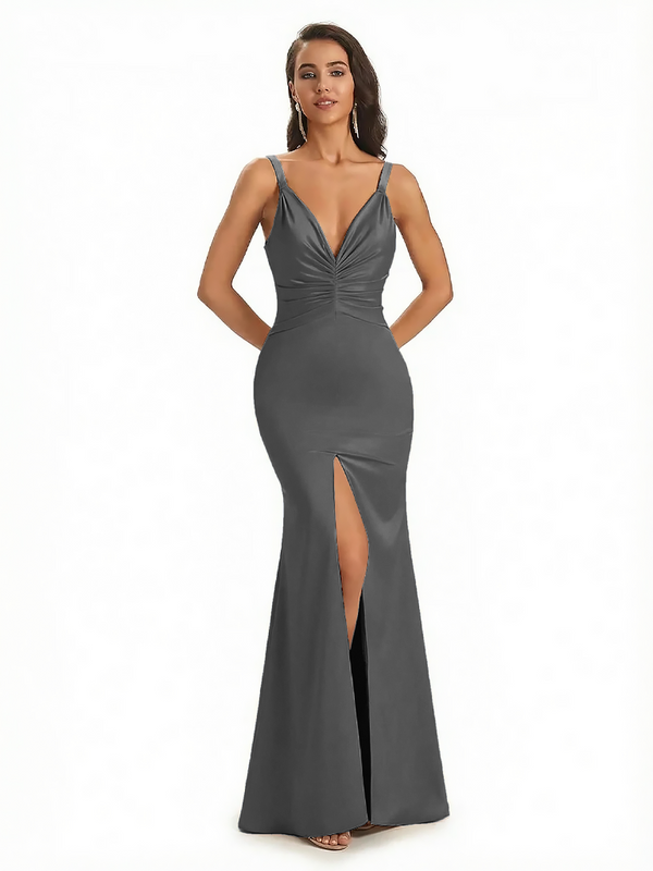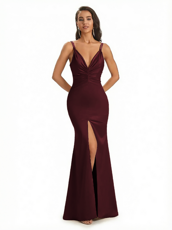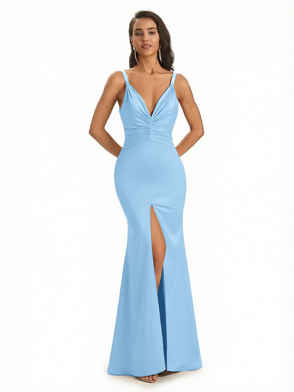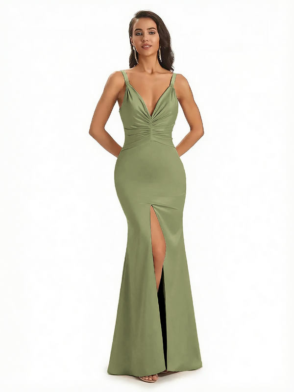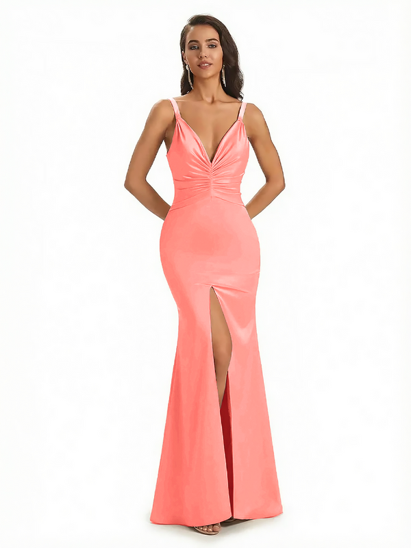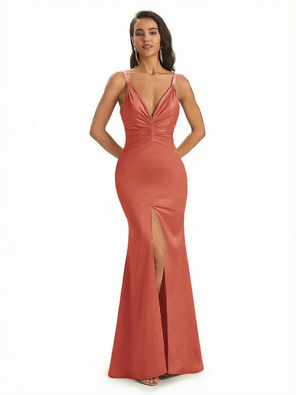 Trendy Spaghetti Straps V-Neck Silky Satin Mermaid Long Evening Gown Dresses For Women