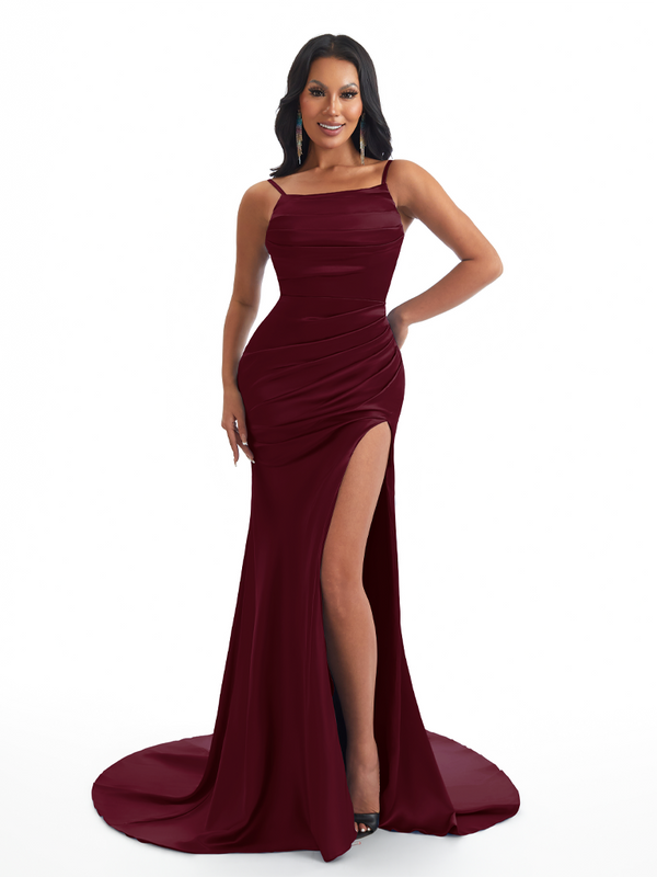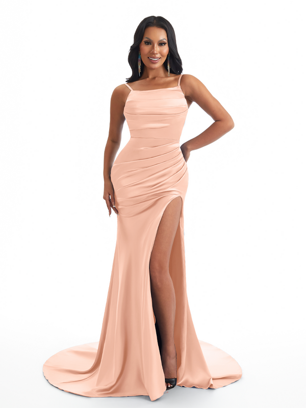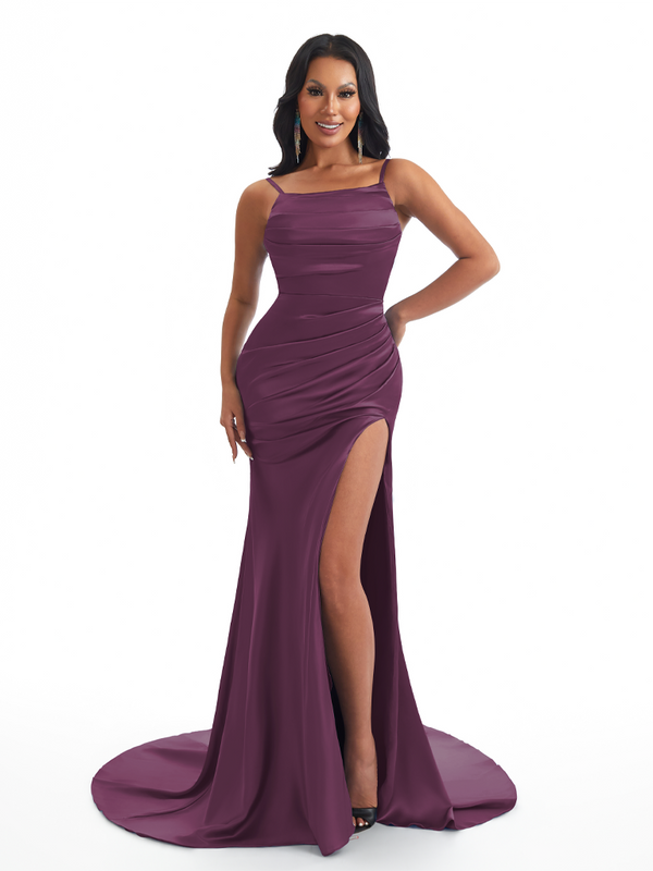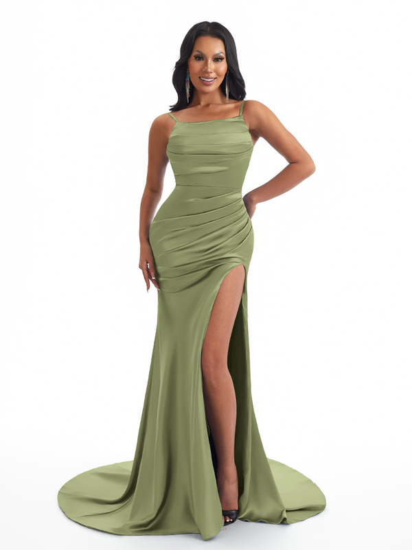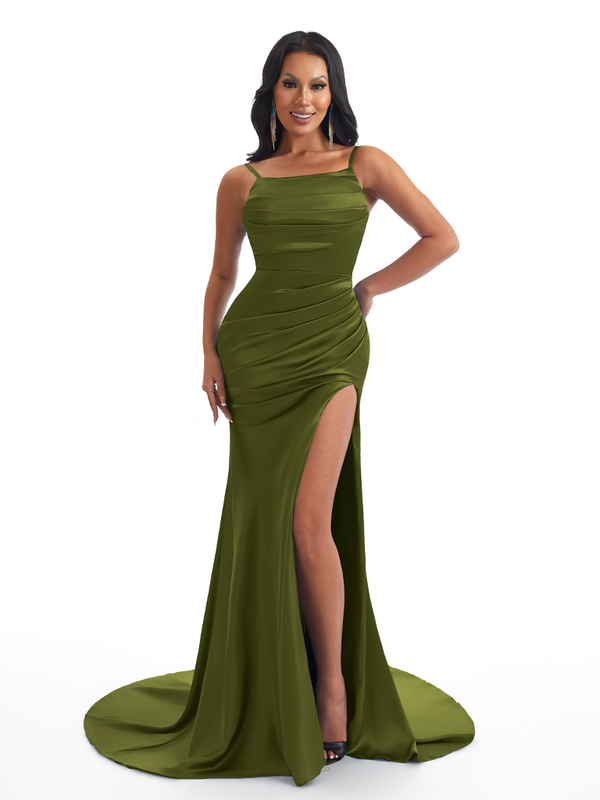 Sexy Spaghetti Straps Mermaid Soft Satin Side Slit Beauty Long Bridesmaid Dresses Online