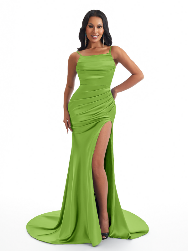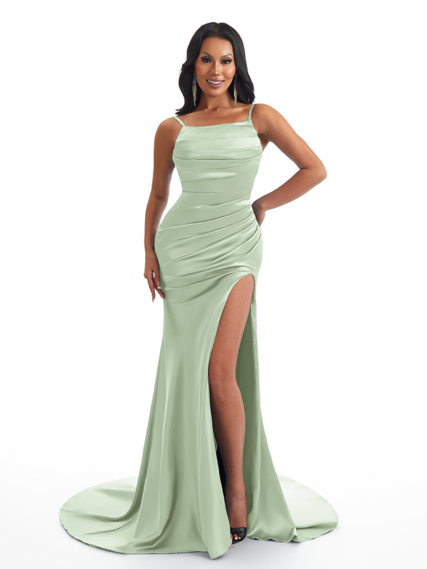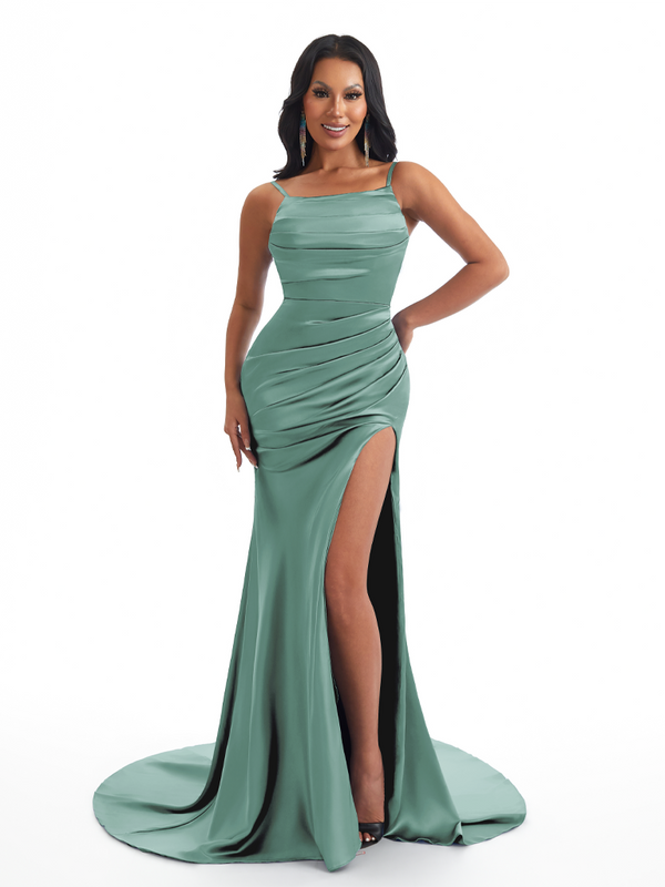Sexy Spaghetti Straps Mermaid Soft Satin Side Slit Beauty Long Bridesmaid Dresses Online $108.99