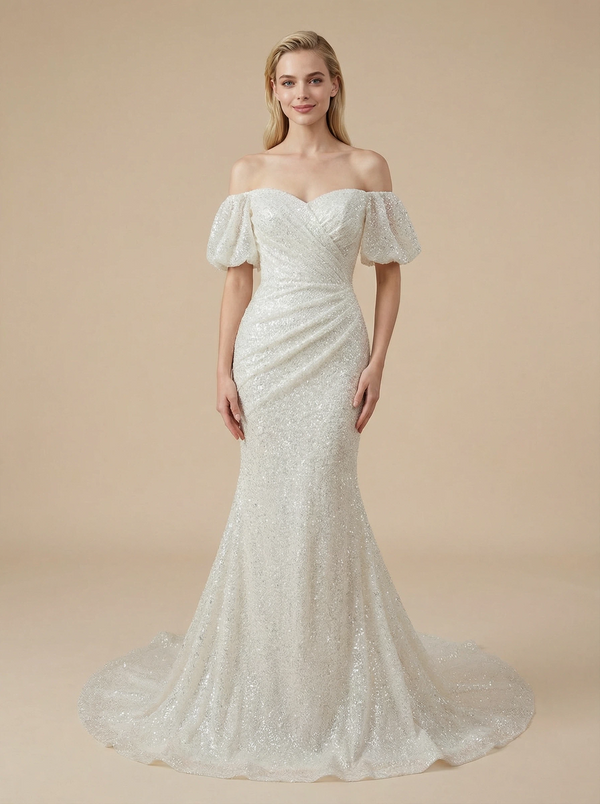 Mermaid Off Shoulder Ruching Maxi Long Sequin Wedding Dresses With Train