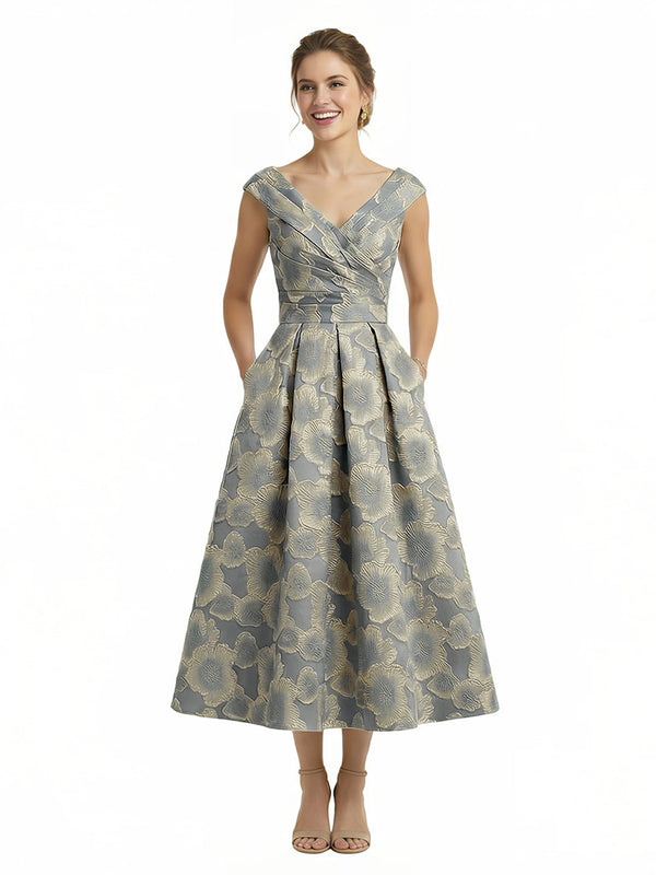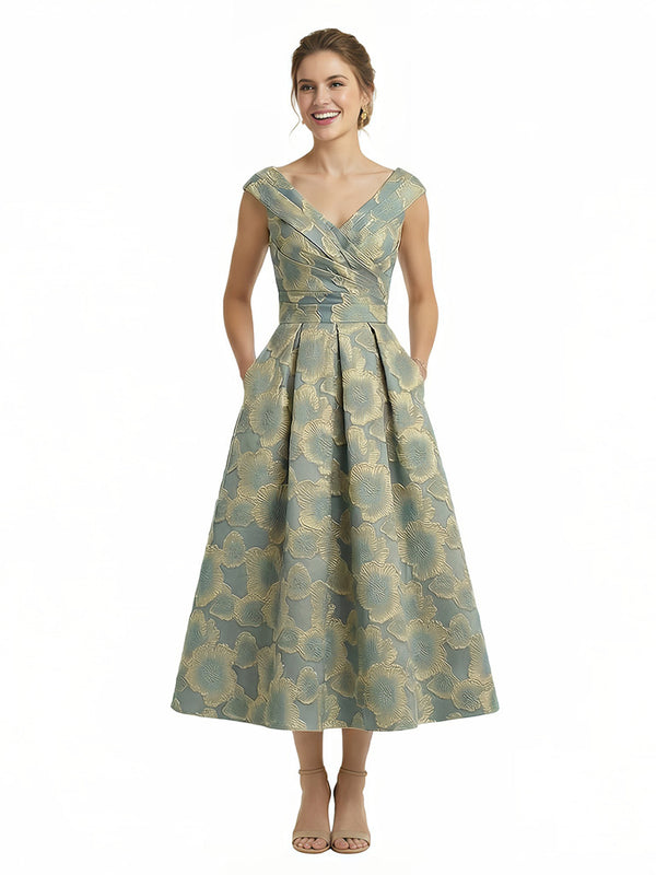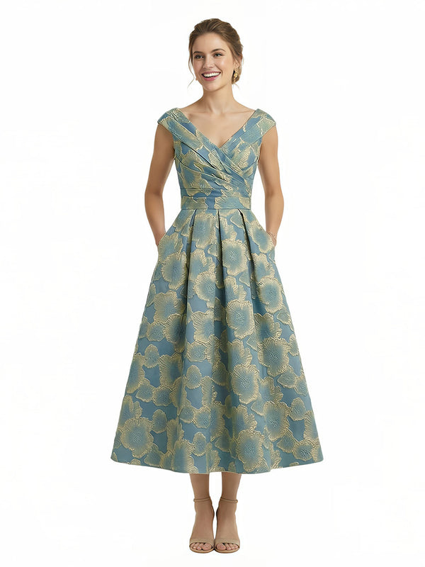 ChicSew Modern Floral Jacquard V-Neck Cap Sleeves Tea-Length A-Line Long Formal Evening Dresses
