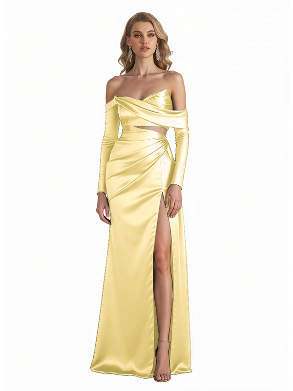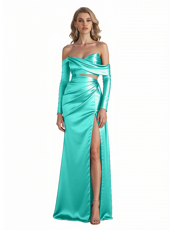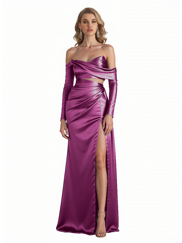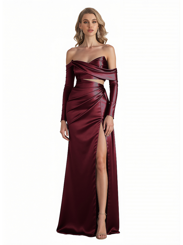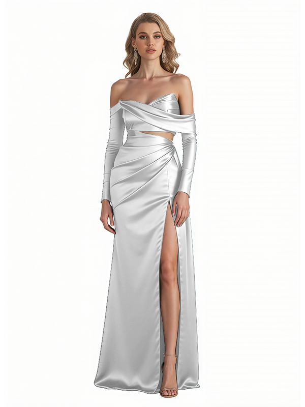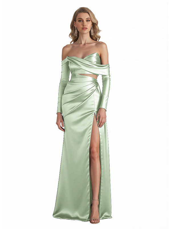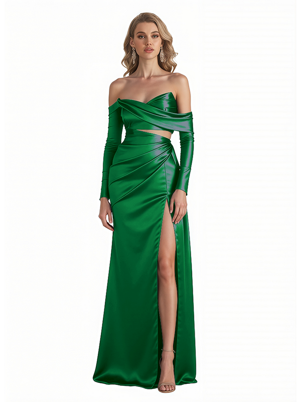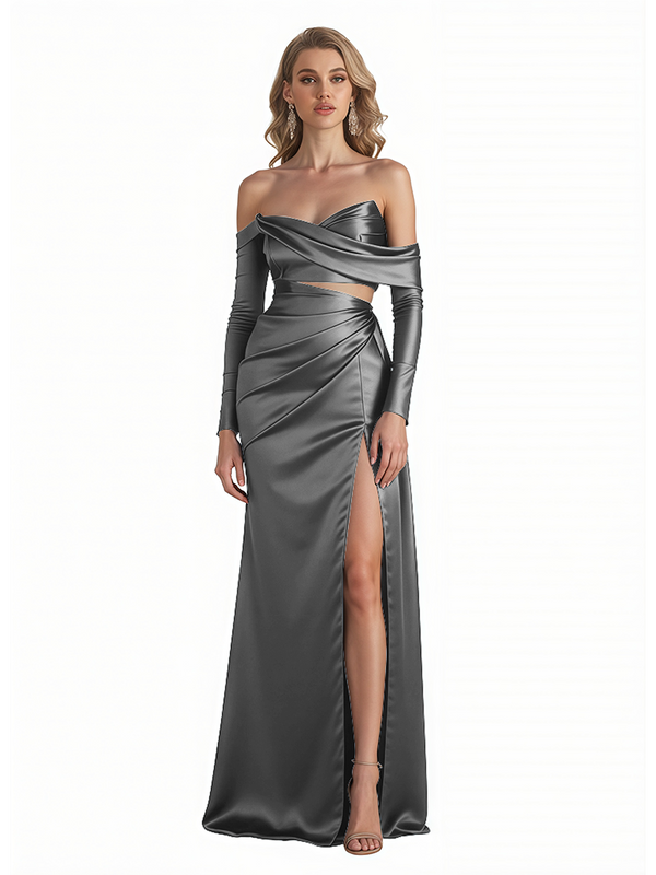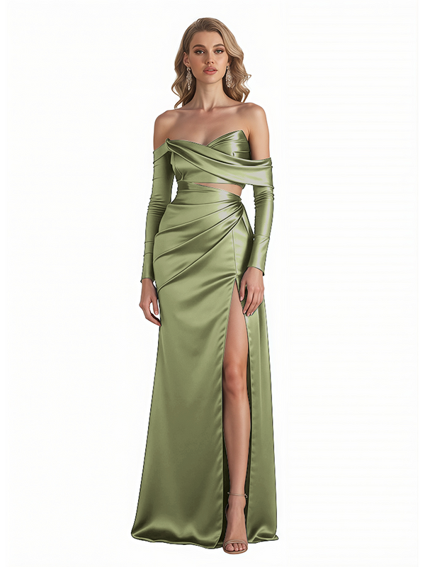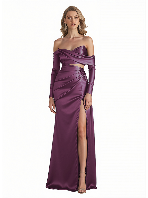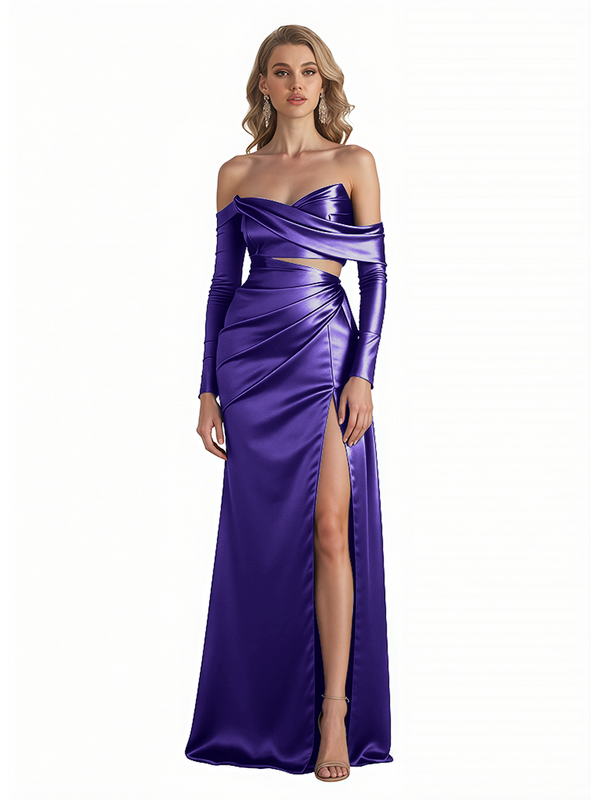 Sexy Asymmetrical Long Sleeves Silky Satin Side Slit Mermaid Long Formal Evening Dresses For Women