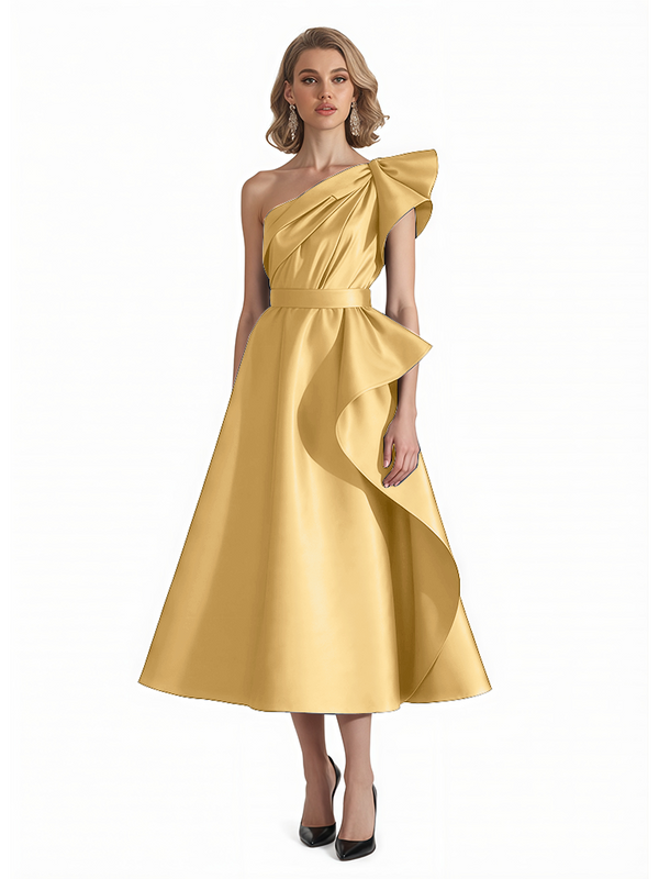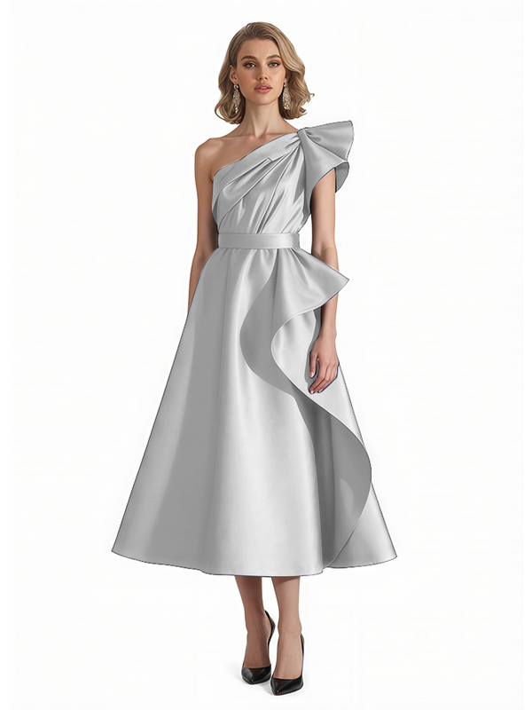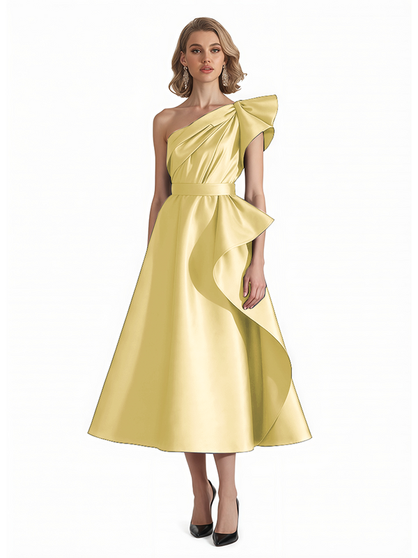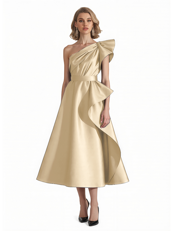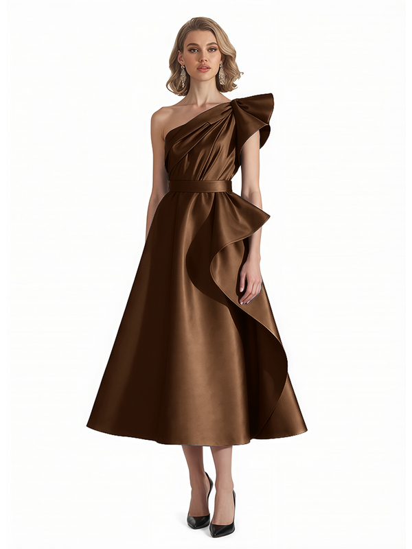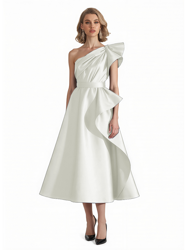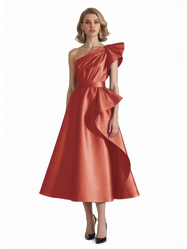 Sexy One Shoulder Silky Satin Ruffle A-Line Midi Formal Evening Gowns For Ladies