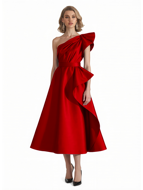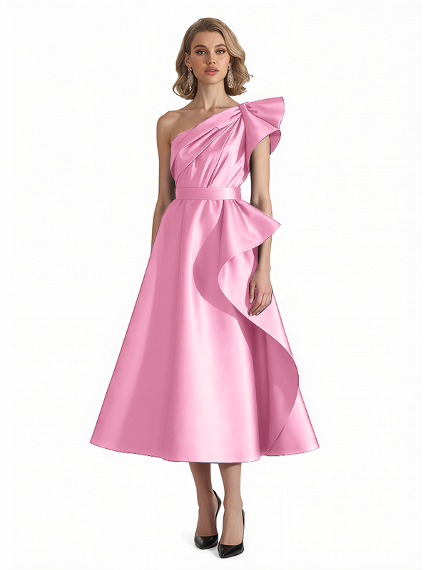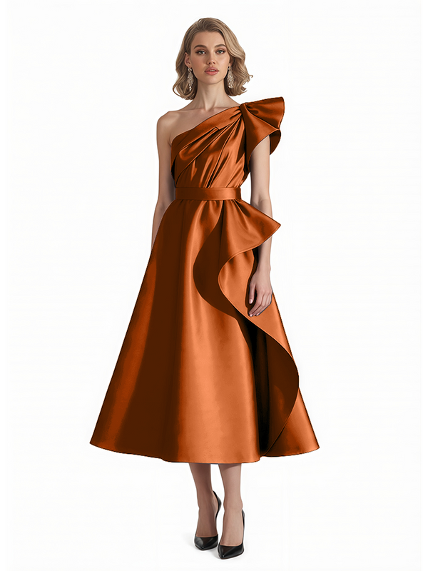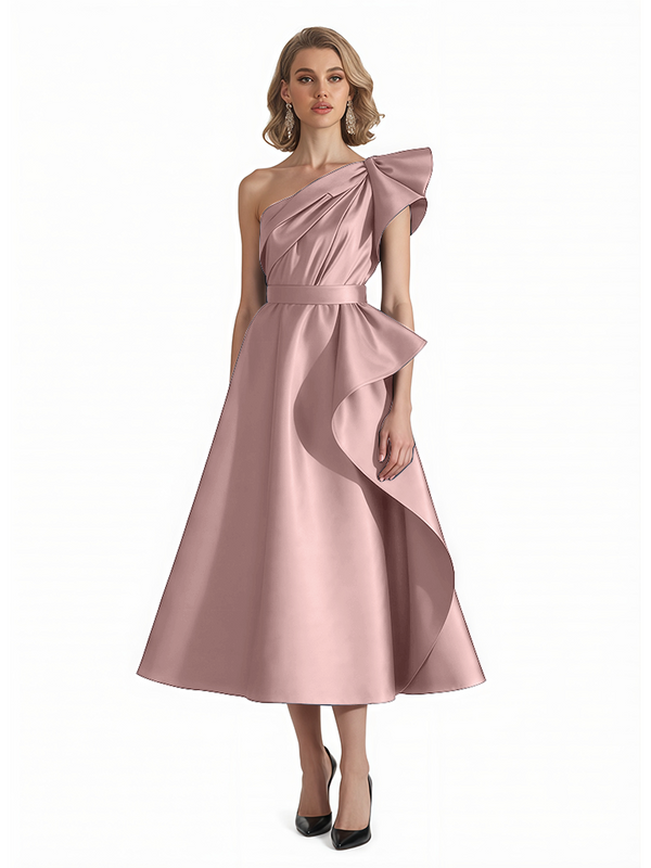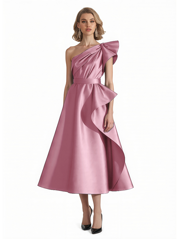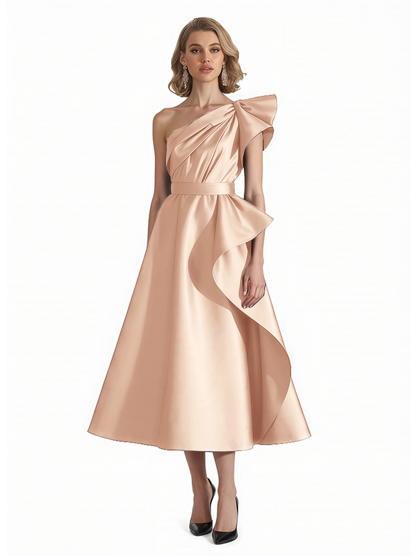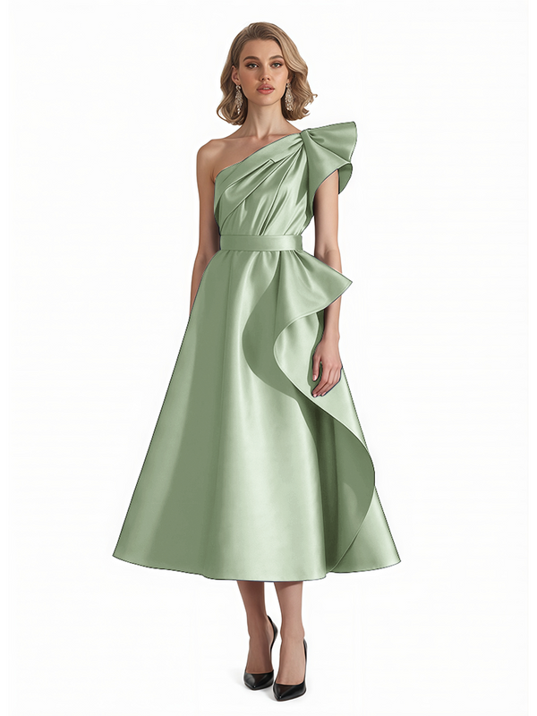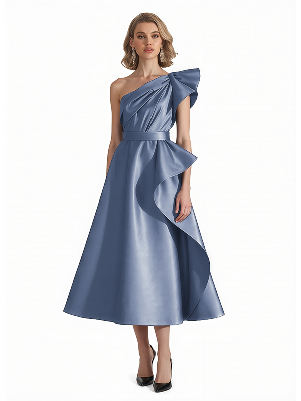 Sexy One Shoulder Silky Satin Ruffle A-Line Midi Formal Evening Gowns For Ladies