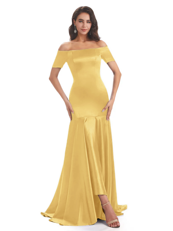 Elegant Soft Satin Mermaid Off The Shoulder High Low Satin Dresses