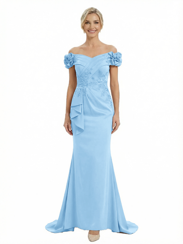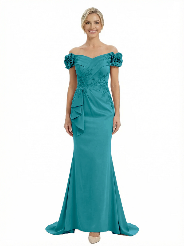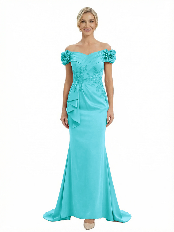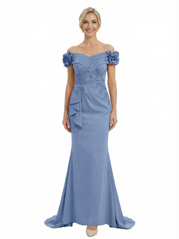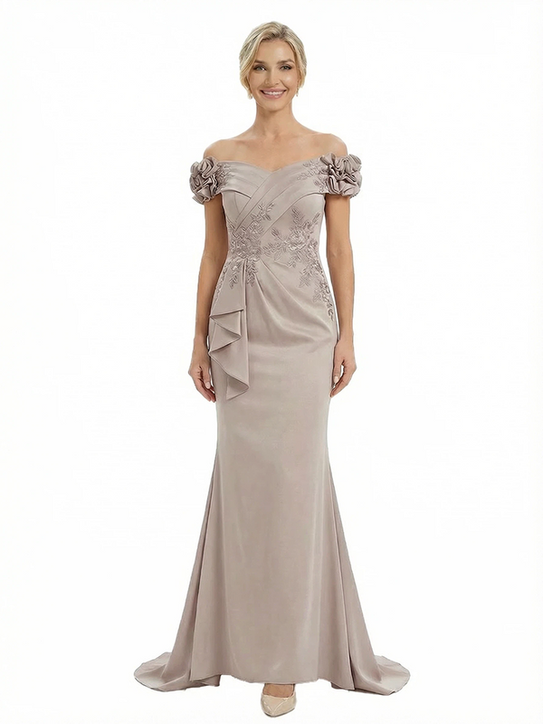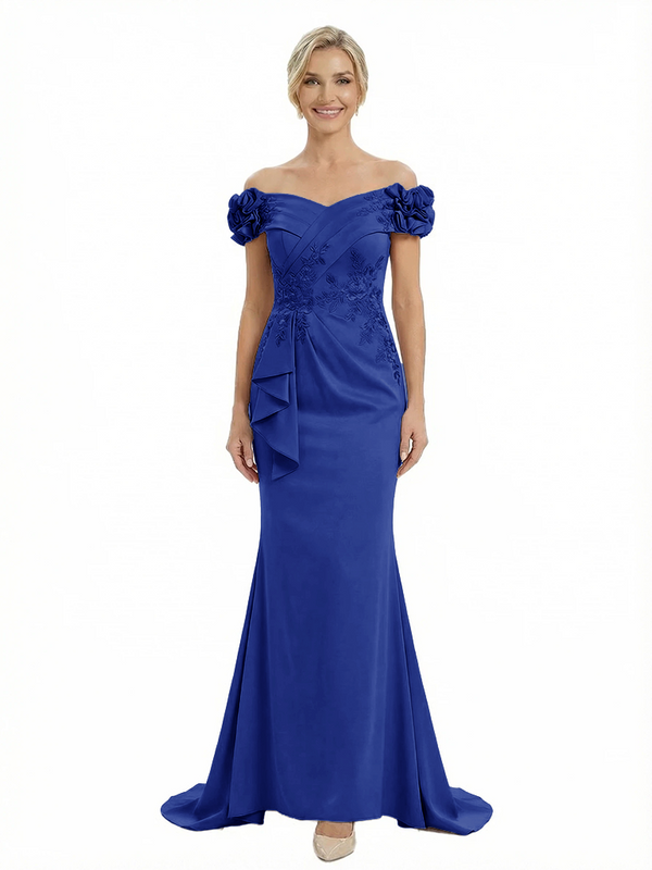 Chicsew Fancy Satin Off Shoulder Lace Appliques Ruched Mermaid Mother Of The Groom Gowns