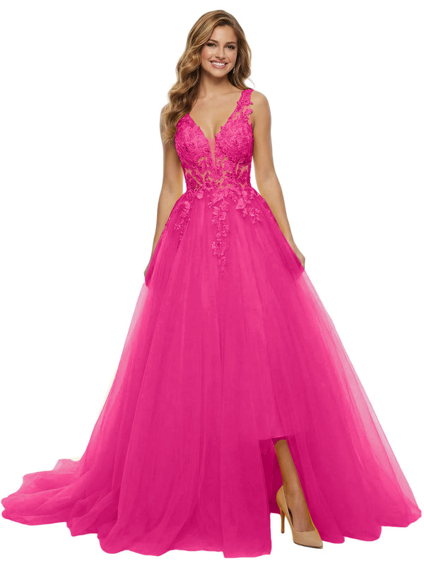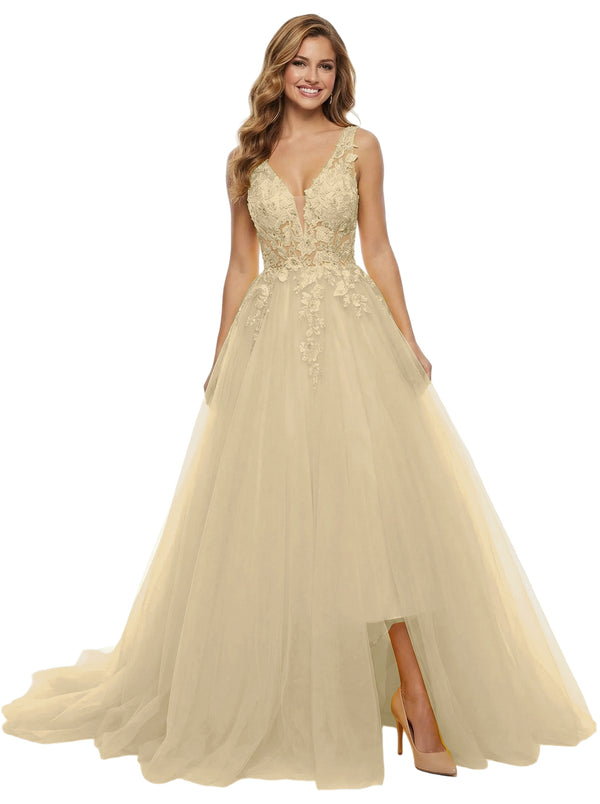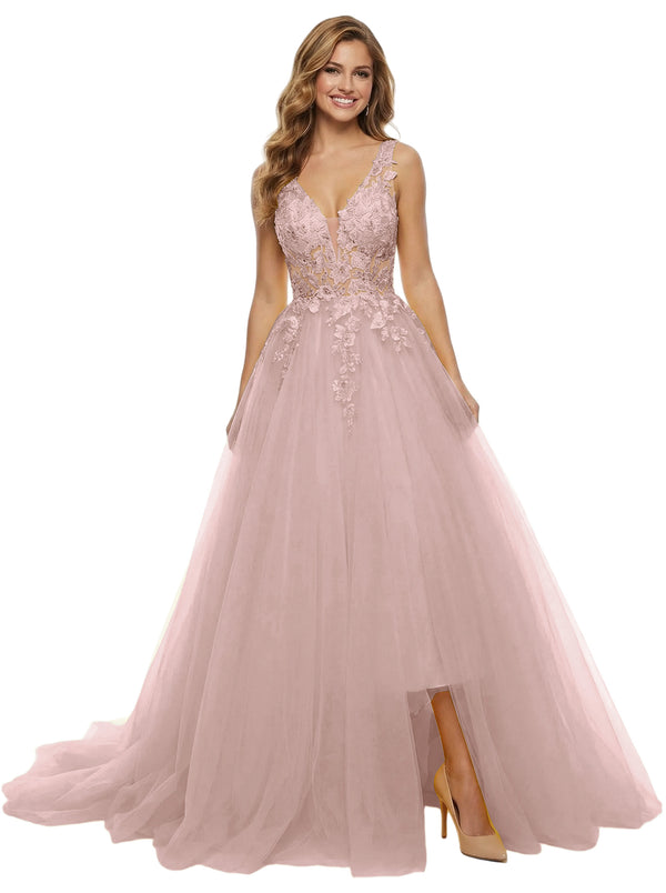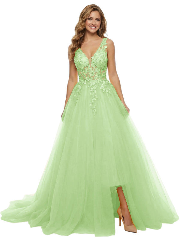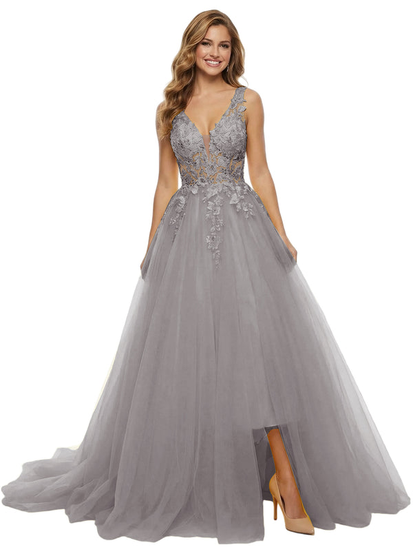 ChicSew Unique Spaghetti Straps Lace Tulle Side Slit V-Neck Maxi Evening Prom Dresses