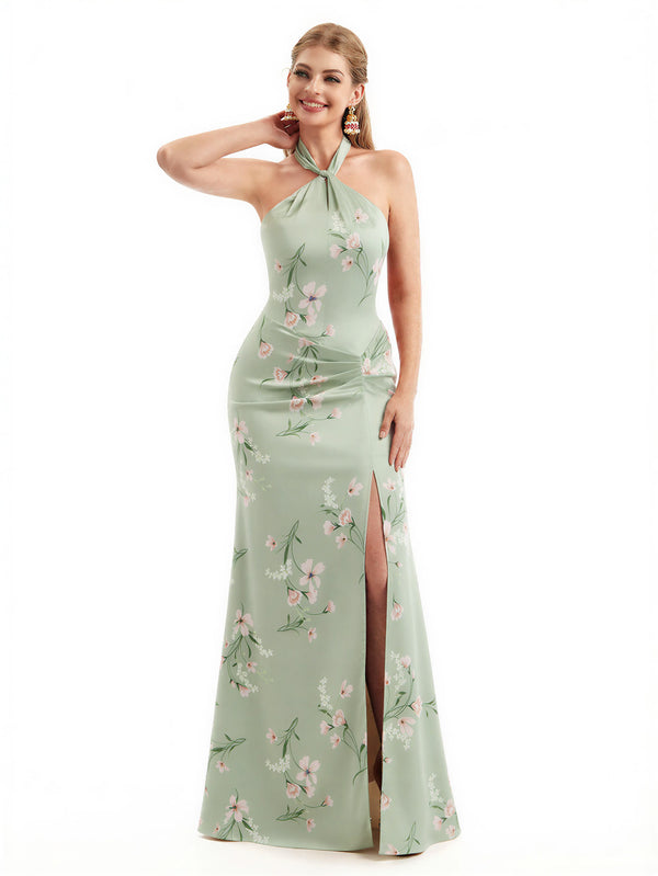 Beautiful Halter Side Slit Mermaid Floral Satin Maxi Floral Formal Dresses For Women