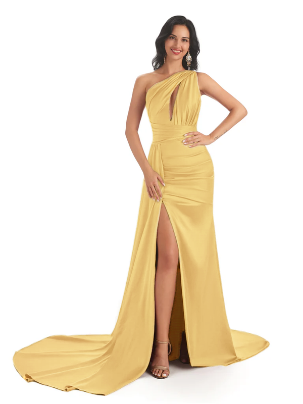 Sexy Soft Satin Side Slit One Shoulder Pleats Floor-Length Mermaid Bridesmaid Dresses - ChicSew – ChicSew