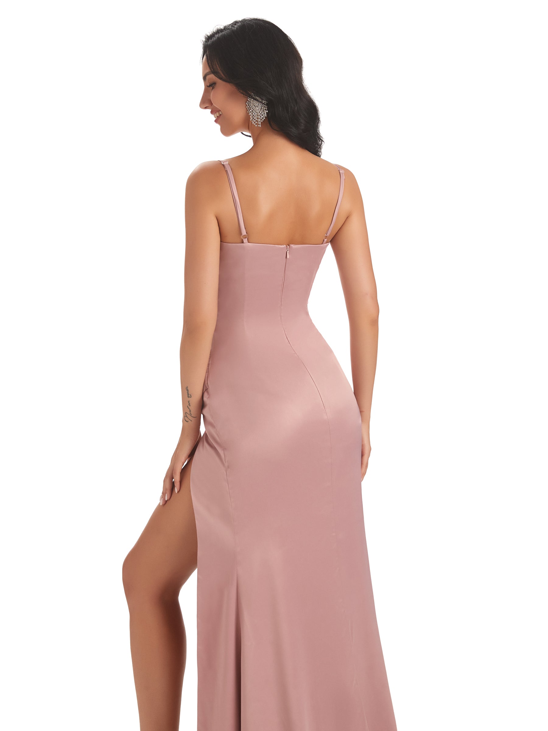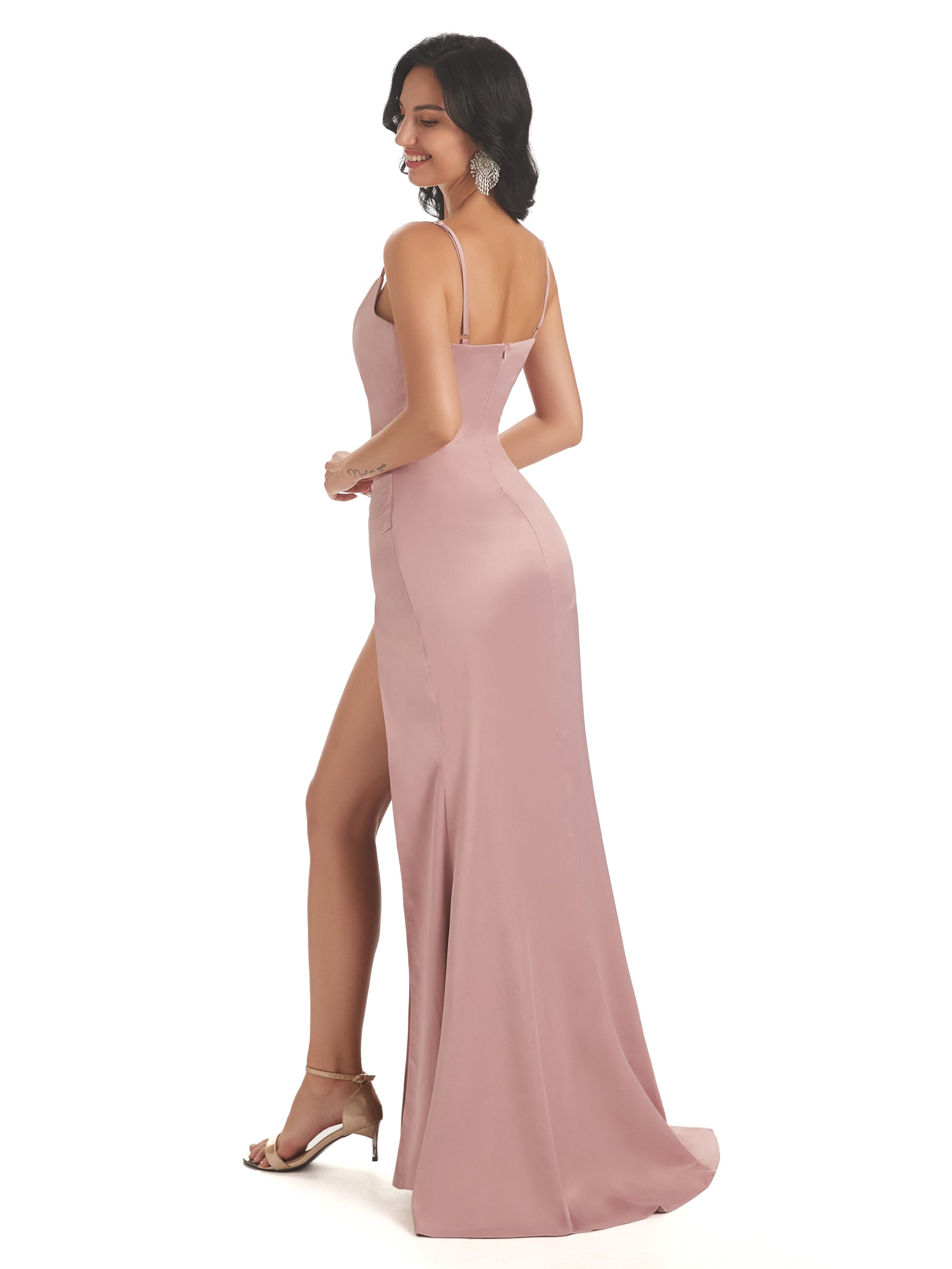 Spaghetti Straps Cowl Neck Satin Mermaid Side Slit Maxi Bridesmaid Dresses Online