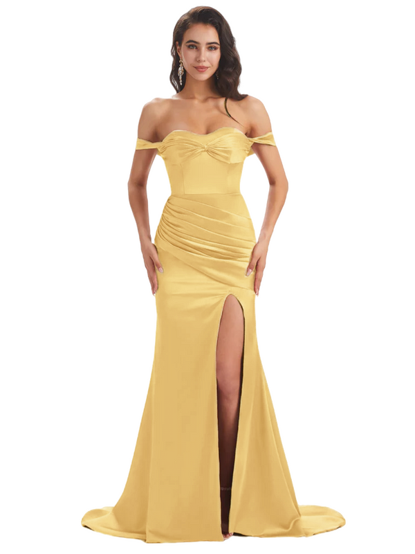 Sexy Side Slit Unique Off The Shoulder Mermaid Satin Long Bridesmaid Dresses