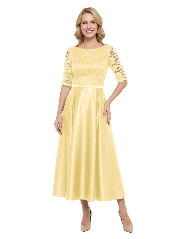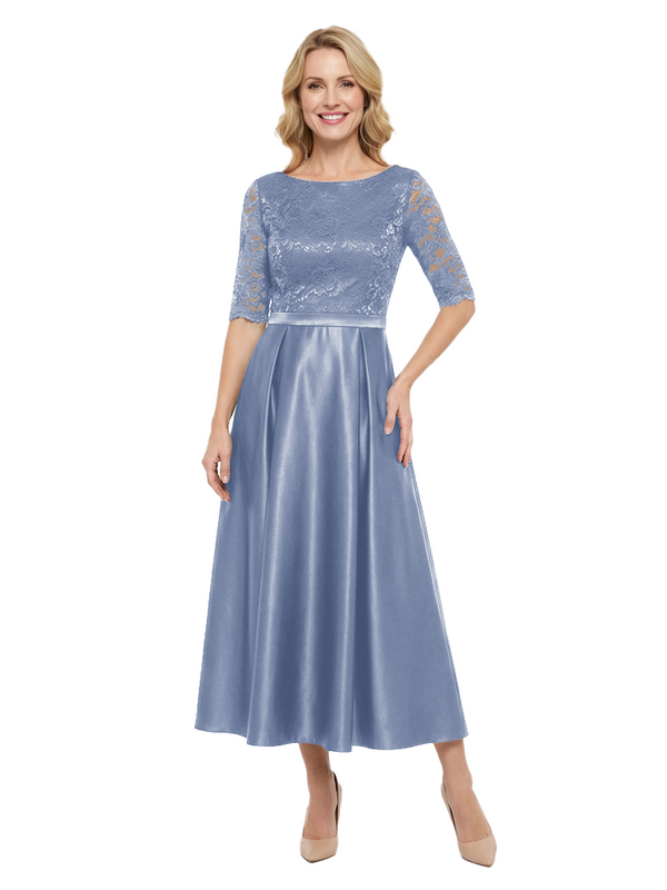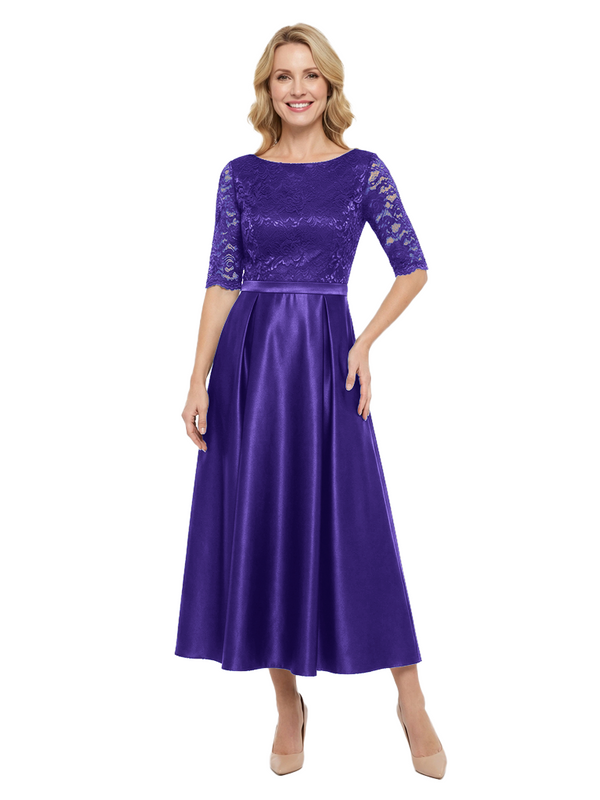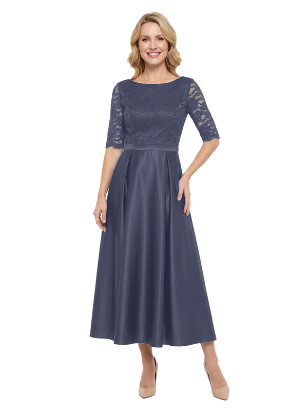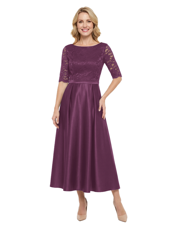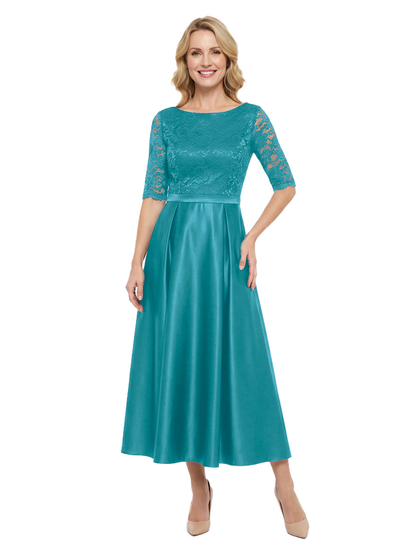 Chicsew Elegant Boat Neck Lace 3/4 Sleeves Satin Ankle-Length A-Line Mother Of The Bride Dress