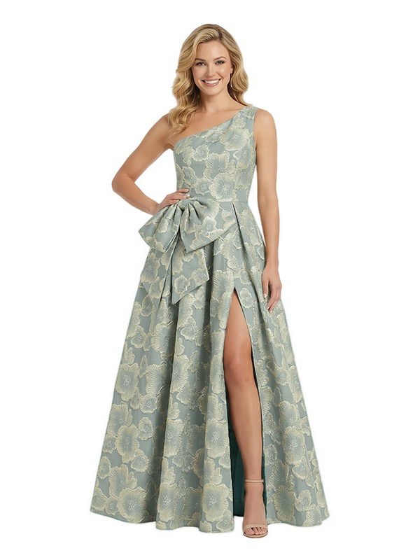 ChicSew Elegant Floral Jacquard One Shoulder Side Slit Bow Knot Long Formal Evening Dresses