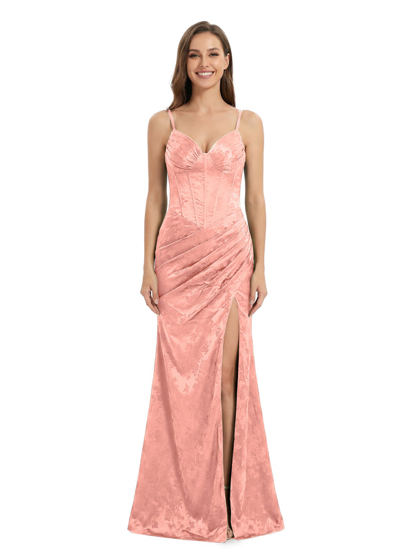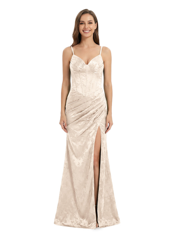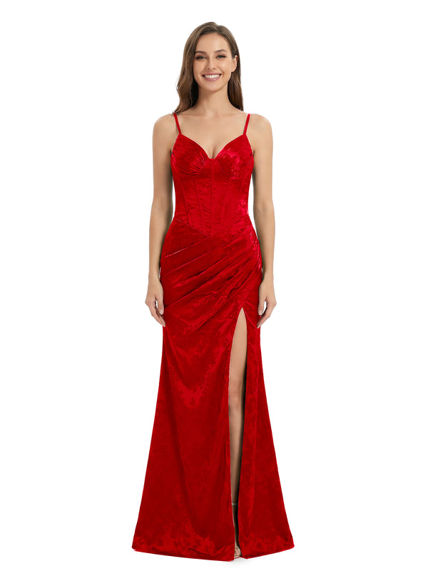ChicSew Elegant Ruched Jacquard Satin Spaghetti Straps Side Slit Mermaid Long Formal Evening Dresses