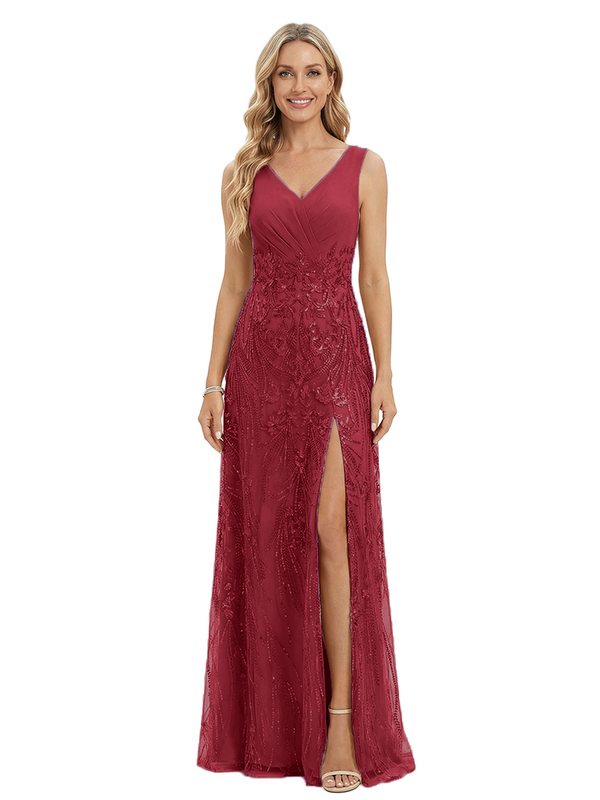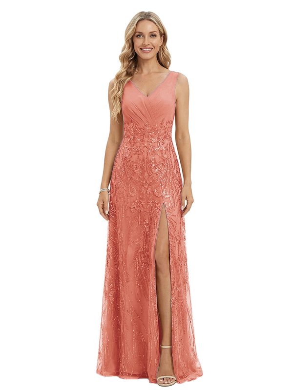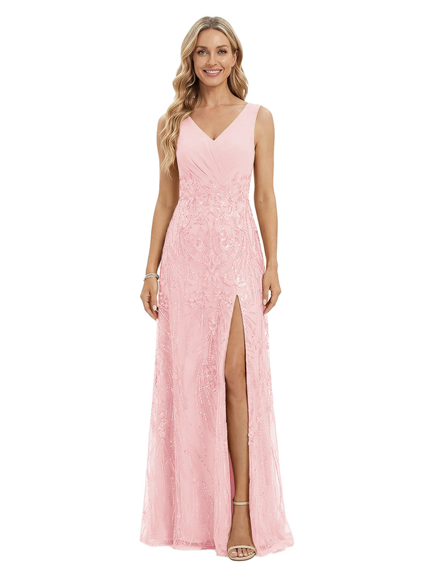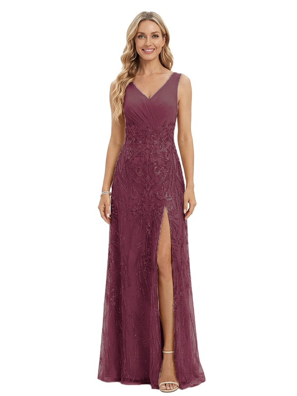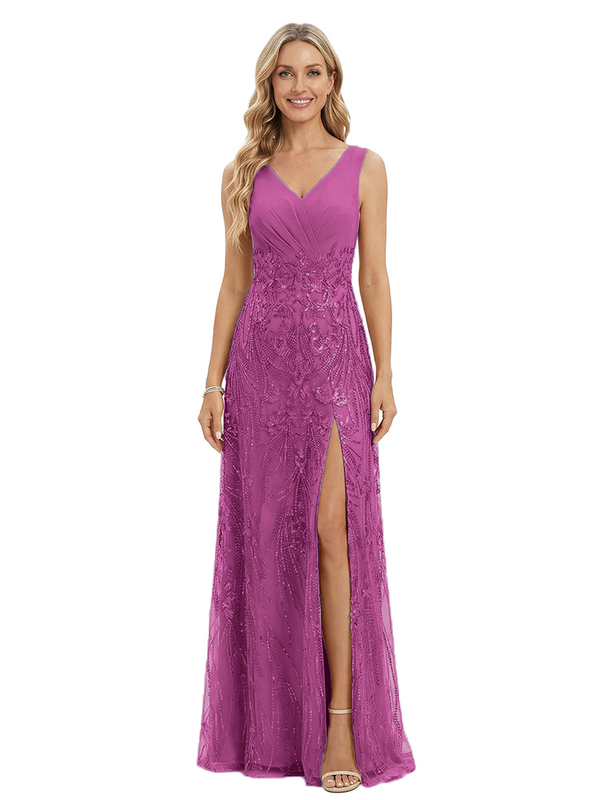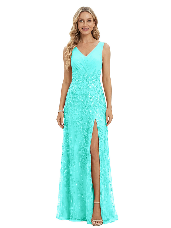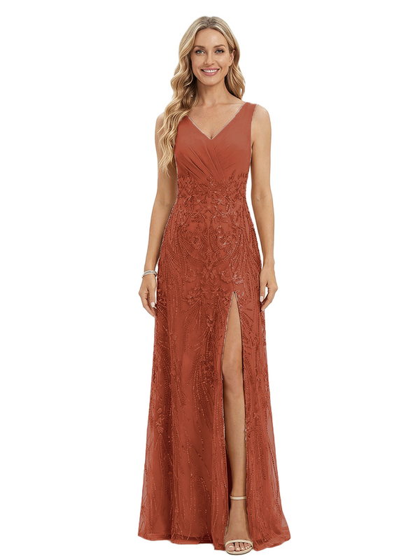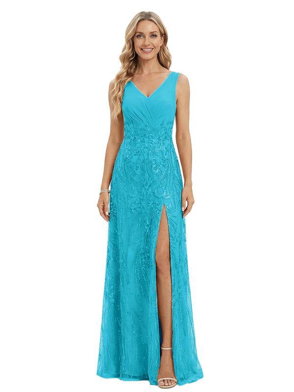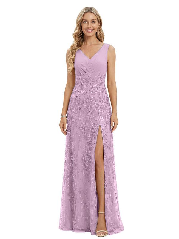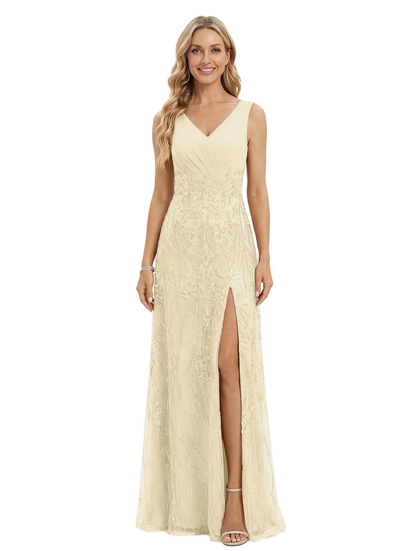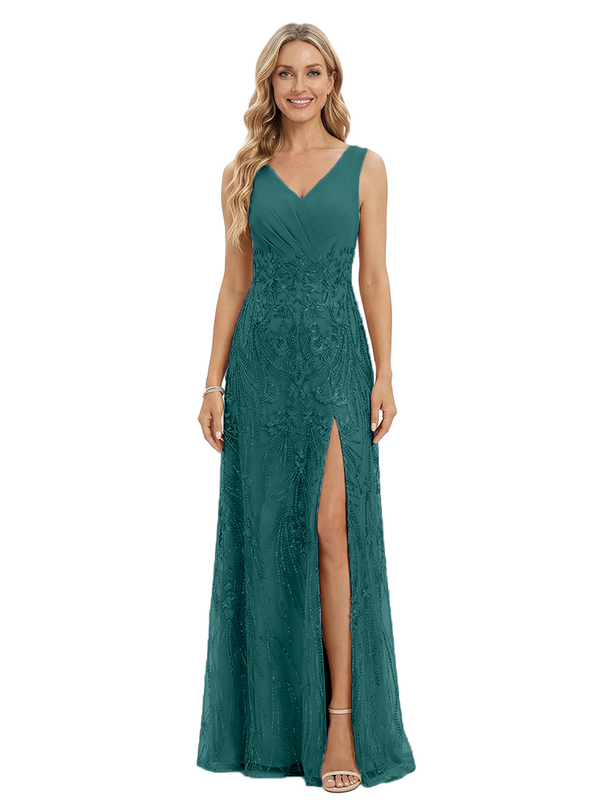ChicSew Elegant V-Neck Spaghetti Straps A-Line Side Slit Mother Of The Bride Gown Lace Tulle Overlay - ChicSew – ChicSew