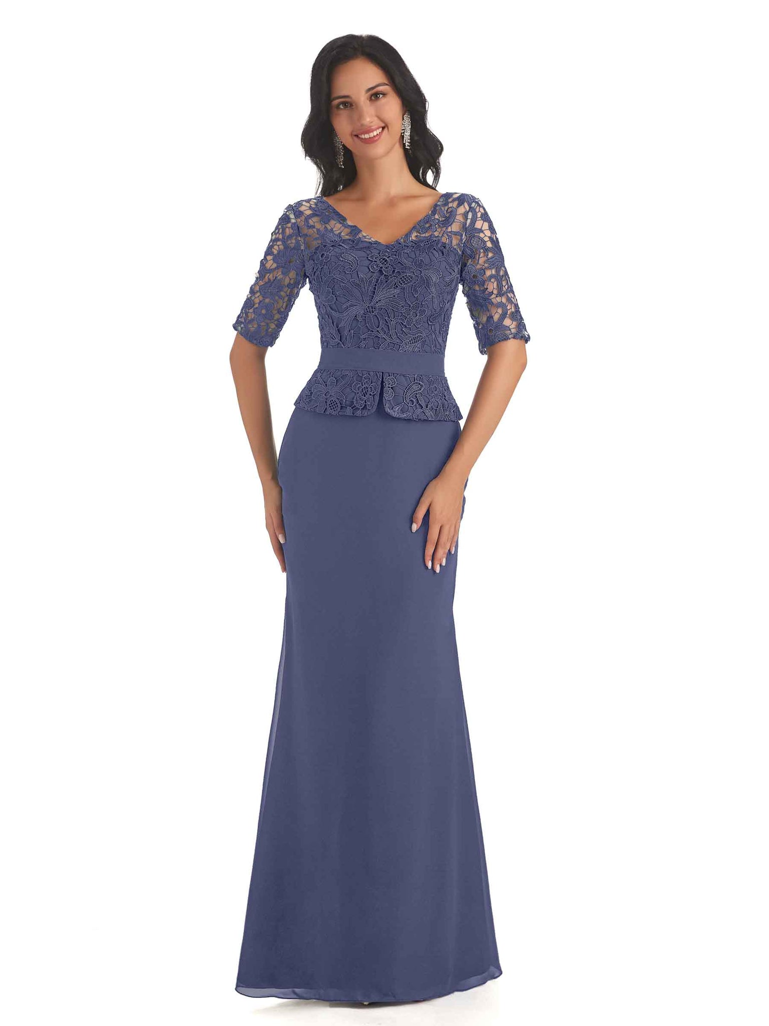 Elegant Lace Short Sleeves Chiffon V-neck Floor-length Mother of The Bride DressesElegant Lace Short Sleeves Chiffon V-neck Floor-length Mother of The Bride Dresses