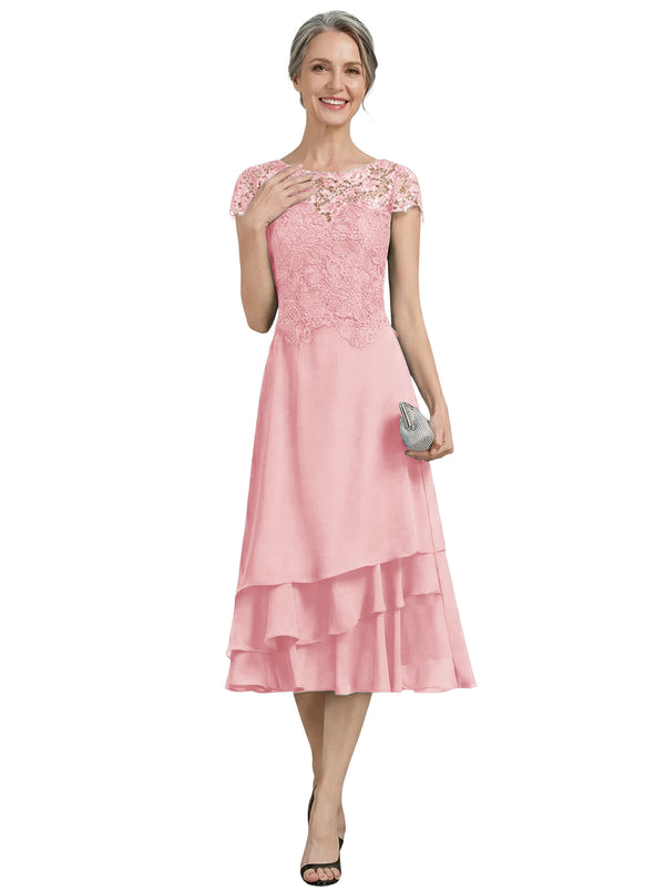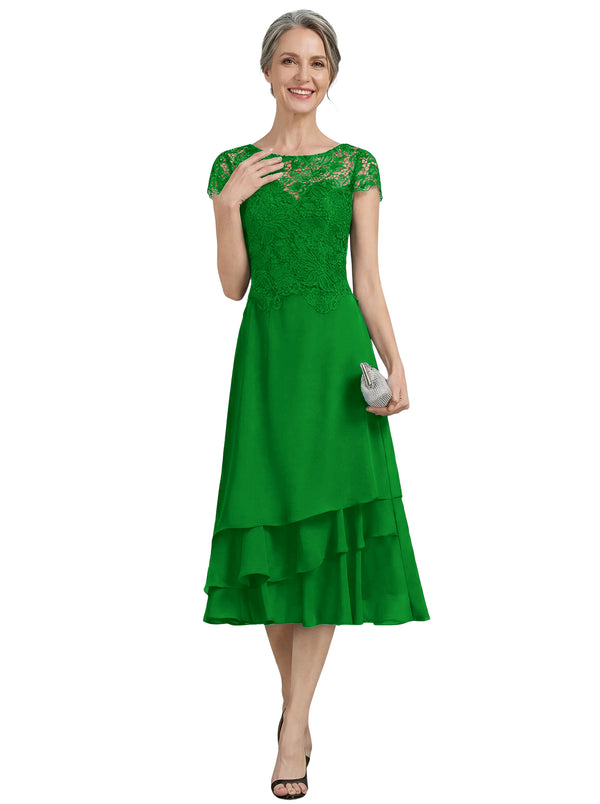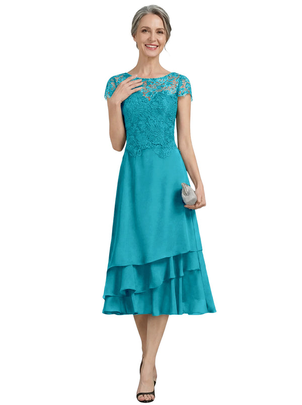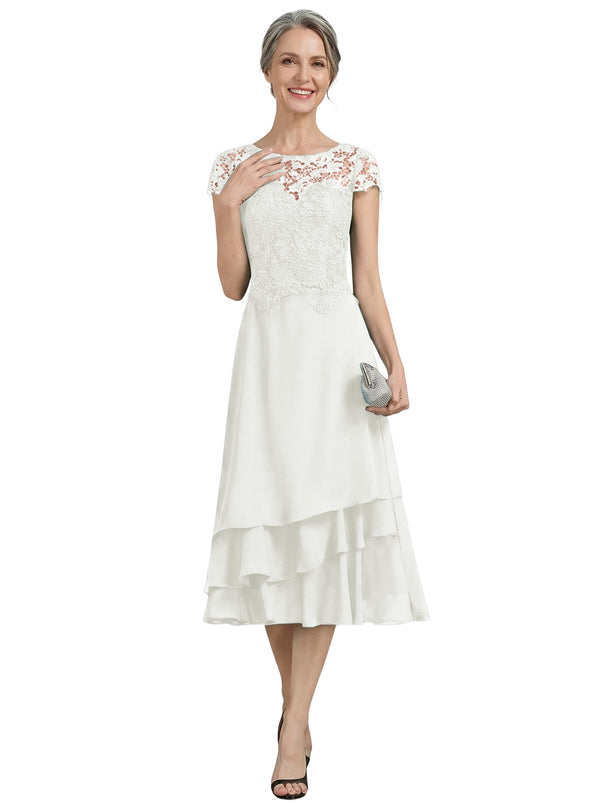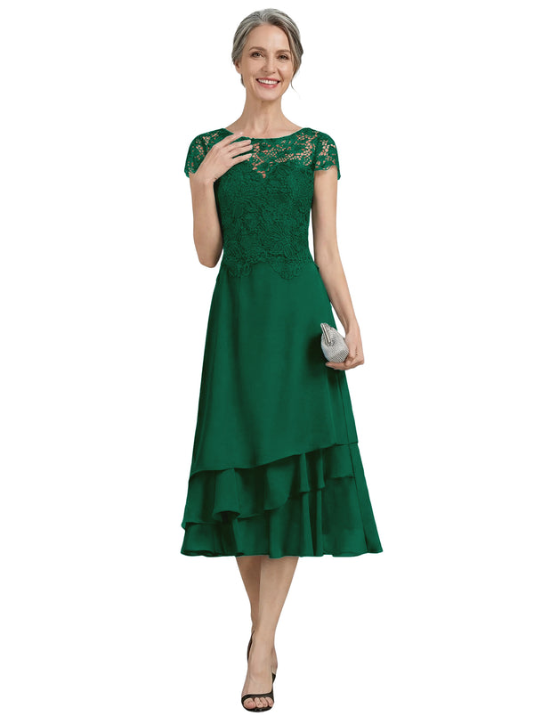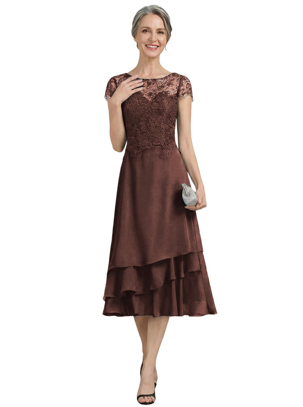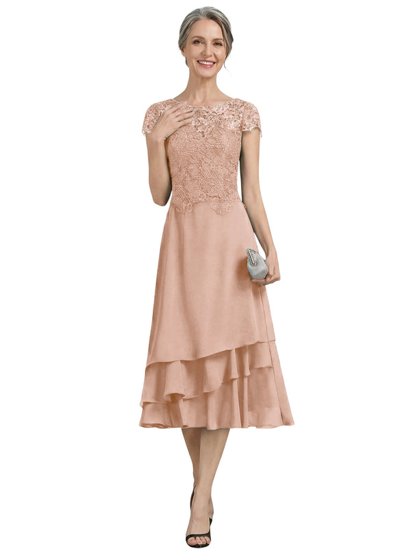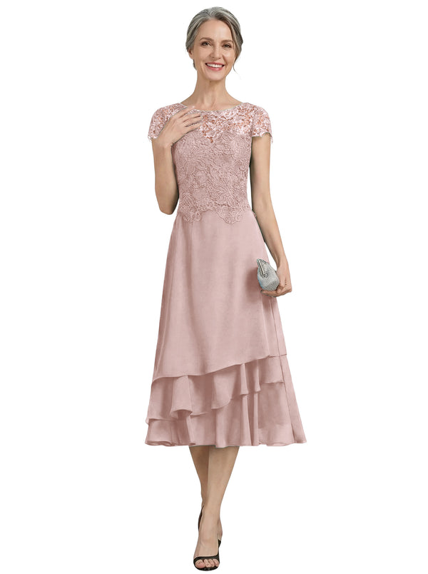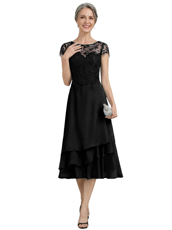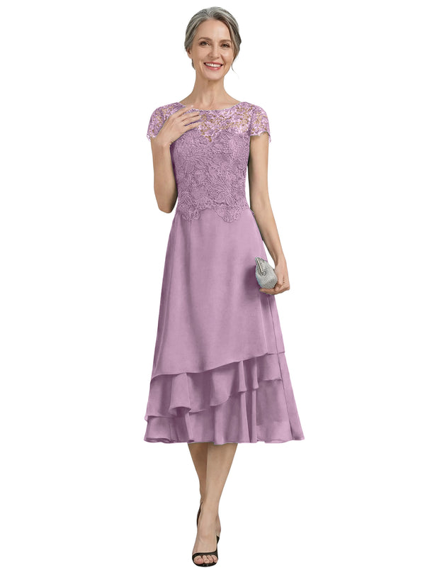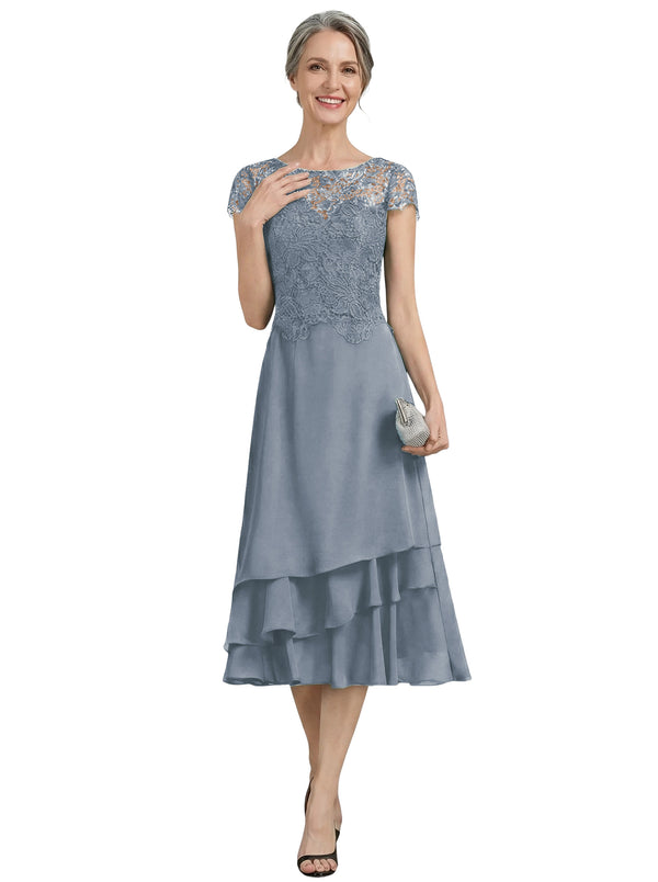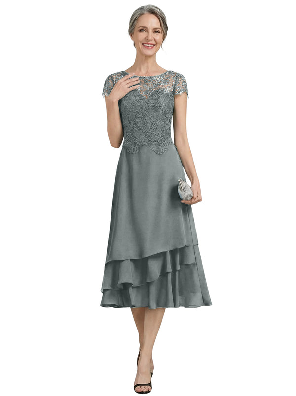 ChicSew Illusion Short Sleeve Lace Overlay Layered Ruffle Chiffon Tea Length Casual Mother Of The Bride And Groom Dresses - ChicSew – ChicSew
