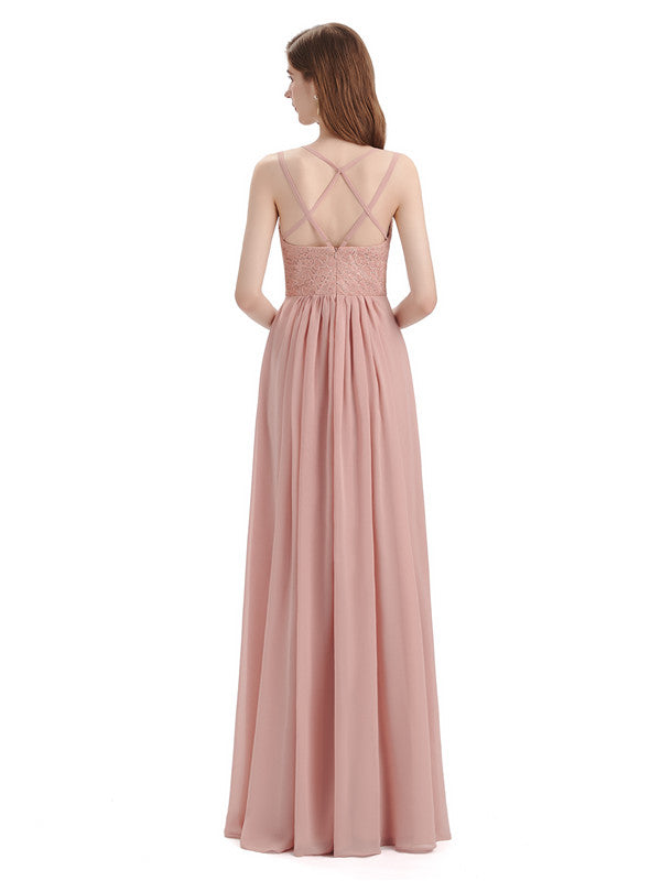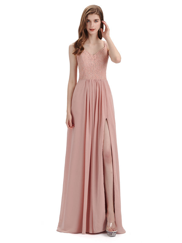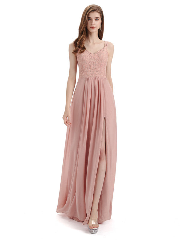Simple V-neck Chiffon Floor-Length Side Slit Long Bridesmaid Dresses