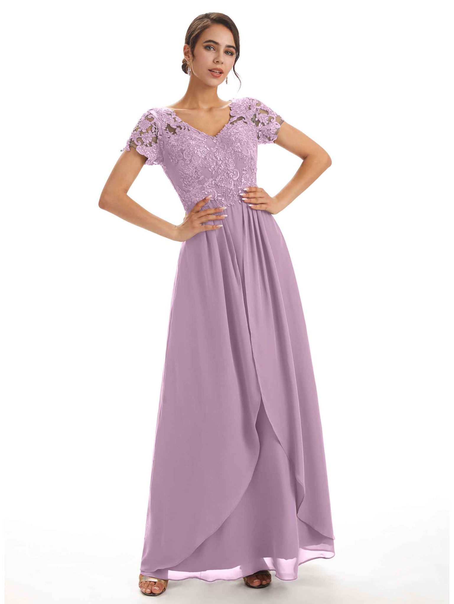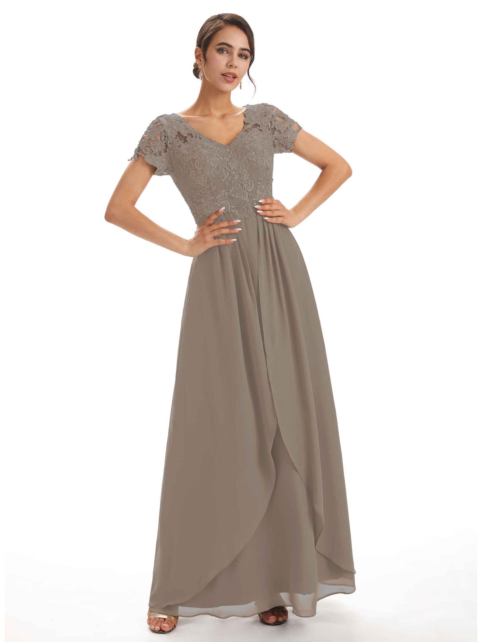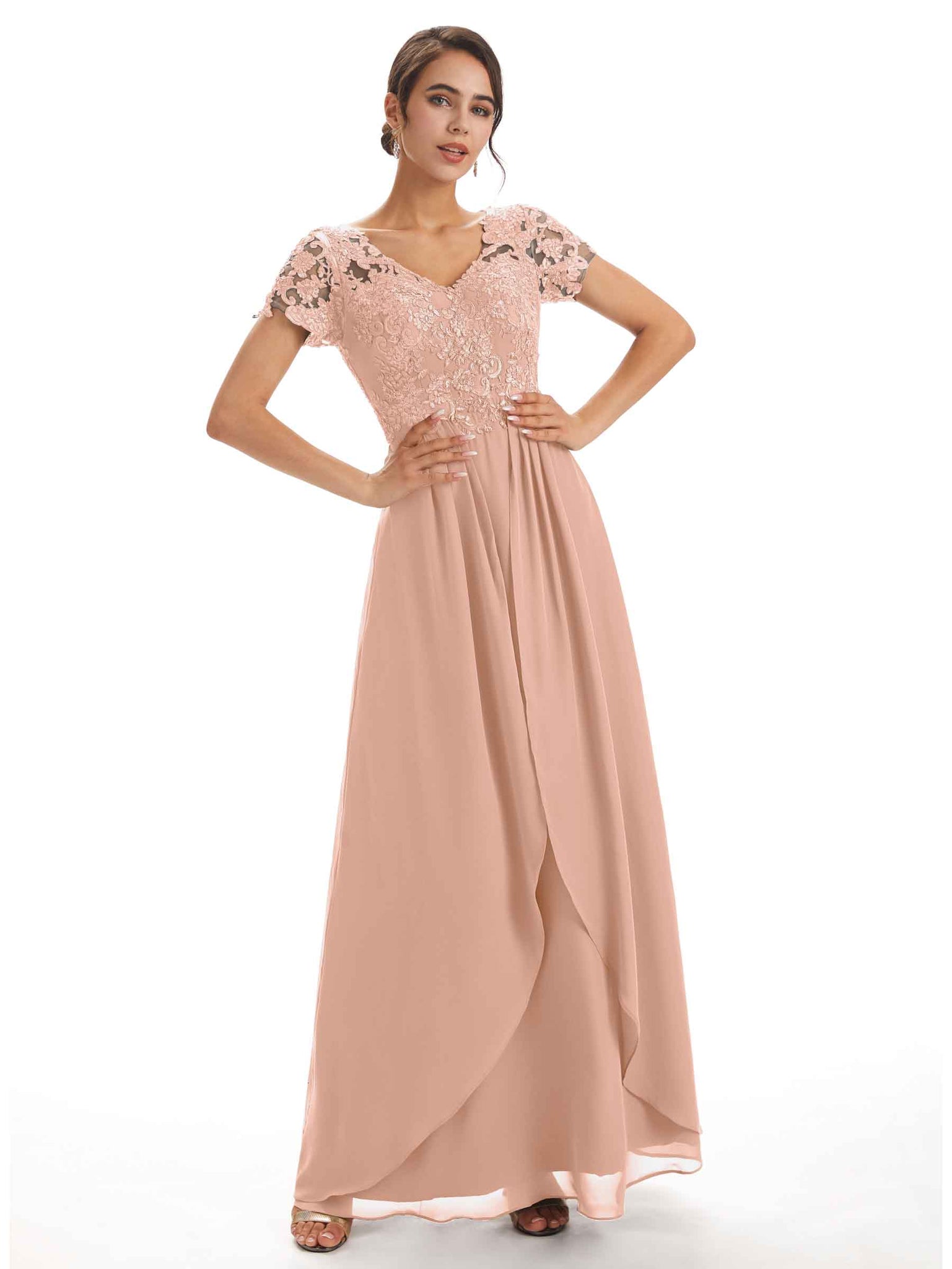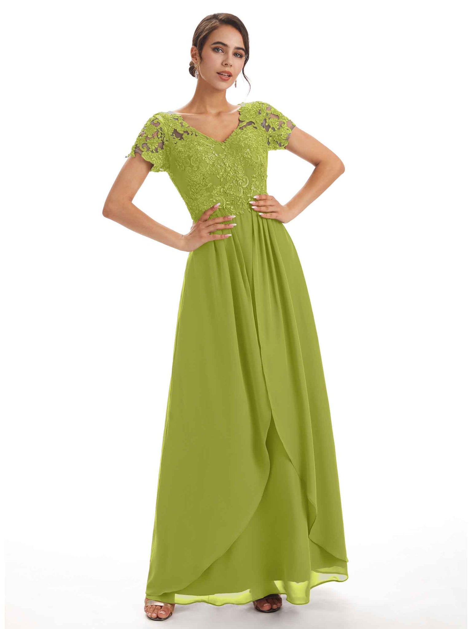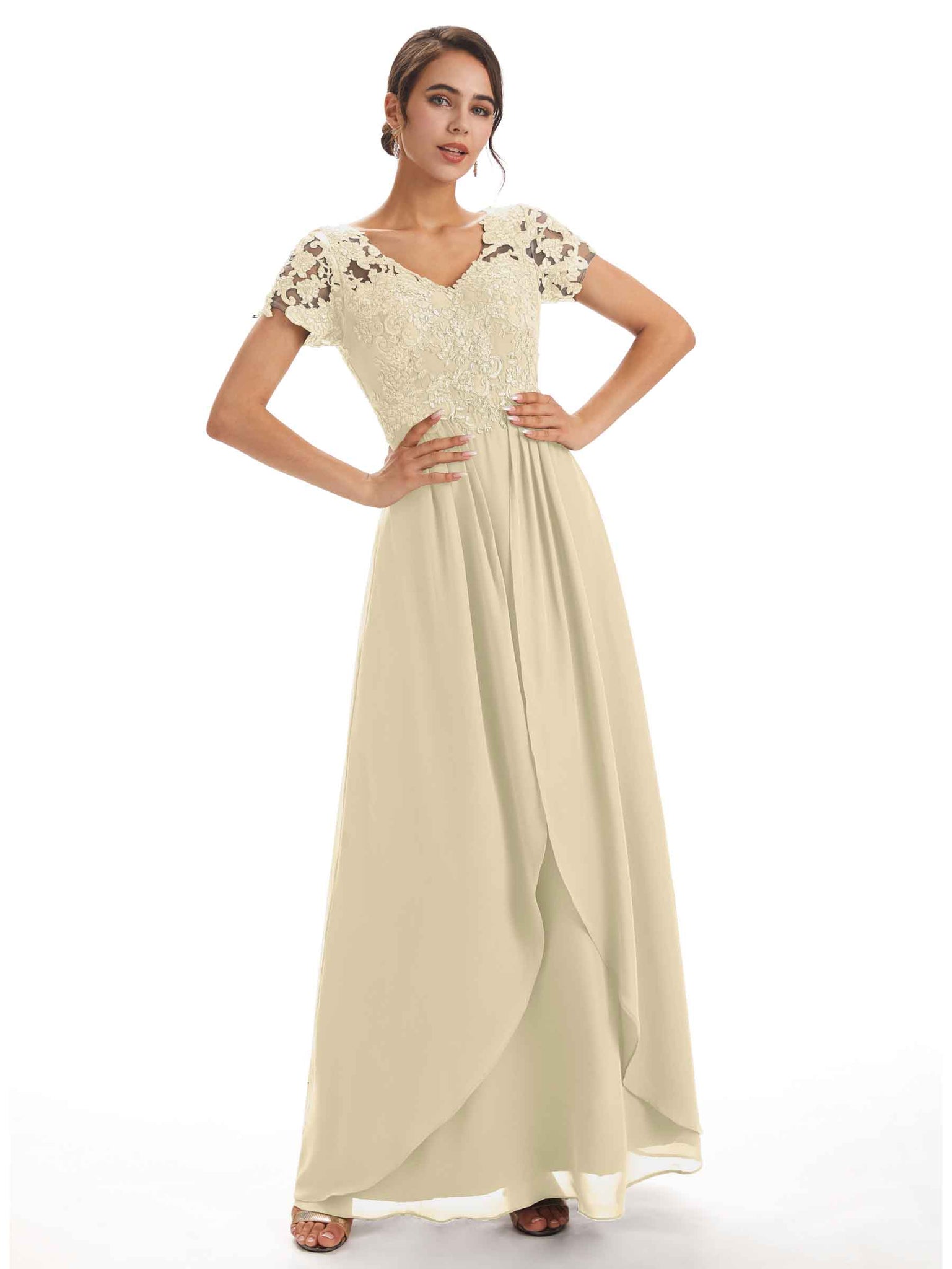 Elegant Lace Short Sleeves Chiffon V-neck Floor-length Mother of The Bride DressesElegant Lace Short Sleeves Chiffon V-neck Floor-length Mother of The Bride Dresses