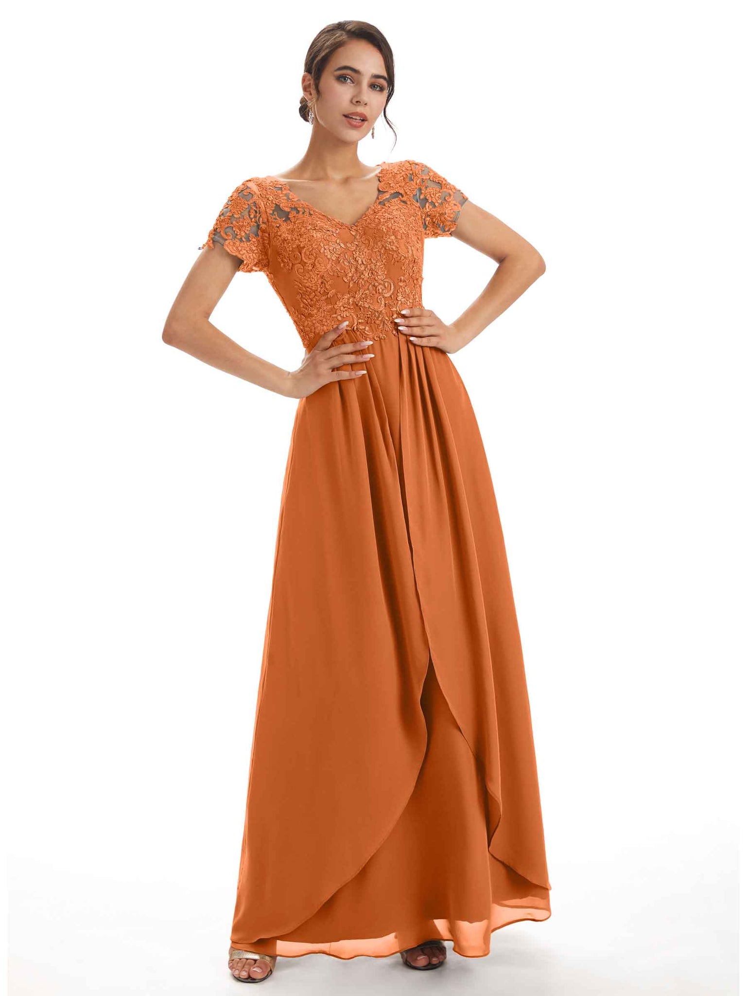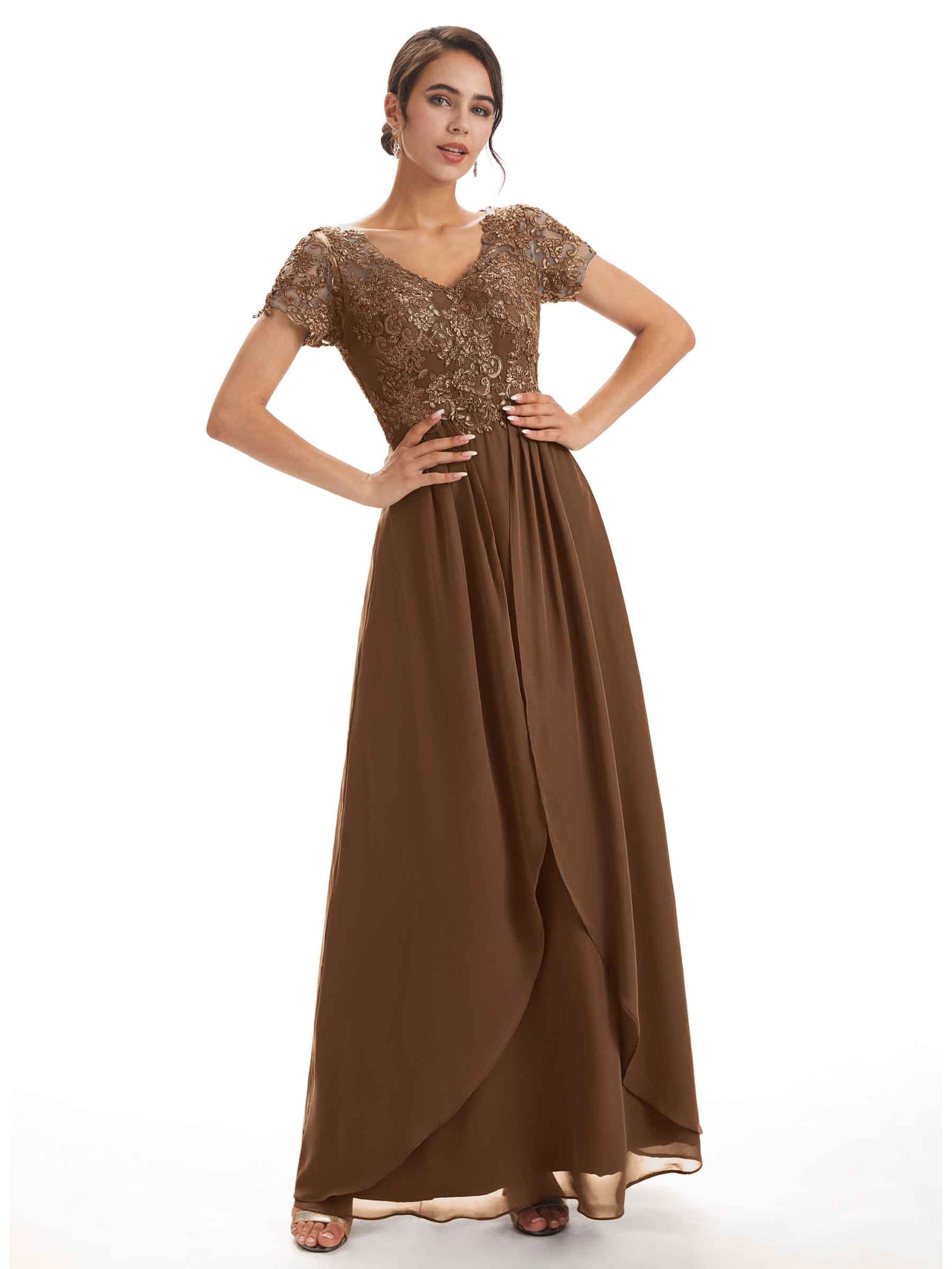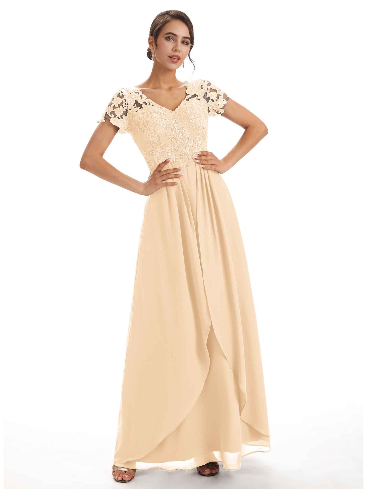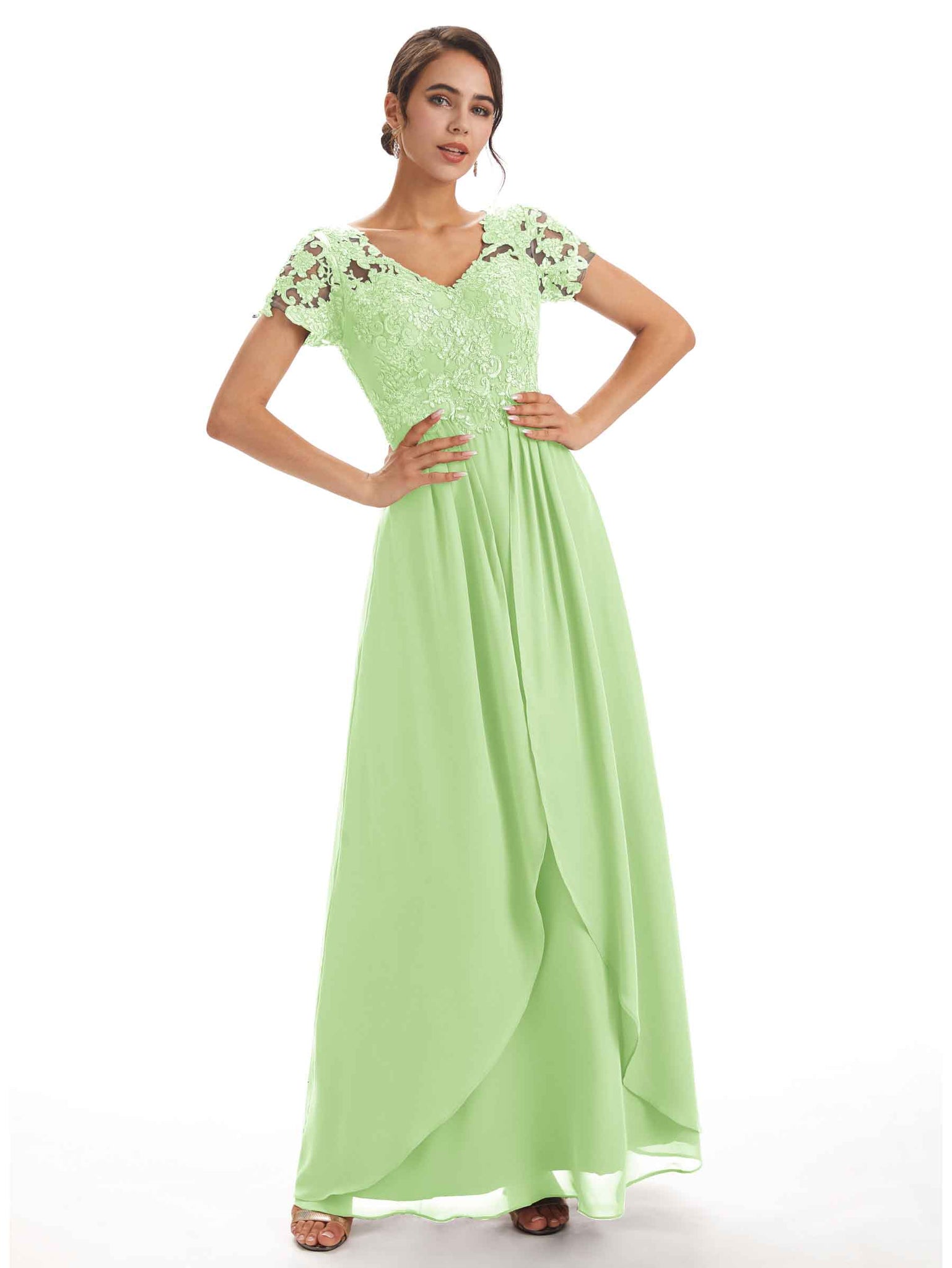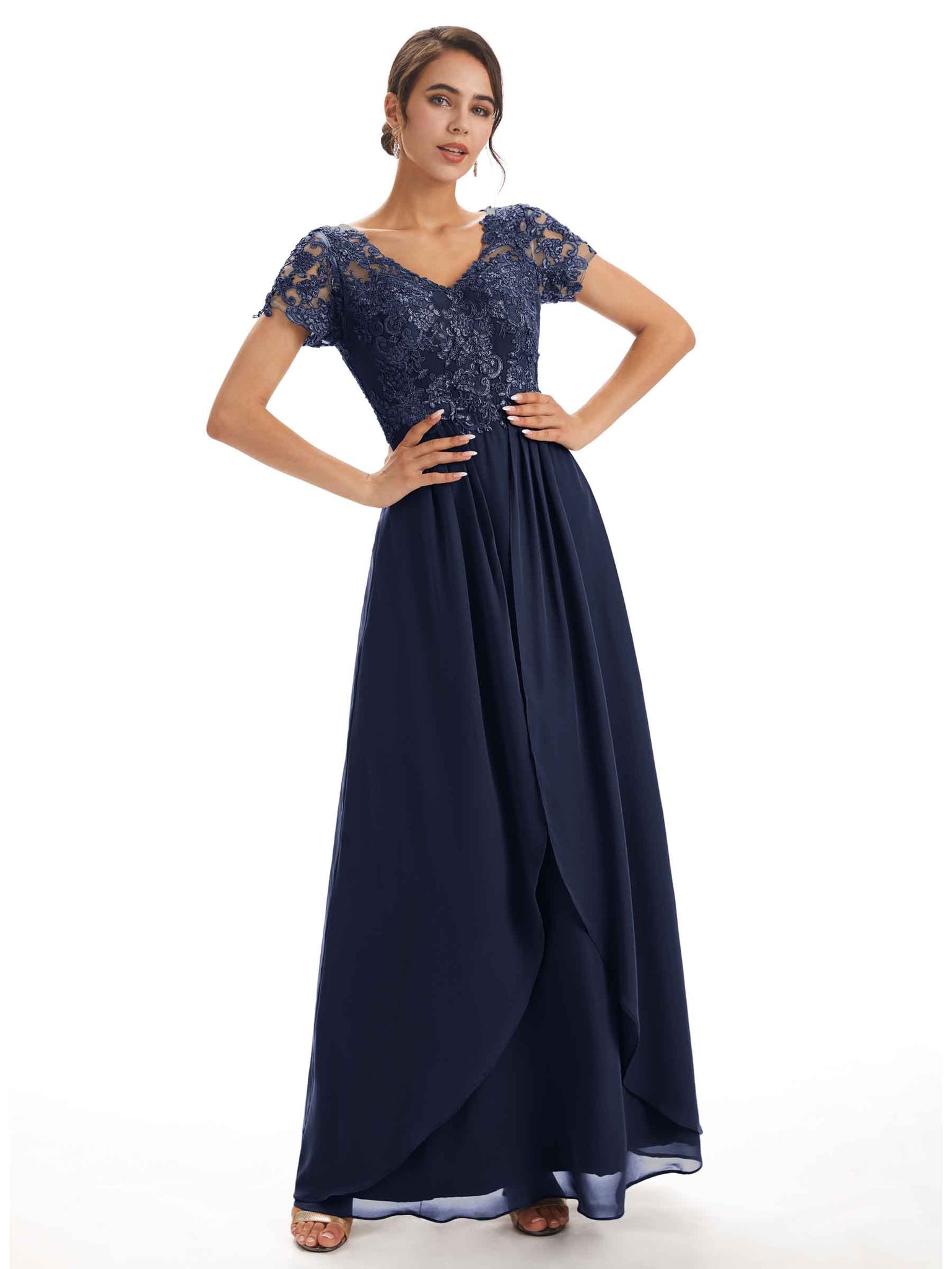 Elegant Lace Short Sleeves Chiffon V-neck Floor-length Mother of The Bride DressesElegant Lace Short Sleeves Chiffon V-neck Floor-length Mother of The Bride Dresses