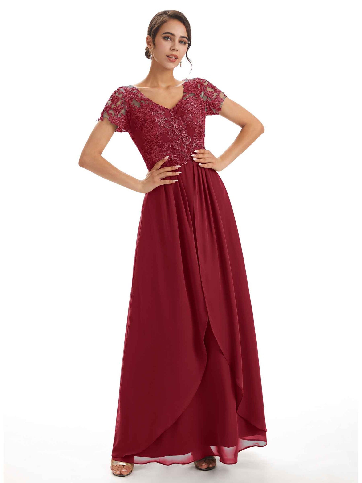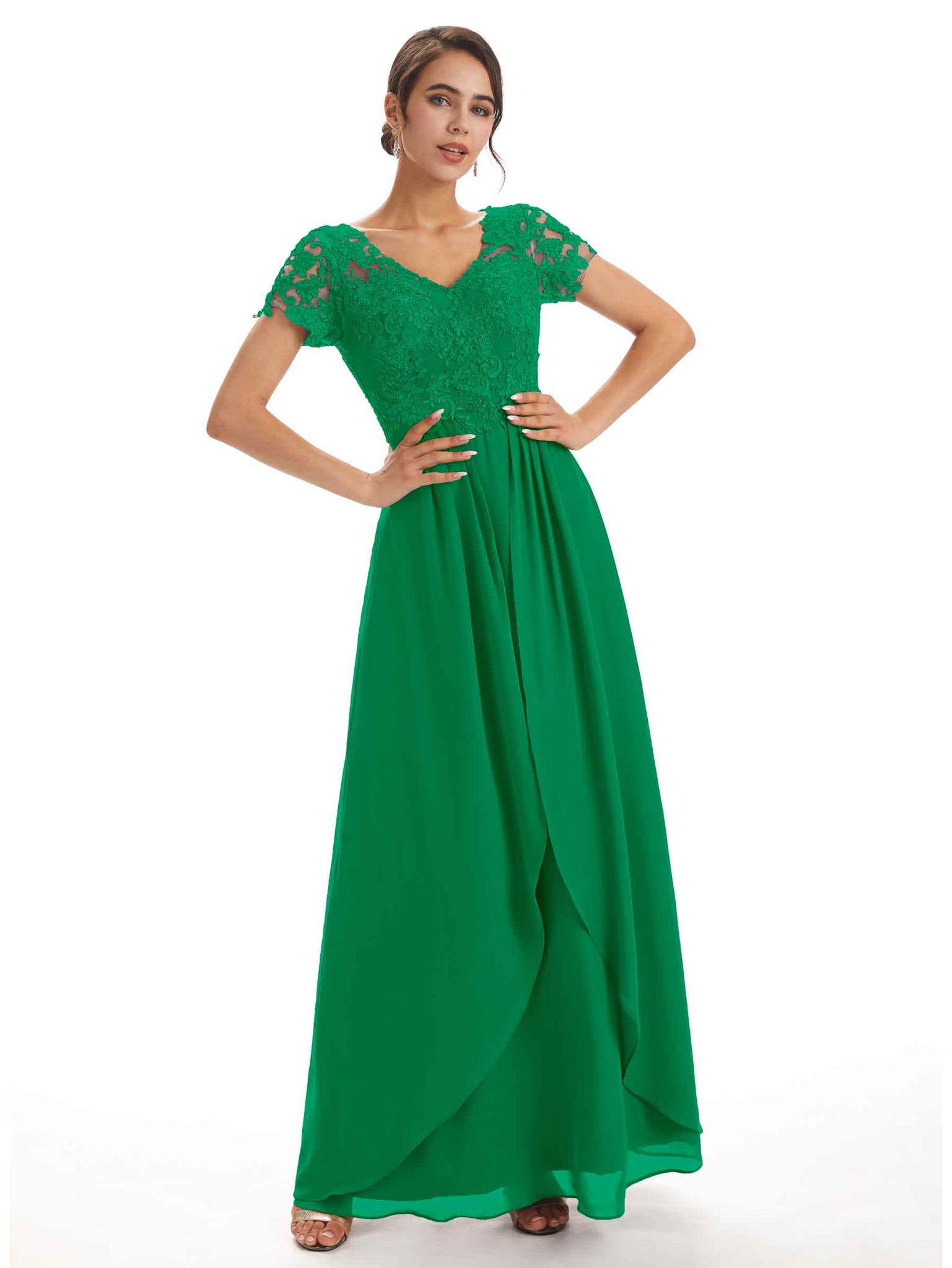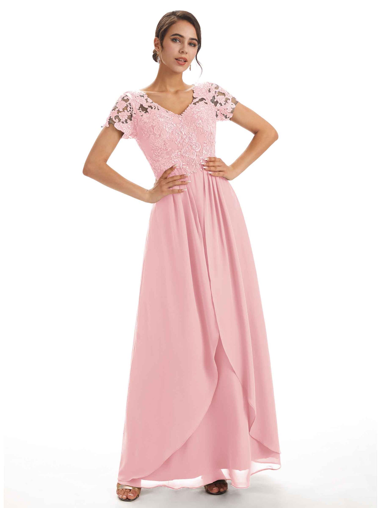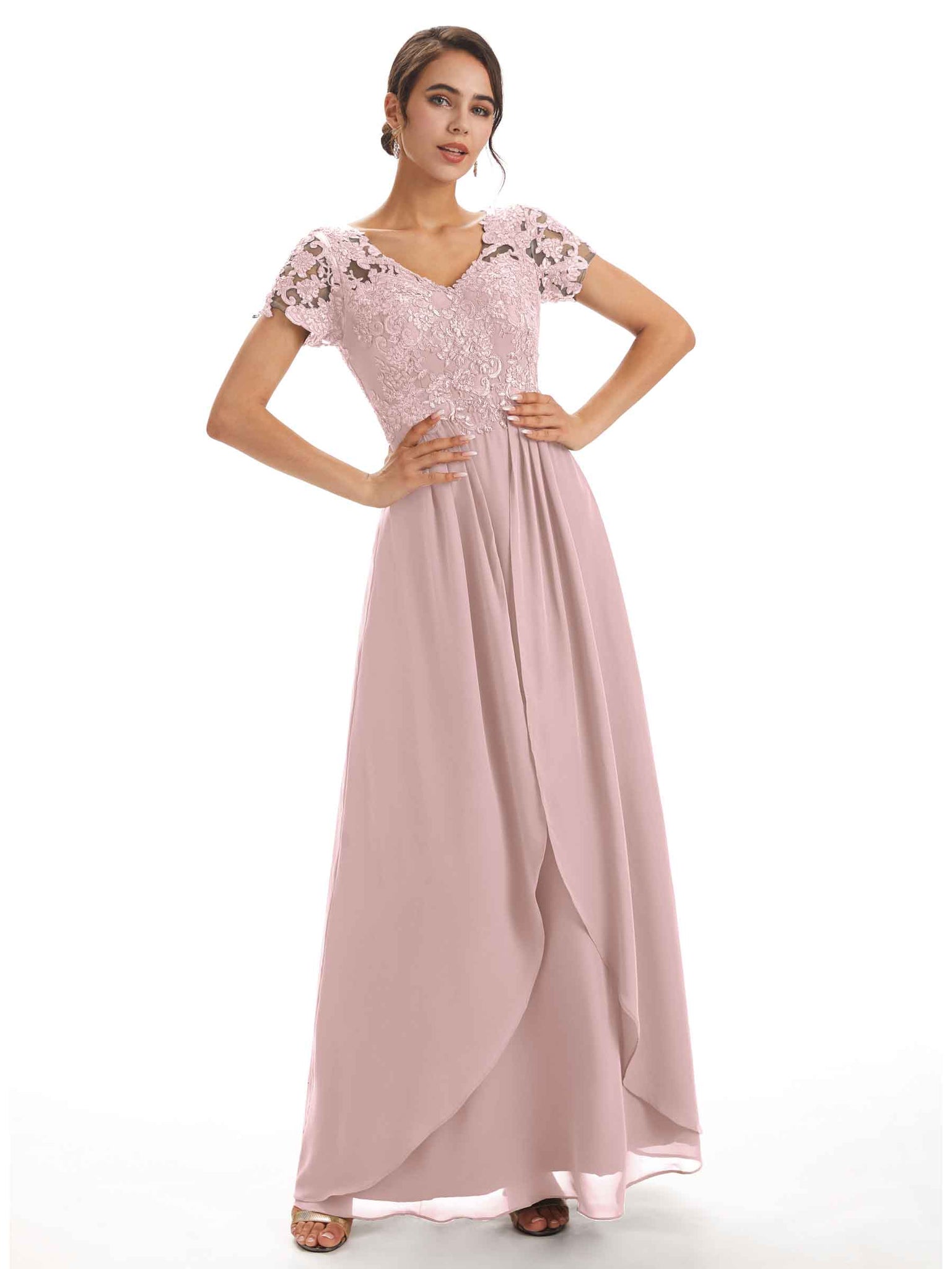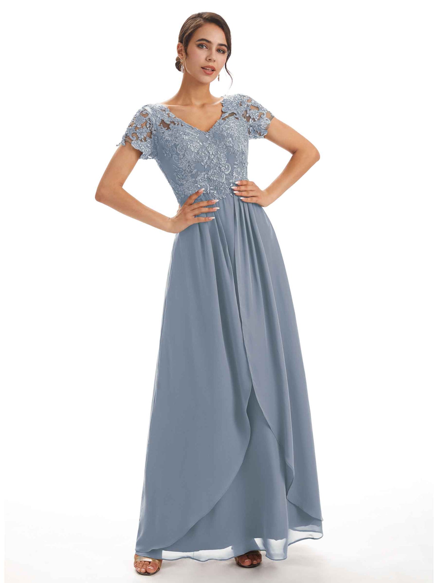 Elegant Lace Short Sleeves Chiffon V-neck Floor-length Mother of The Bride DressesElegant Lace Short Sleeves Chiffon V-neck Floor-length Mother of The Bride Dresses