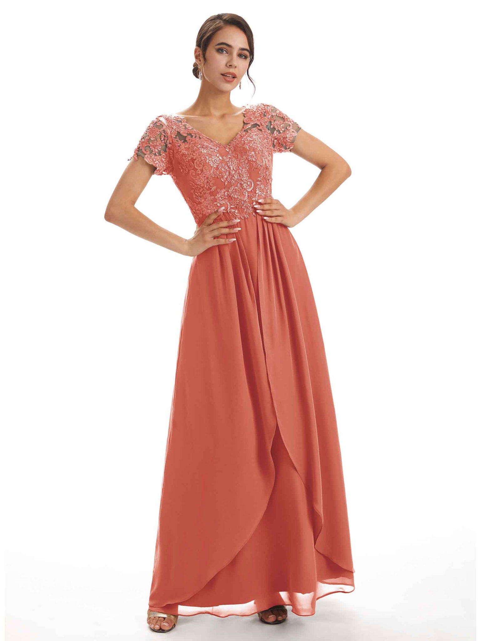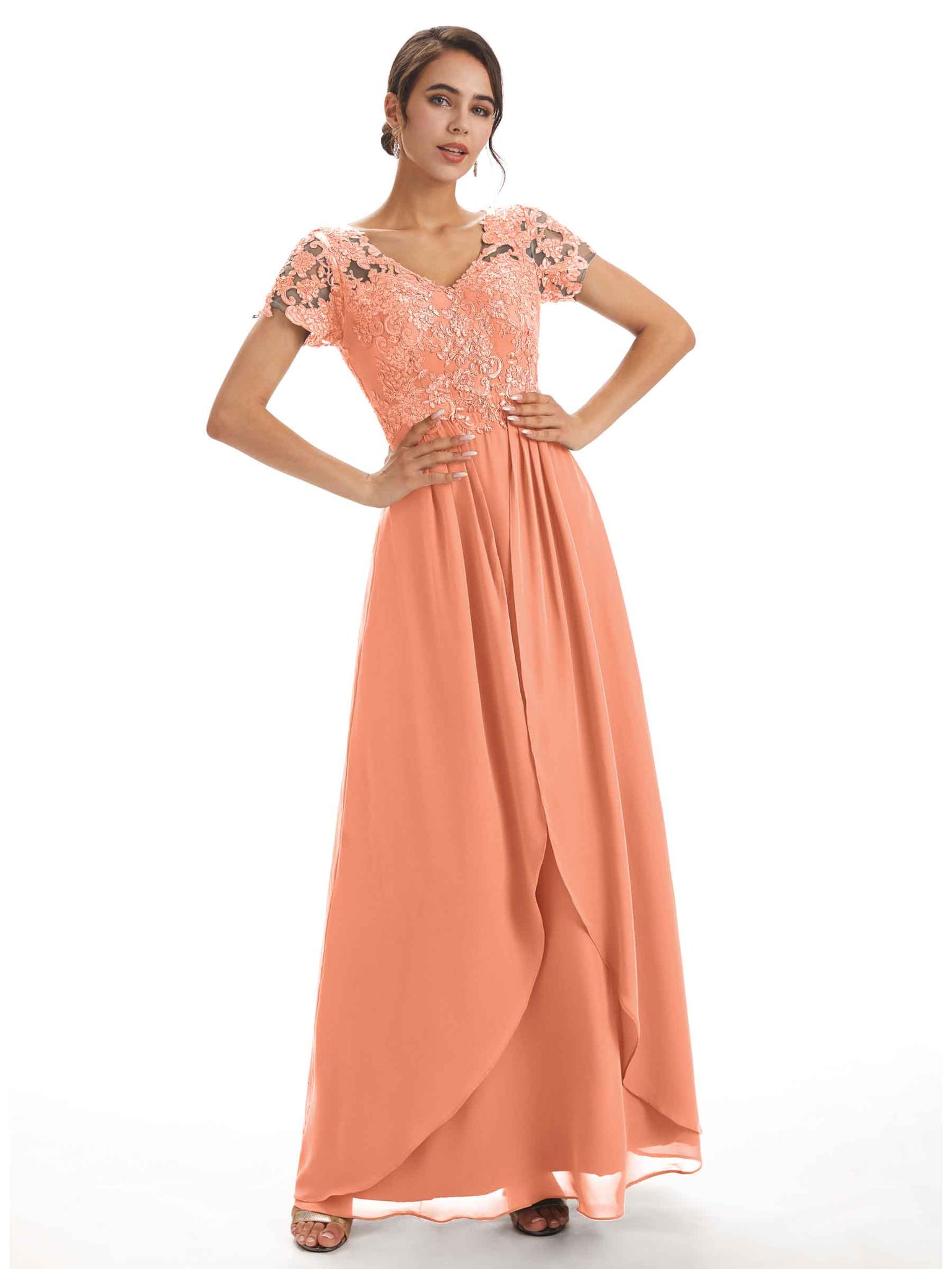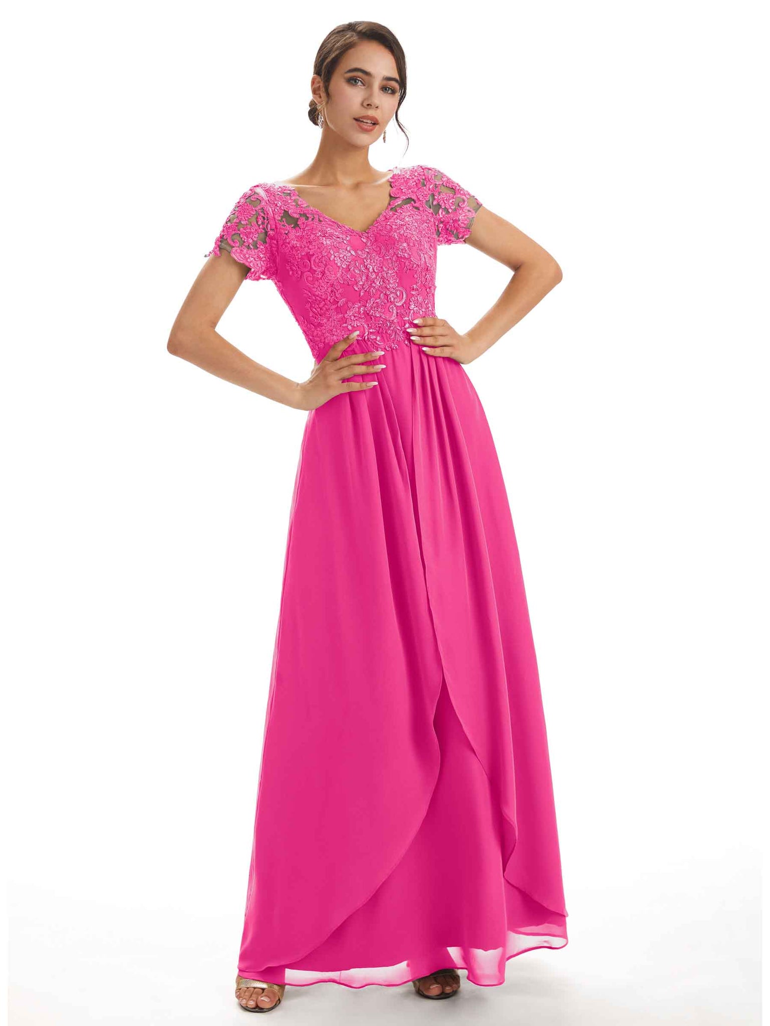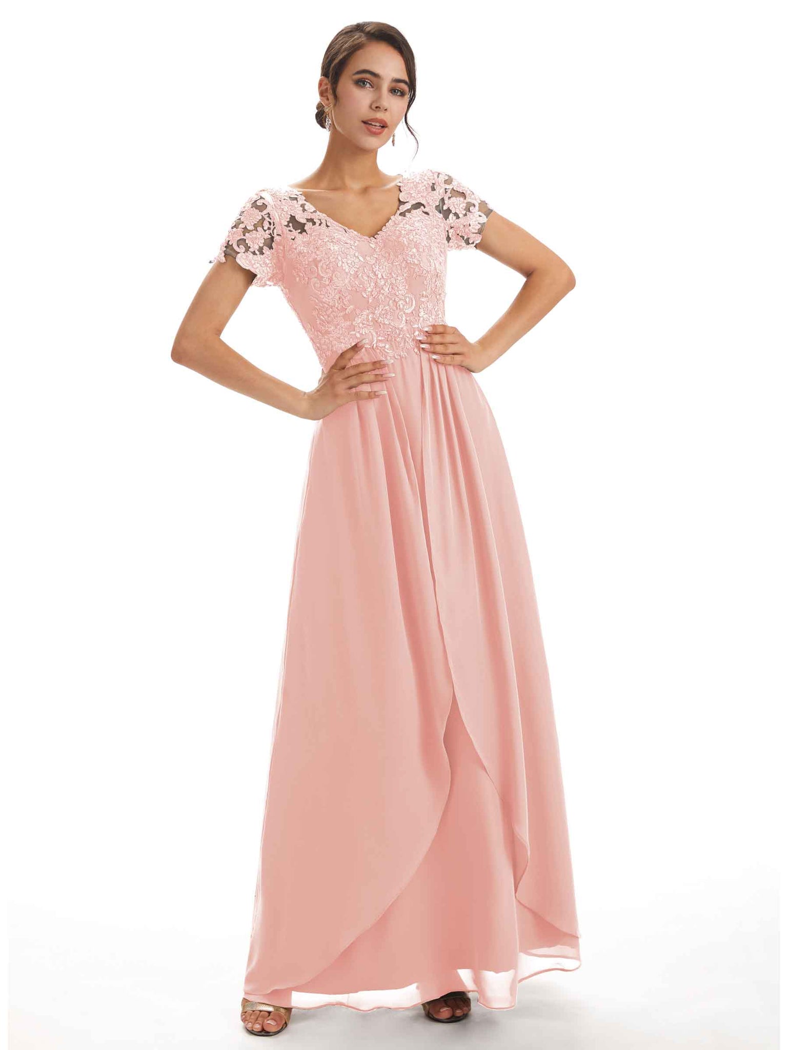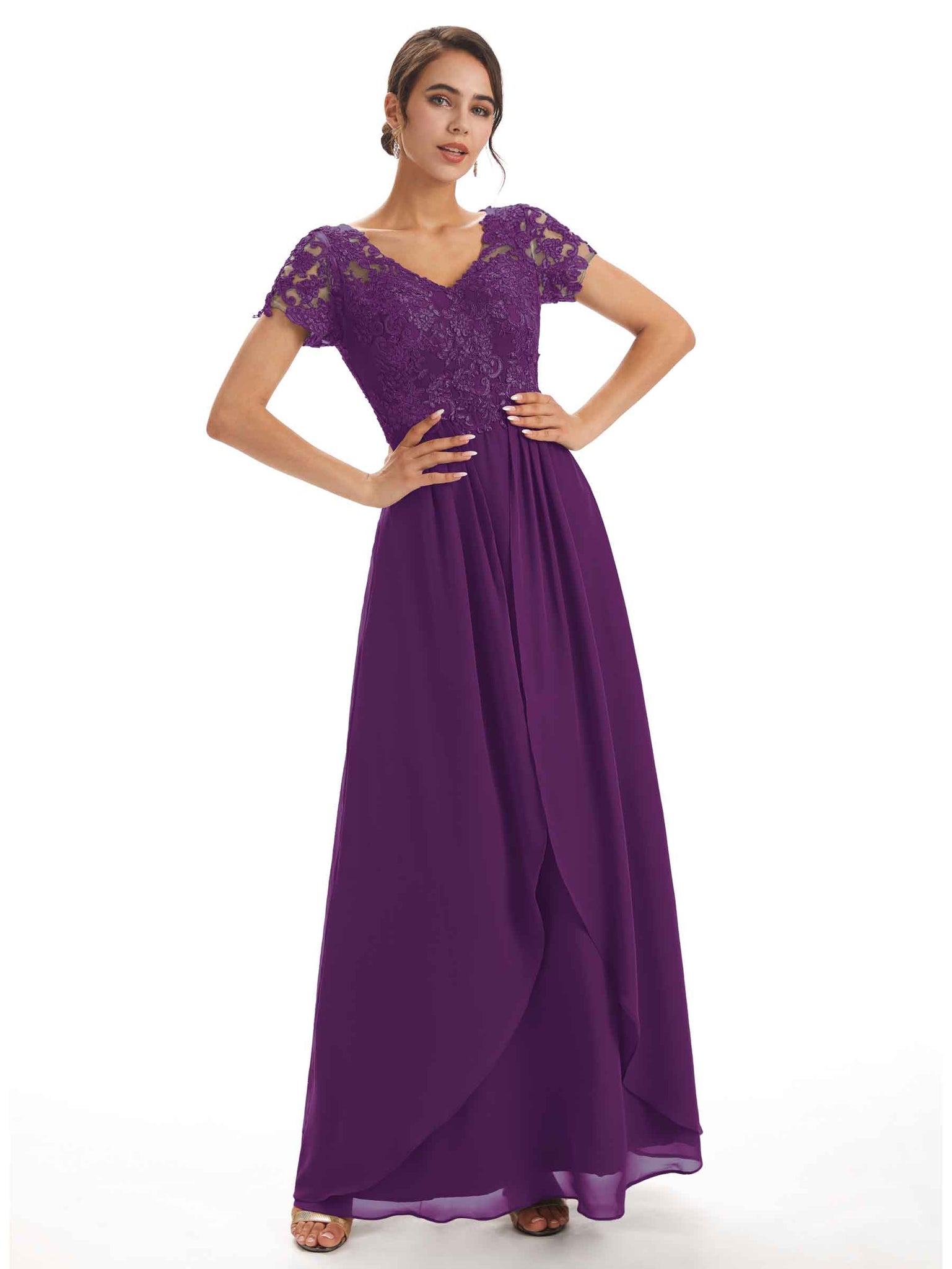 Elegant Lace Short Sleeves Chiffon V-neck Floor-length Mother of The Bride DressesElegant Lace Short Sleeves Chiffon V-neck Floor-length Mother of The Bride Dresses