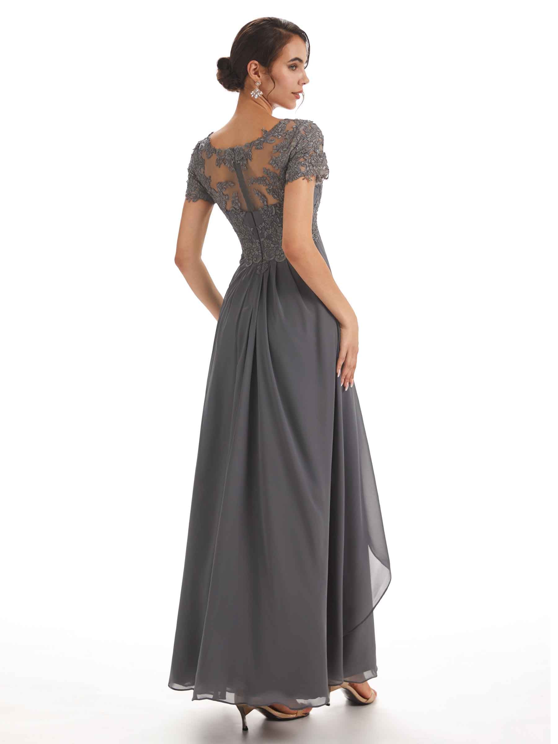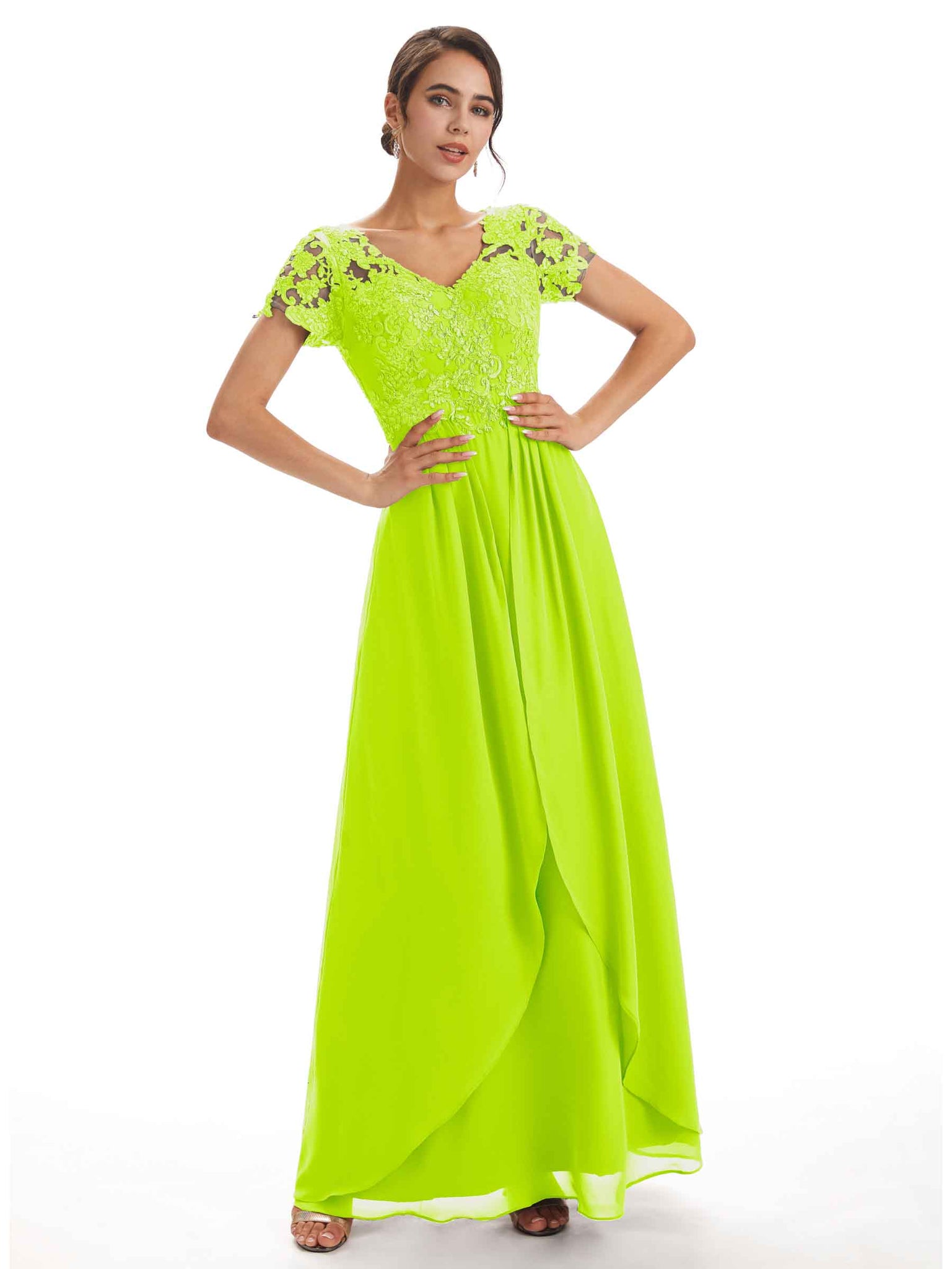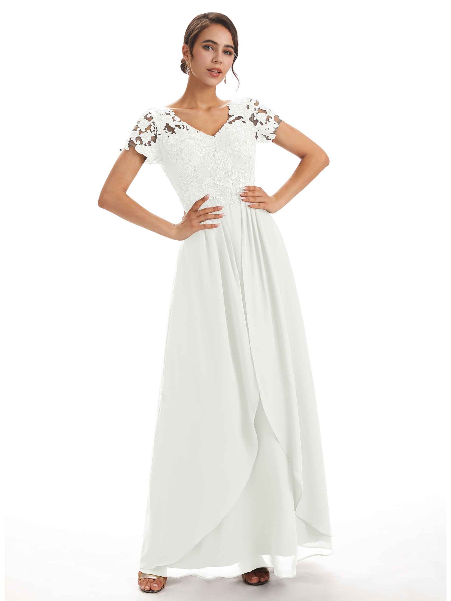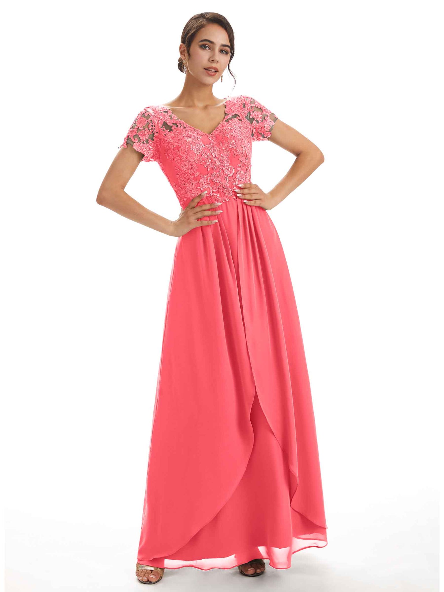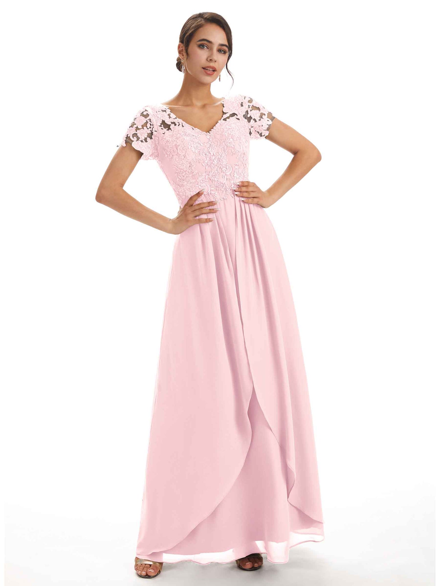 Elegant Lace Short Sleeves Chiffon V-neck Floor-length Mother of The Bride DressesElegant Lace Short Sleeves Chiffon V-neck Floor-length Mother of The Bride Dresses