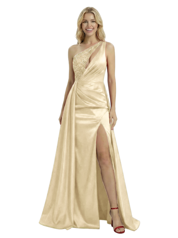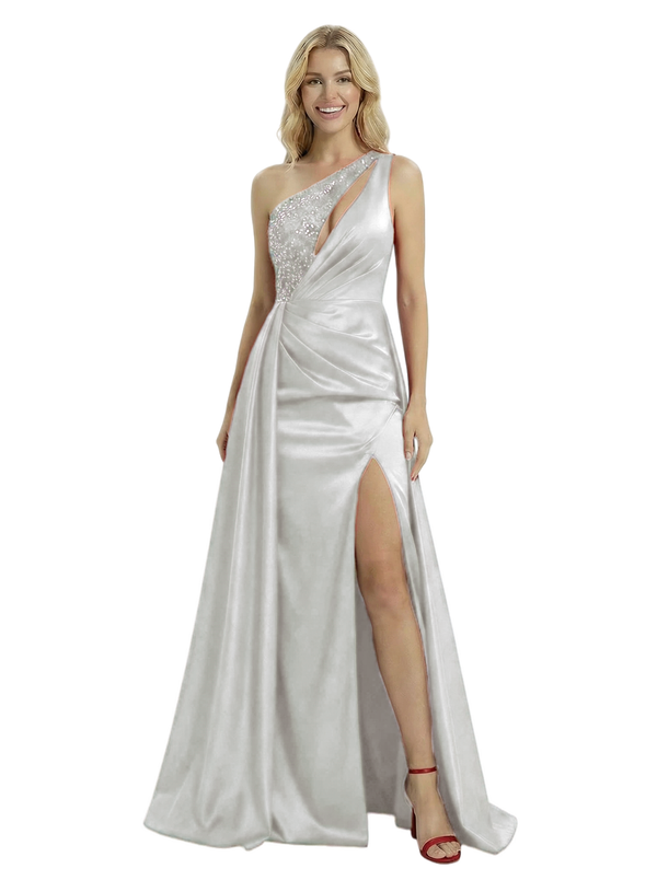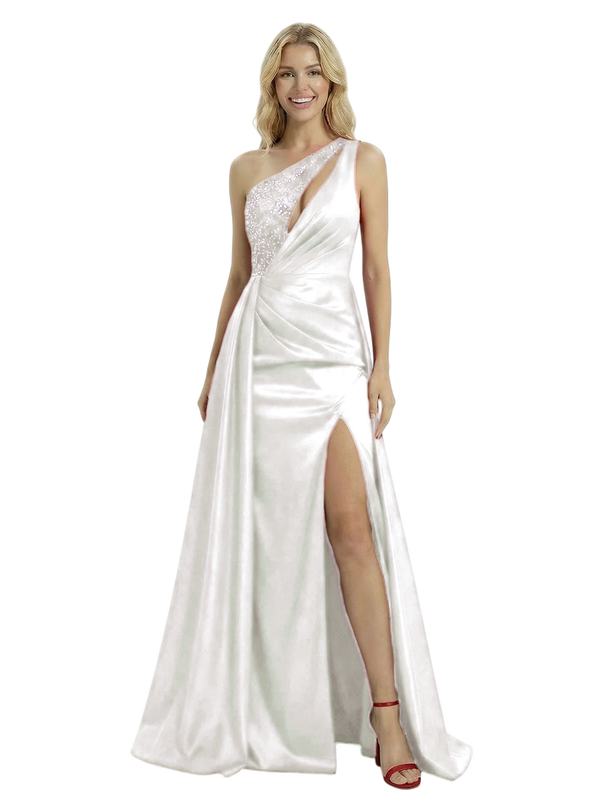 ChicSew One Shoulder Ruched Mermaid Satin Maxi Long Evening Gown Slit With Side Overlay