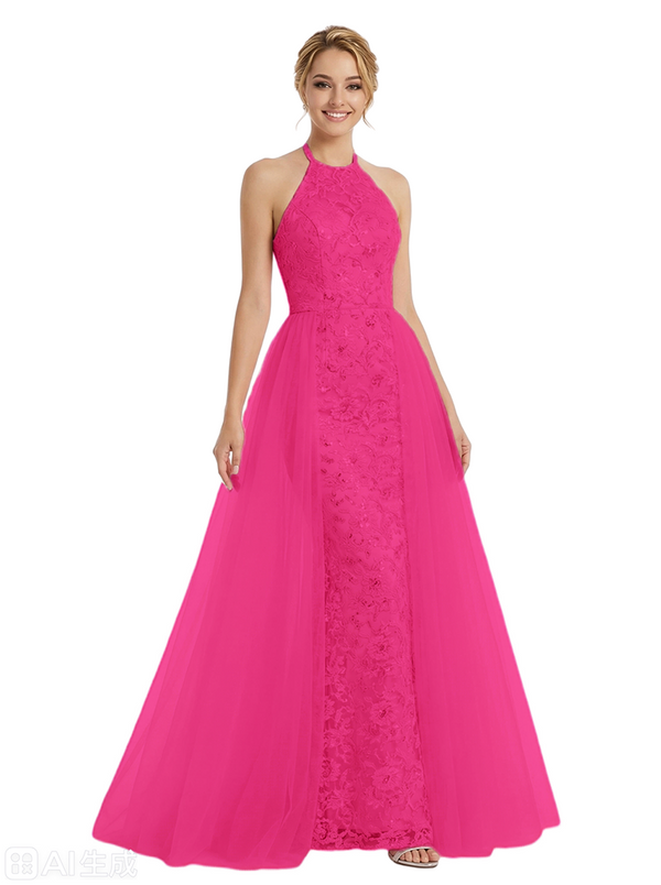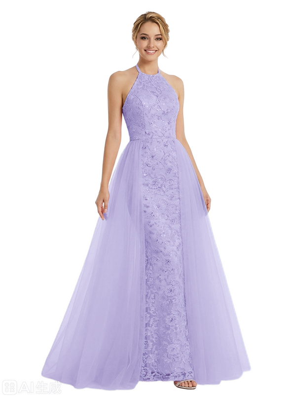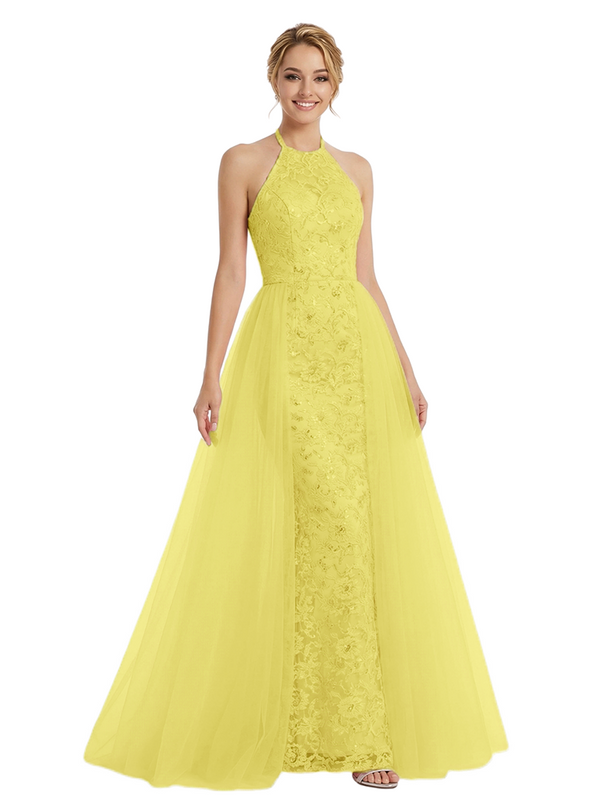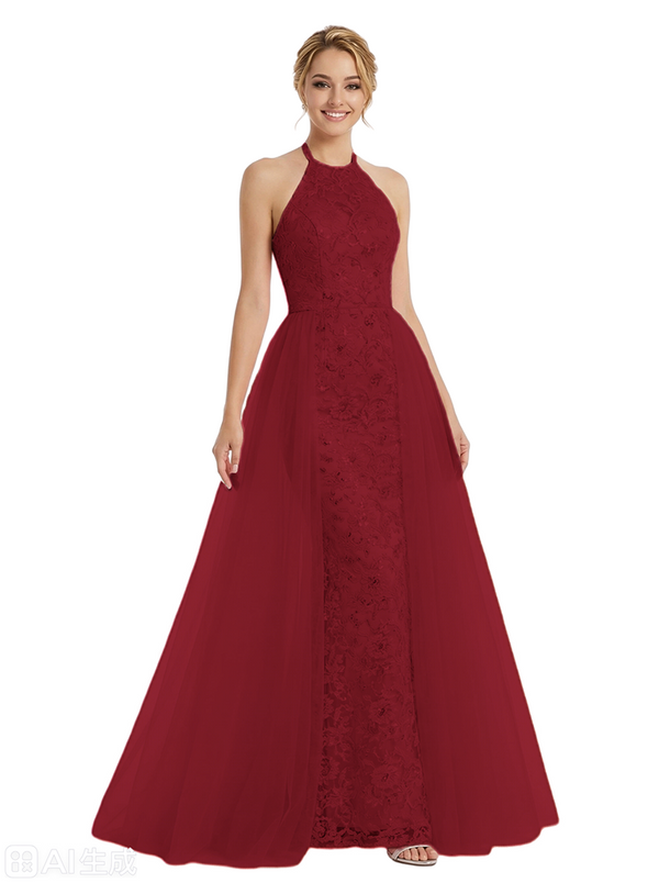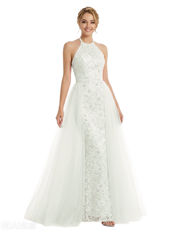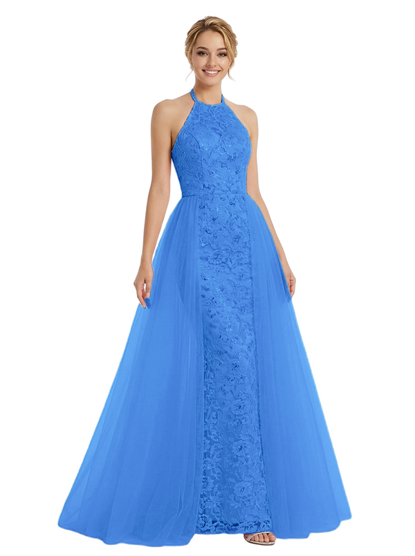 ChicSew Pretty Halter Neck Prom Gown Lace Tulle Fabric A-Line Maxi Formal Evening Gown OverSkirt