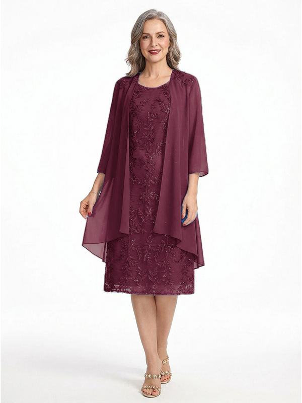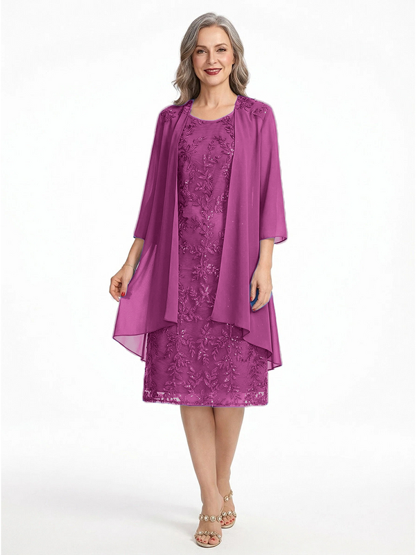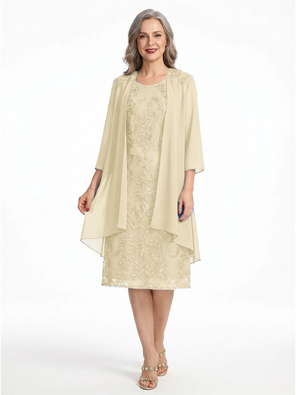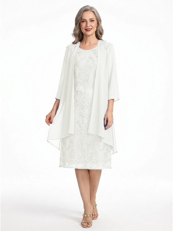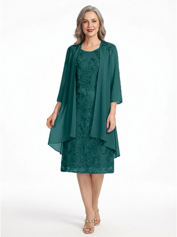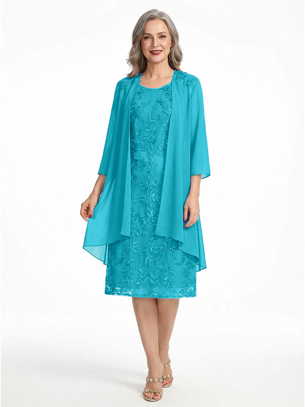 ChicSew Round Neck 3/4 Sleeve Chiffon Jacket Beaded Lace Applique Knee Length Chiffon Sophisticated Mother Of The Bride And Groom Dresses - ChicSew – ChicSew