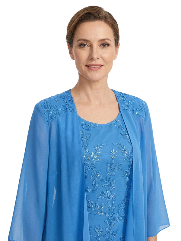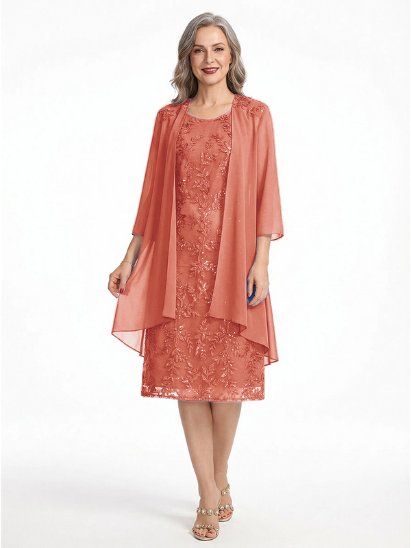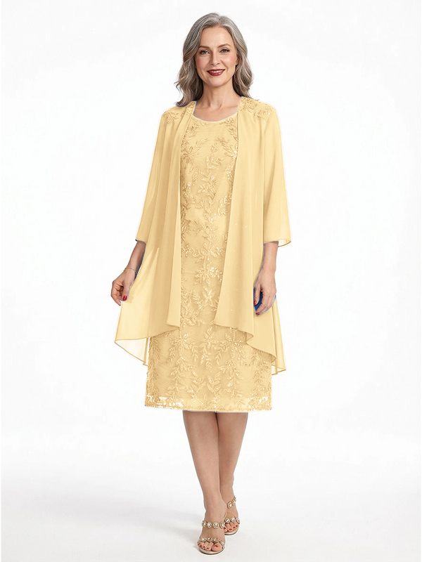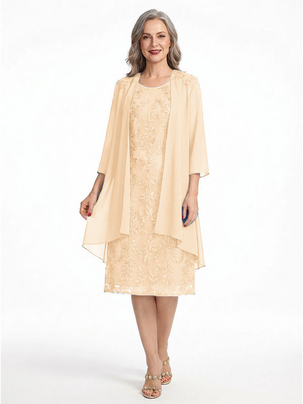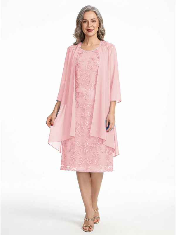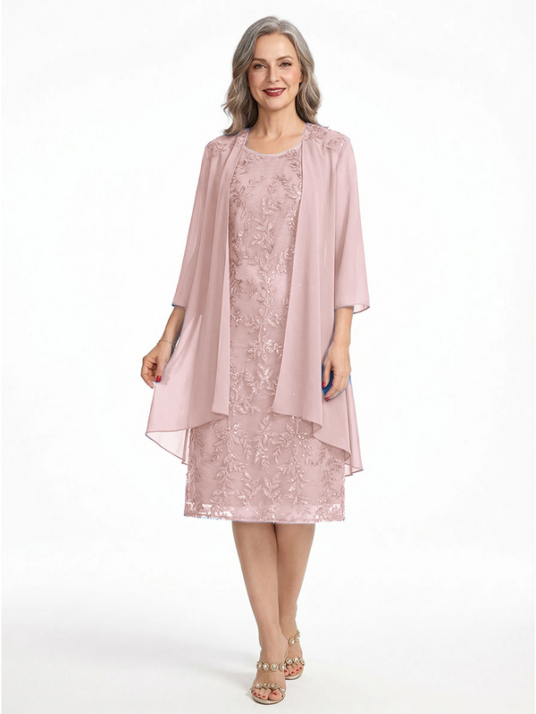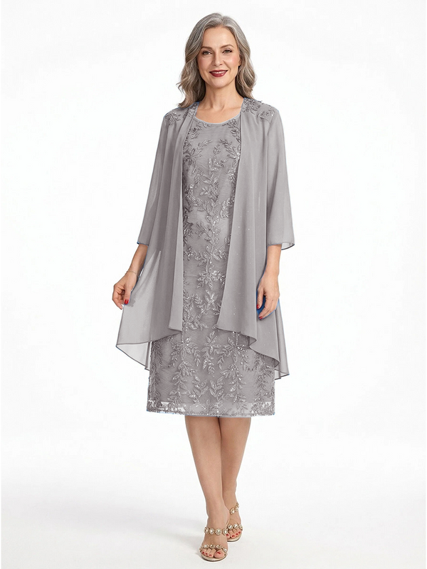 ChicSew Round Neck 3/4 Sleeve Chiffon Jacket Beaded Lace Applique Knee Length Chiffon Sophisticated Mother Of The Bride And Groom Dresses - ChicSew – ChicSew