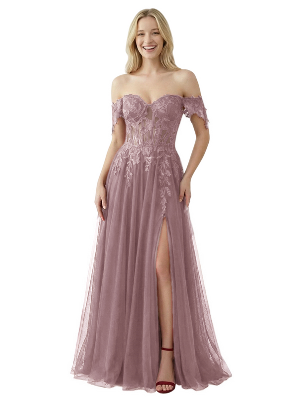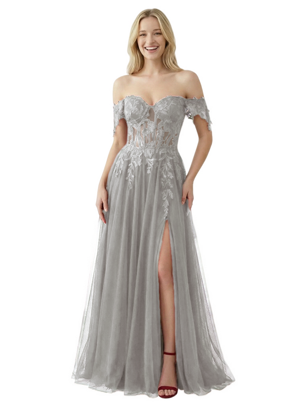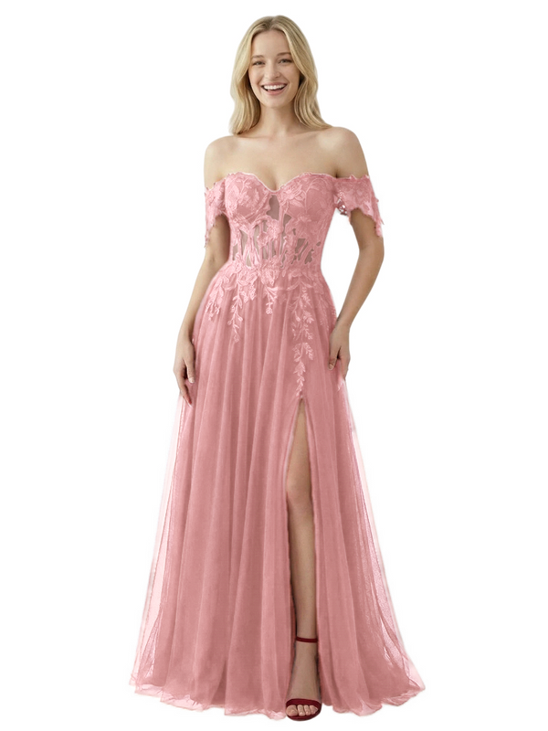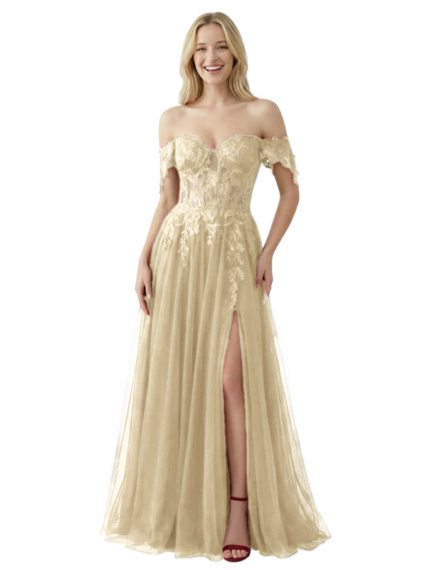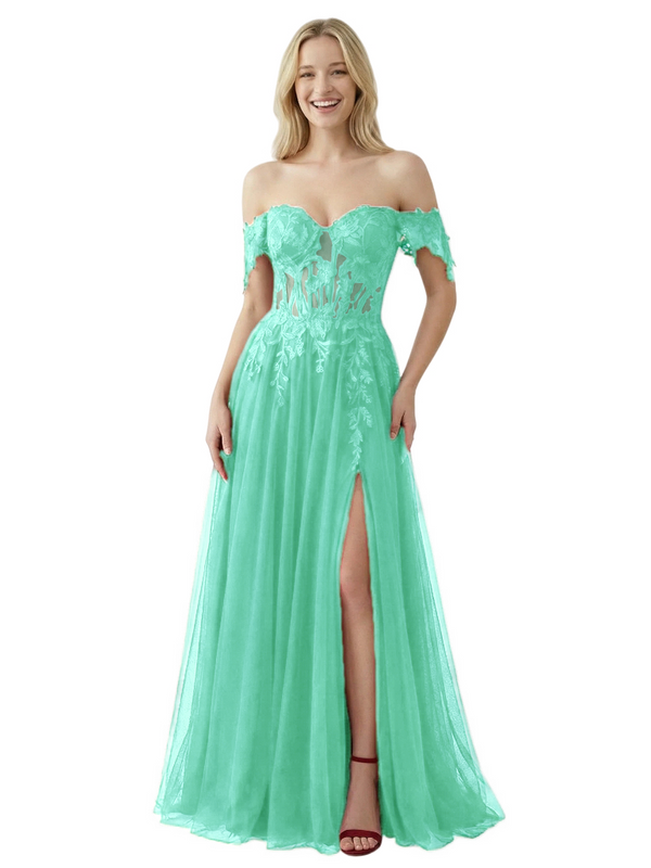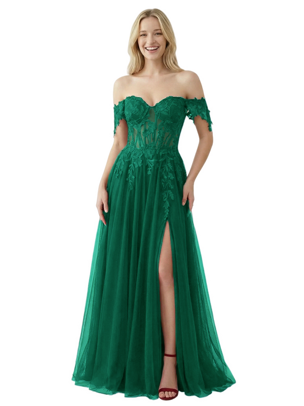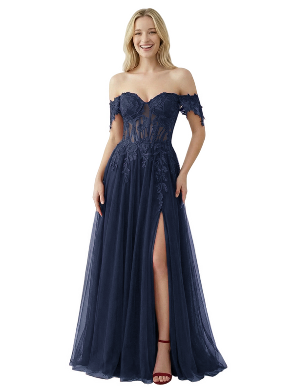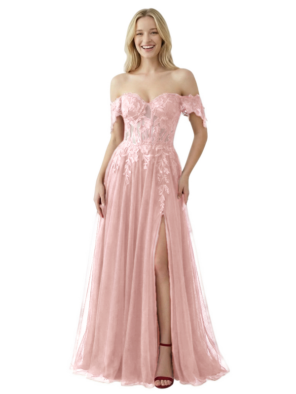 ChicSew Sexy Off Shoulder Sleeveless Side Slit Lace Corset A-Line Floor Length Prom Dress
