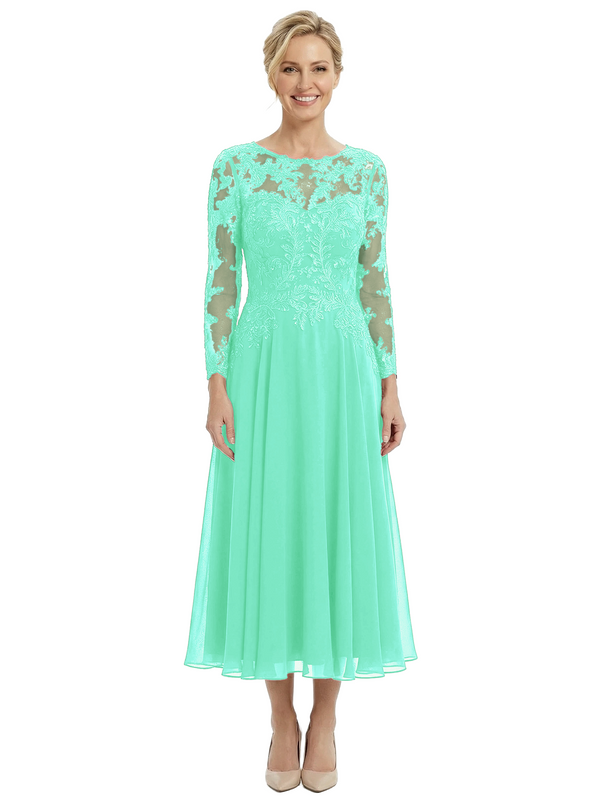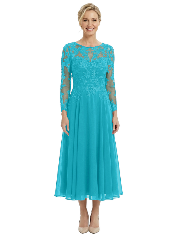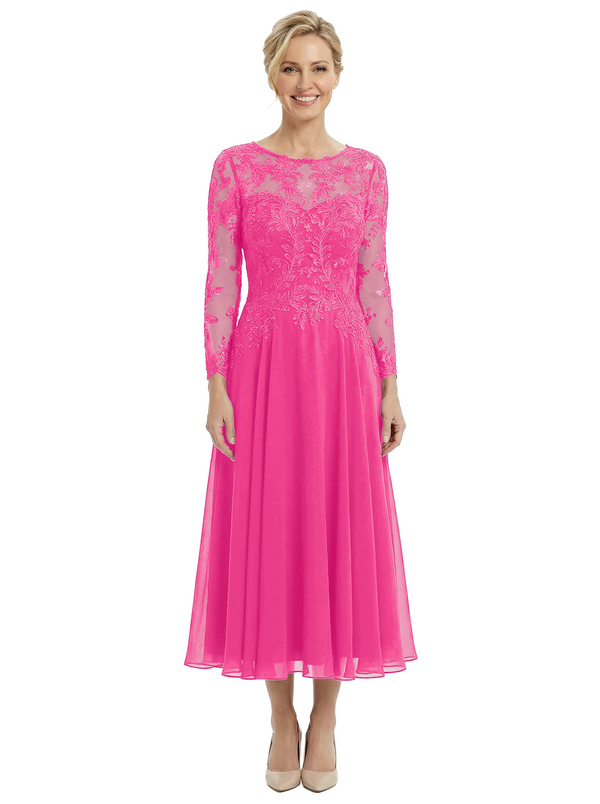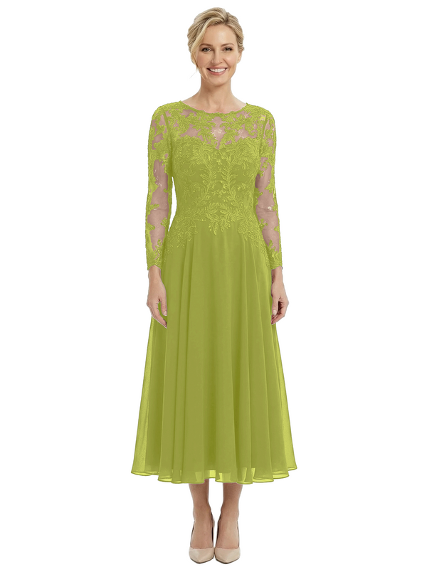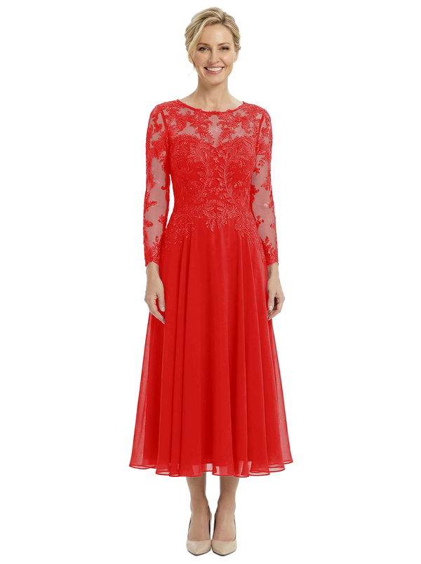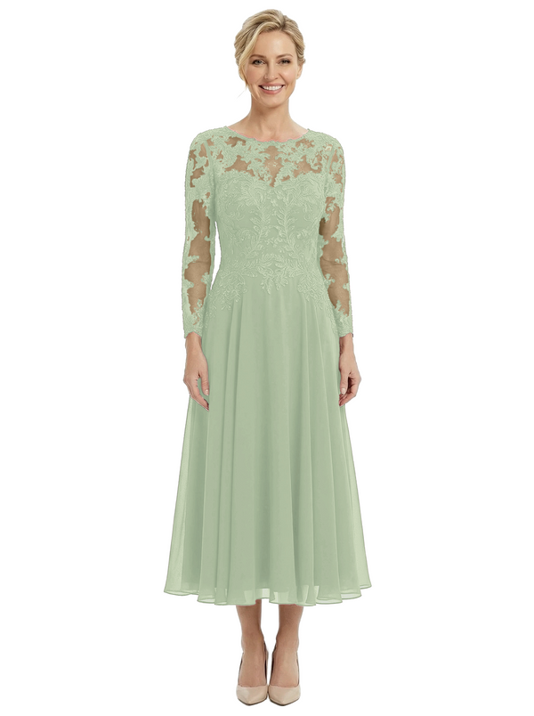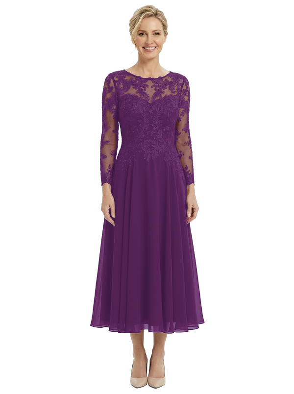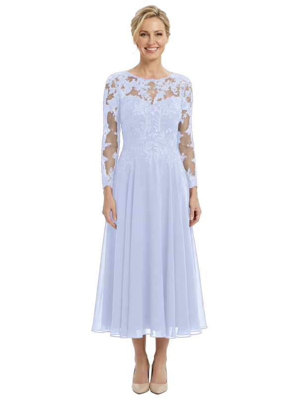 Chicsew Sophisticated Long Sleeves Lace Top Chiffon A-Line Tea-Length Wedding Dress For Mother Of The Bride - ChicSew – ChicSew
