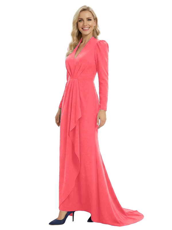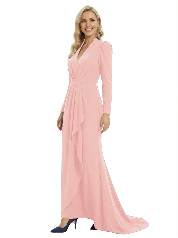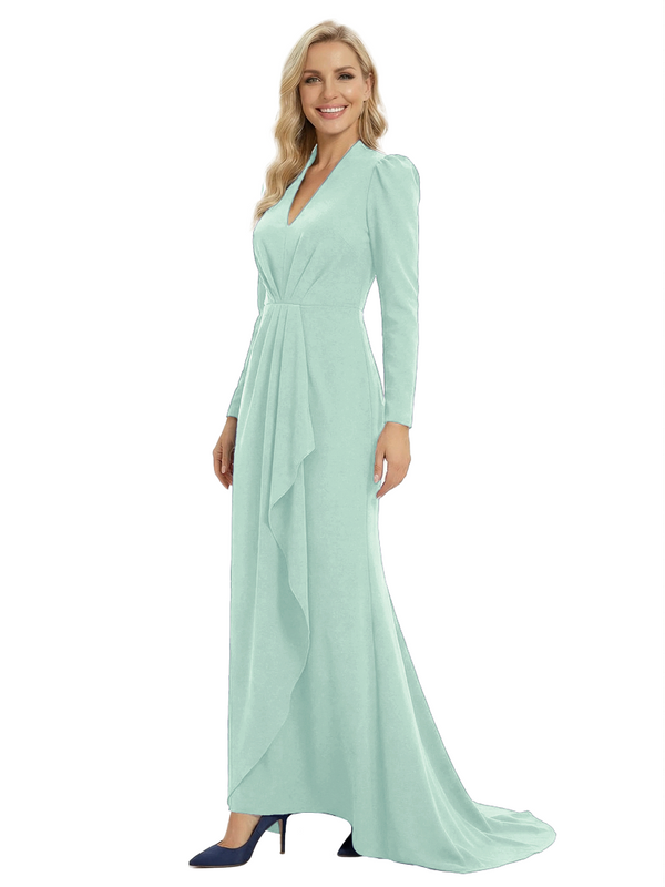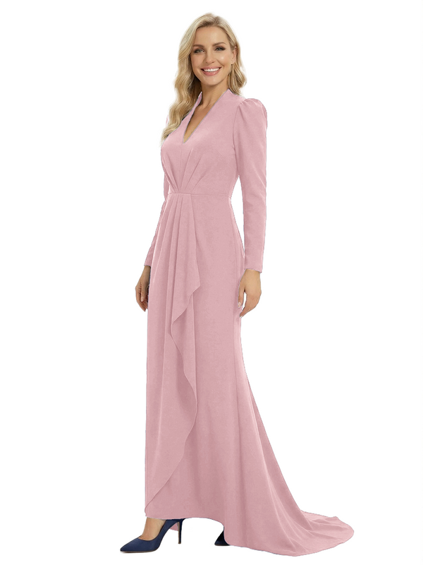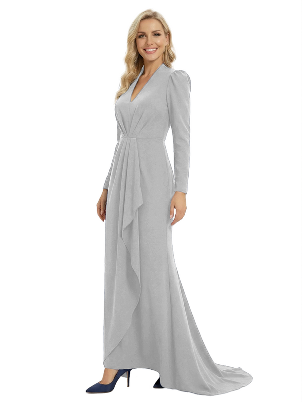 Chicsew Sophisticated Mother of The Groom Dress V-Neck Long Sleeves Ruffled Detail Fitted Train Jersey Fabric Timeless Elegant Formal Wedding Event Gown