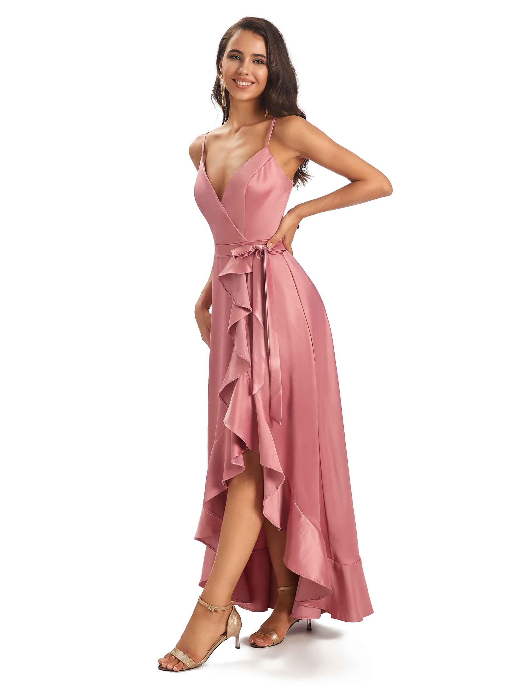 Elegant Spaghetti Straps Asymetric A-line Soft Satin Wrap V-neck High Low Bridesmaid Dresses $109.99