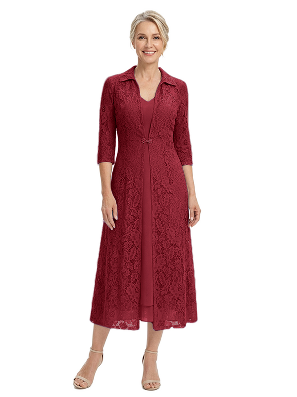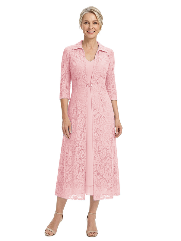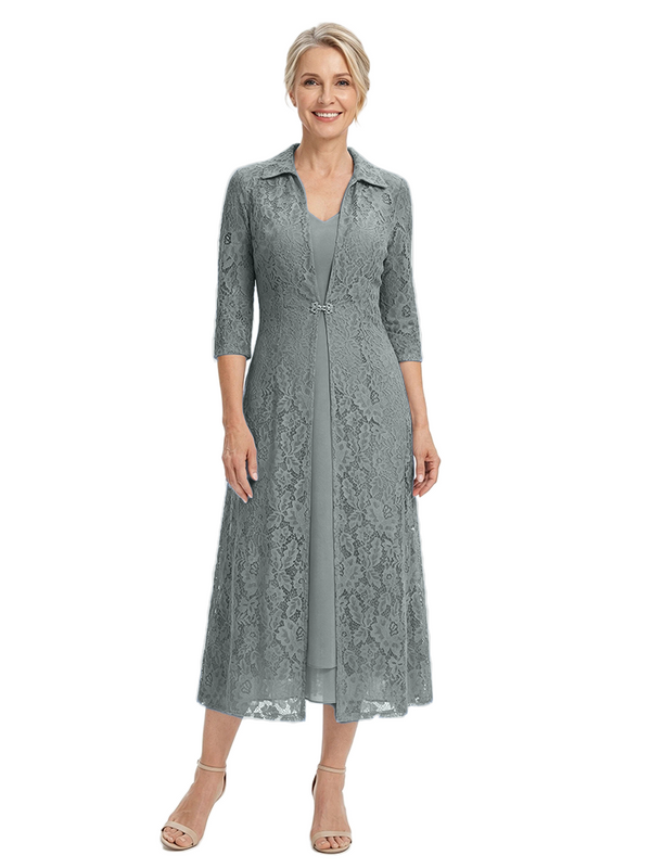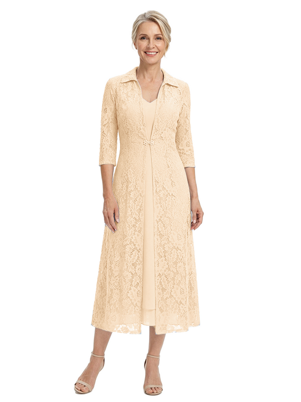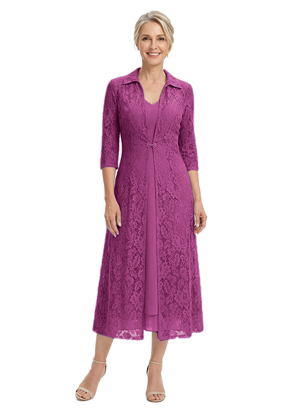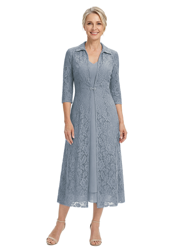 ChicSew V-Neck 3/4 Sleeve Embroidered Lace Ruched Waist Tea Length Chiffon Mother of the Bride Dresses With Jacket - ChicSew – ChicSew