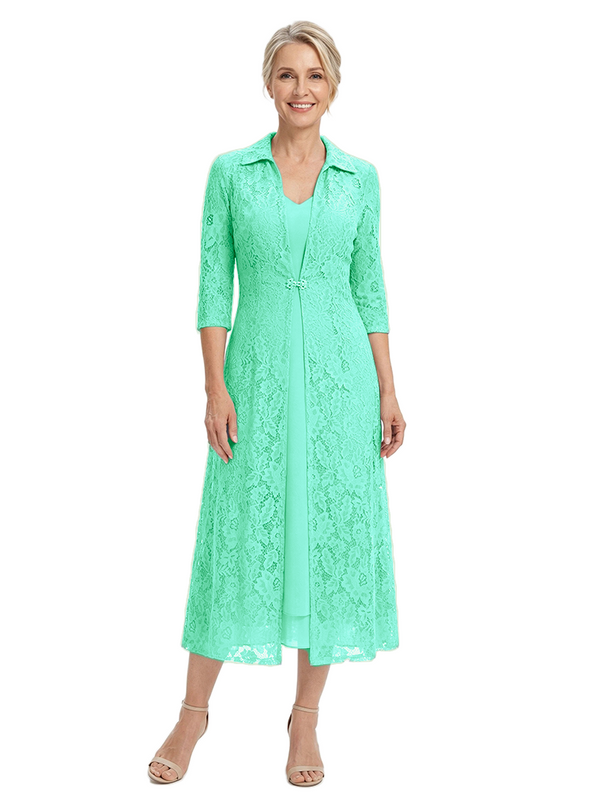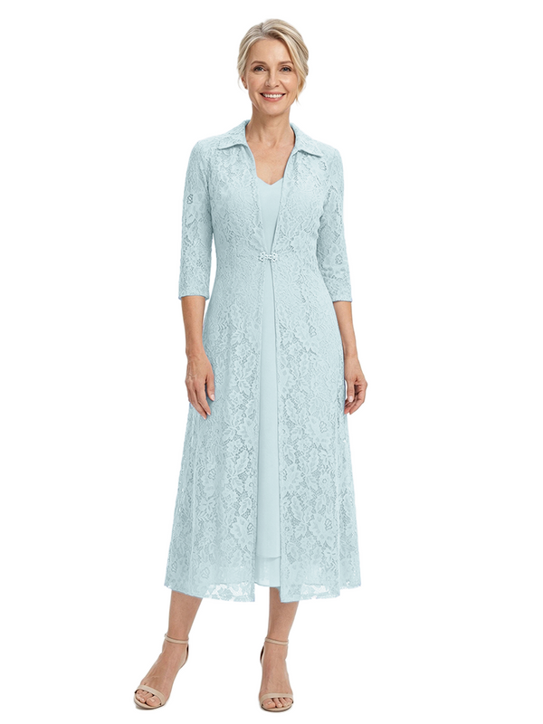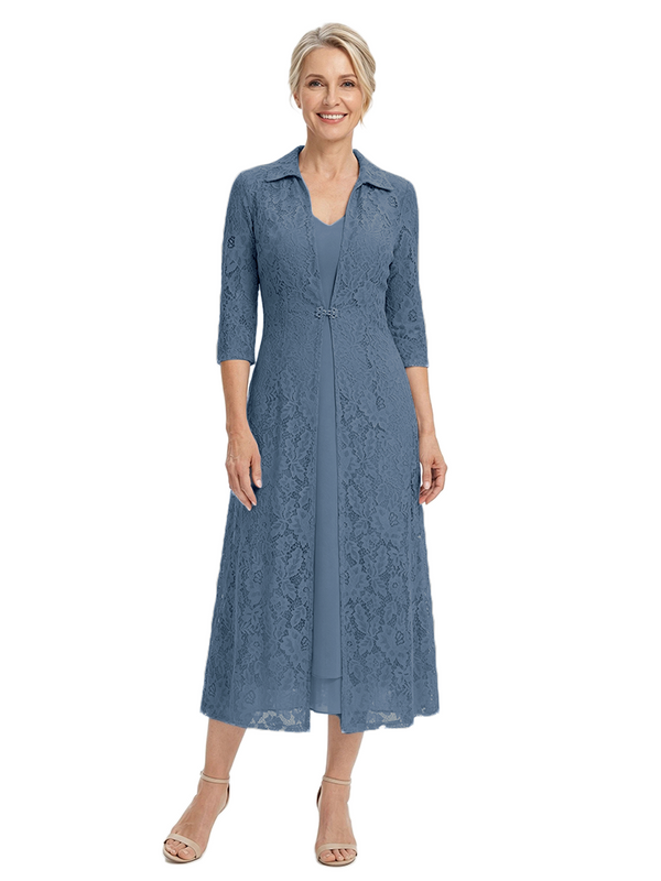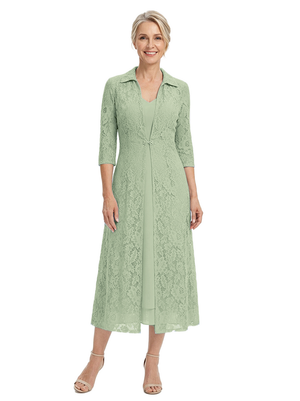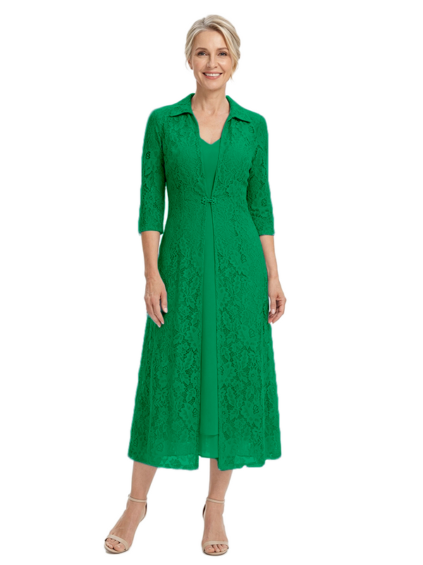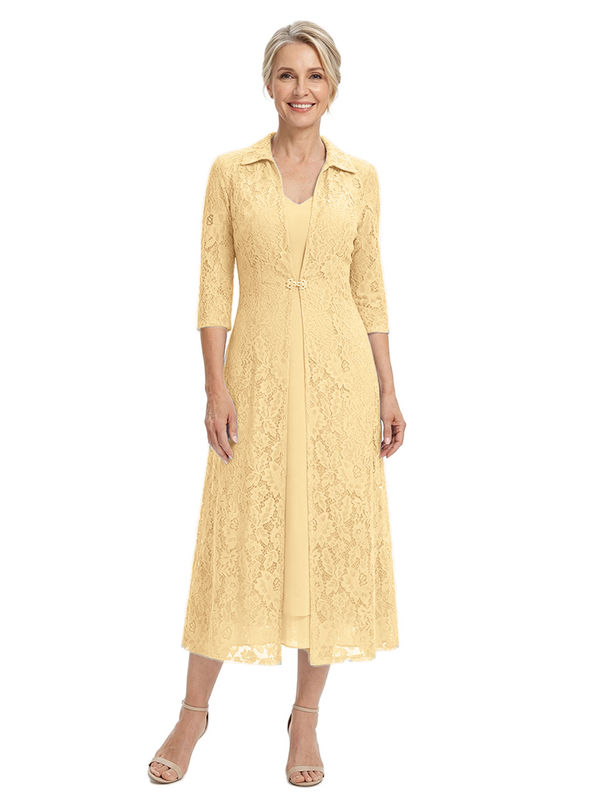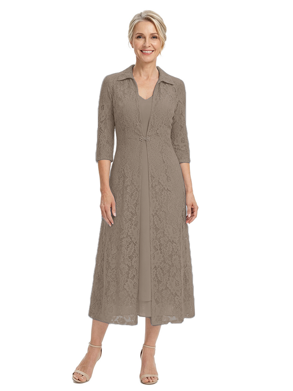 ChicSew V-Neck 3/4 Sleeve Embroidered Lace Ruched Waist Tea Length Chiffon Mother of the Bride Dresses With Jacket - ChicSew – ChicSew