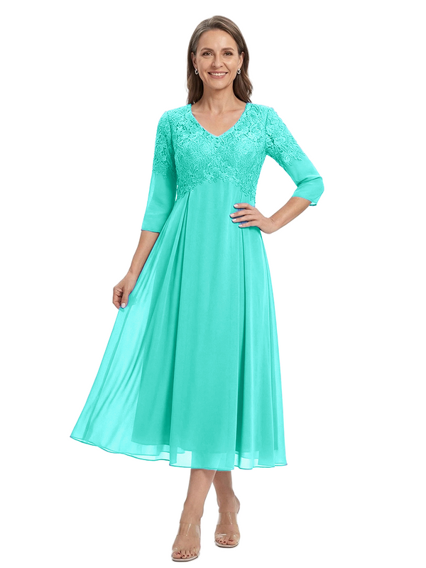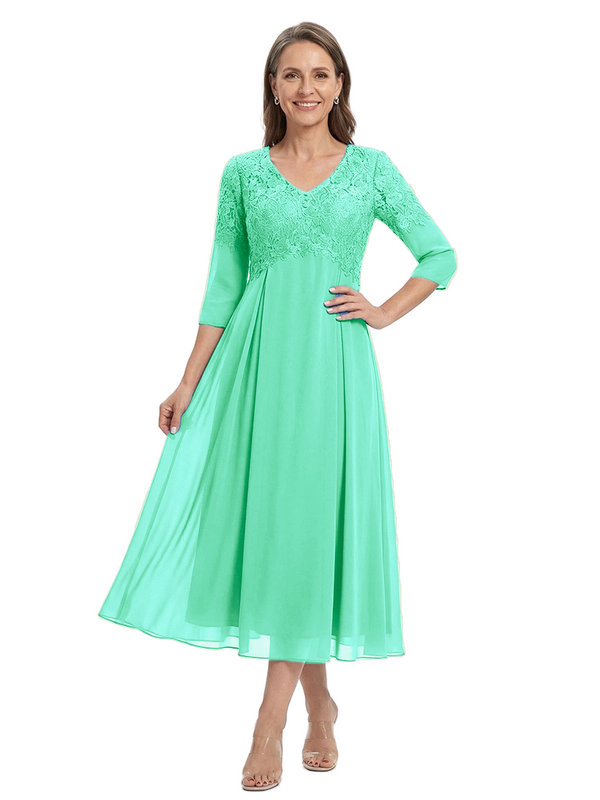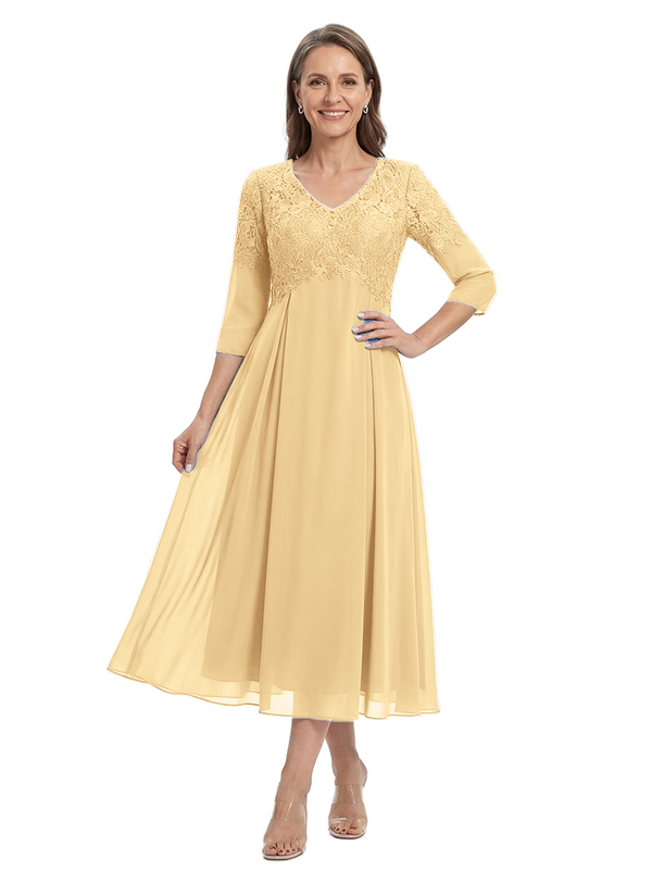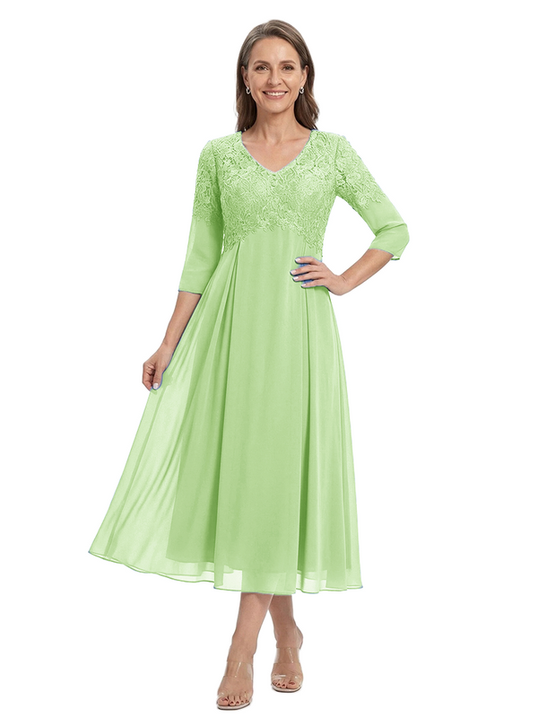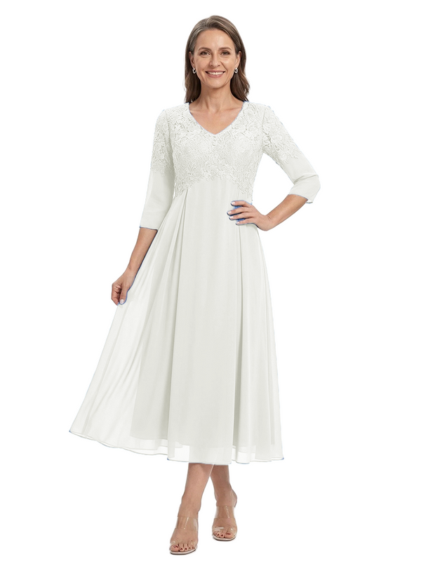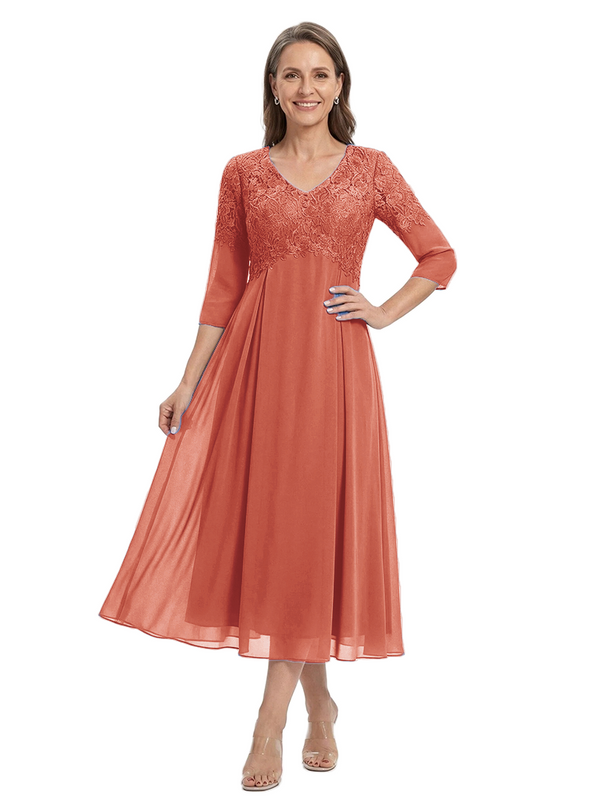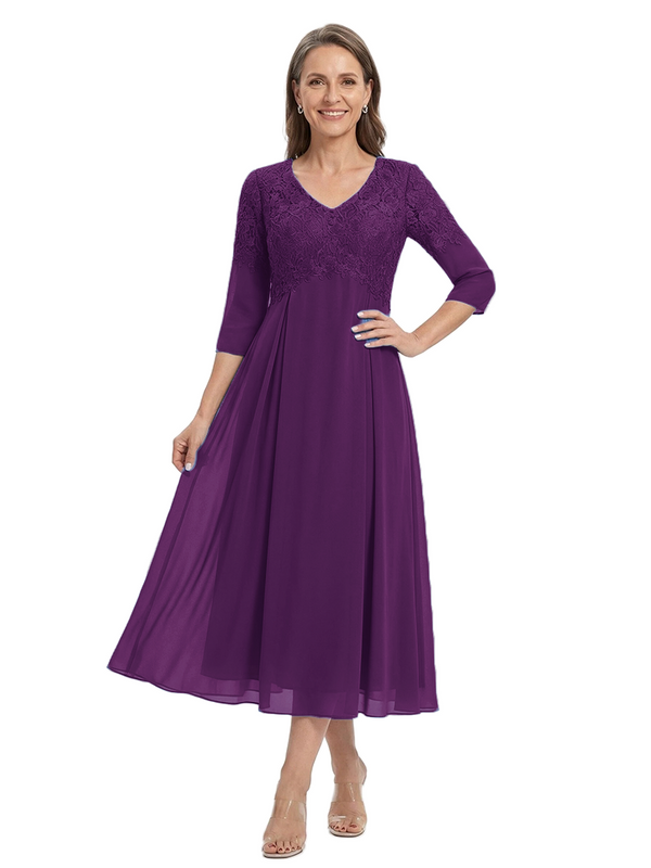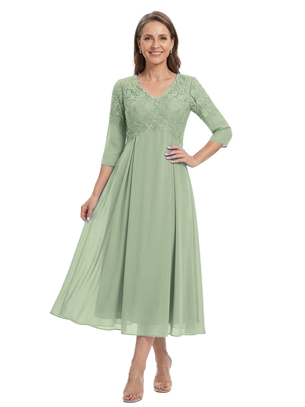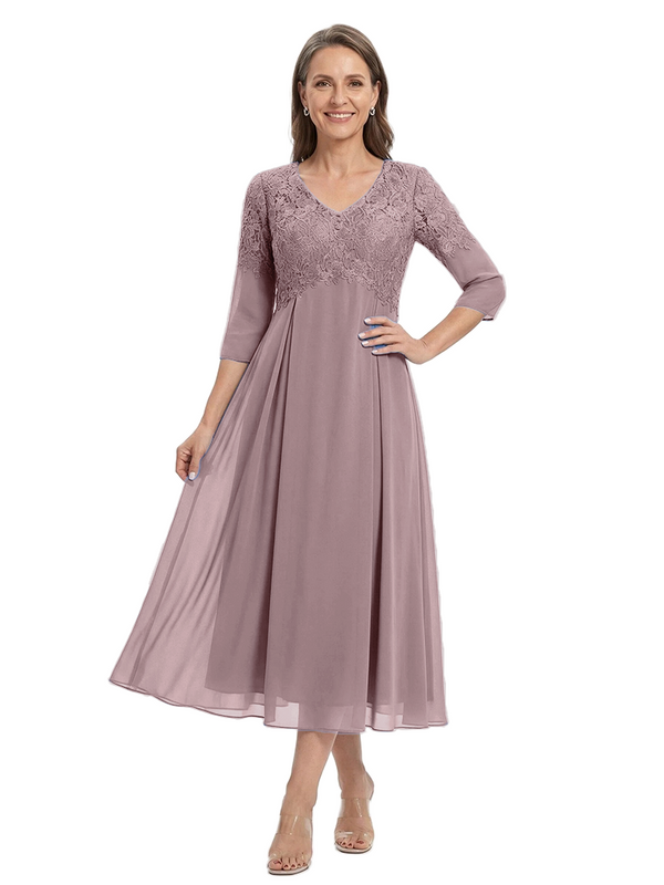 ChicSew V-Neck 3/4 Sleeve Lace Applique A Line Tea Length Chiffon Romantic Mom Of The Groom Dresses - ChicSew – ChicSew
