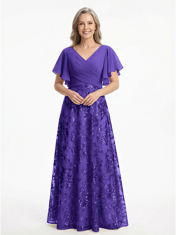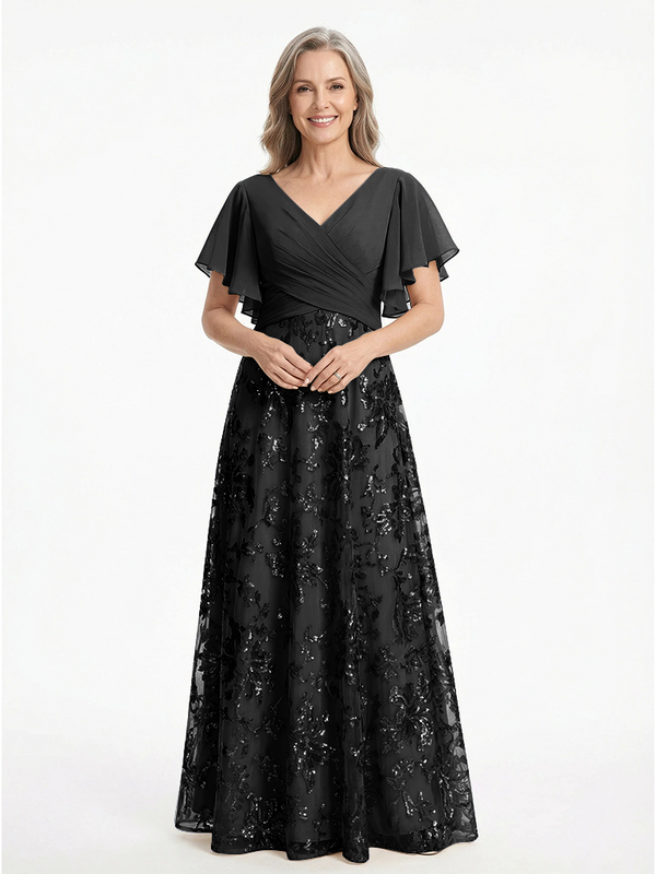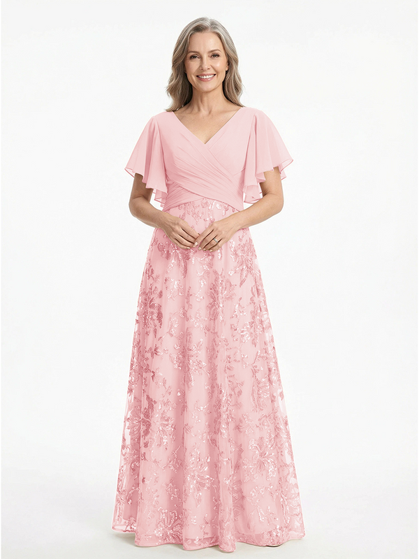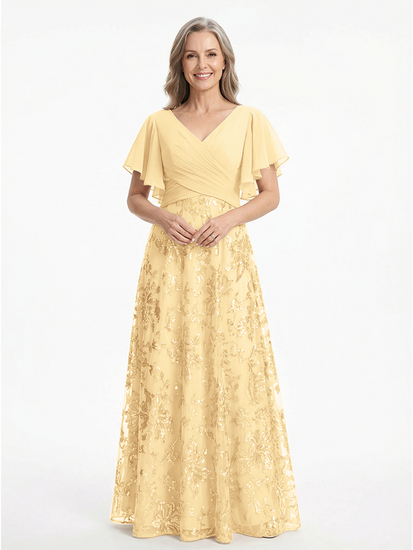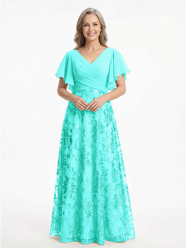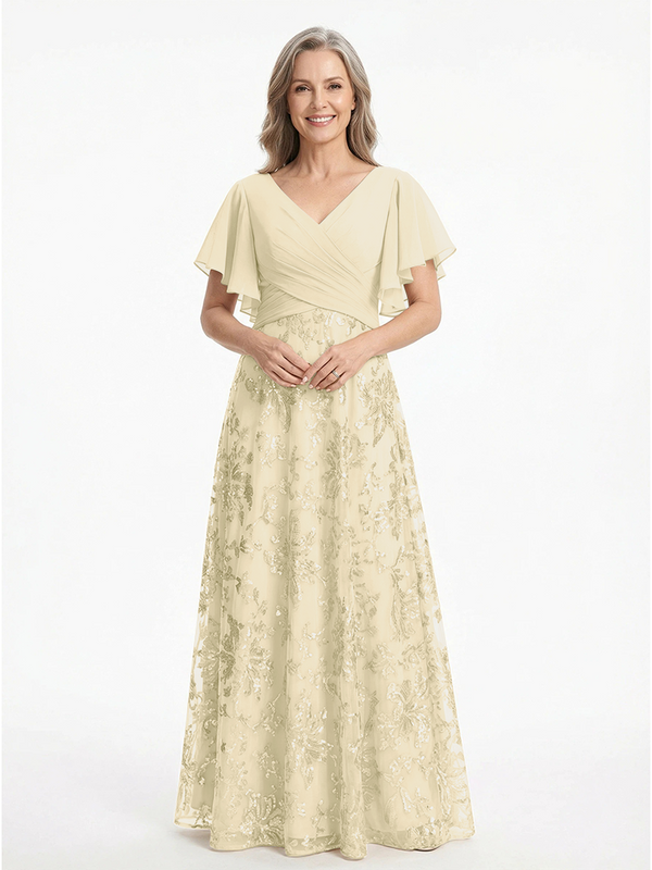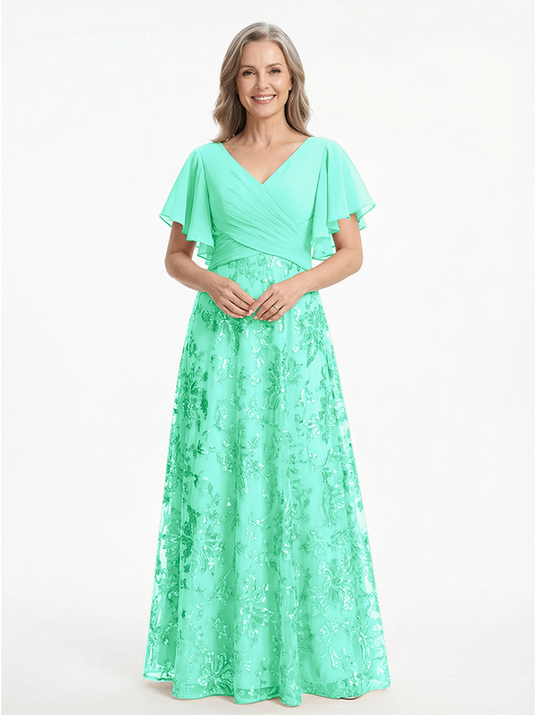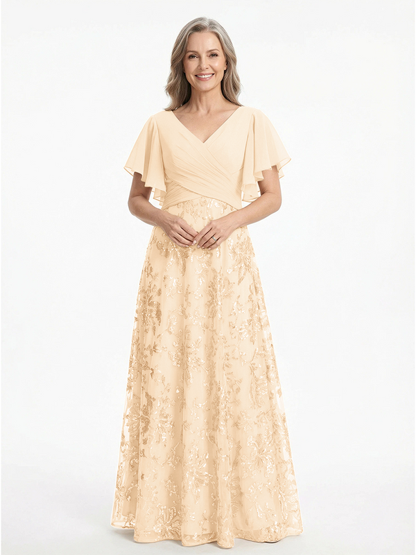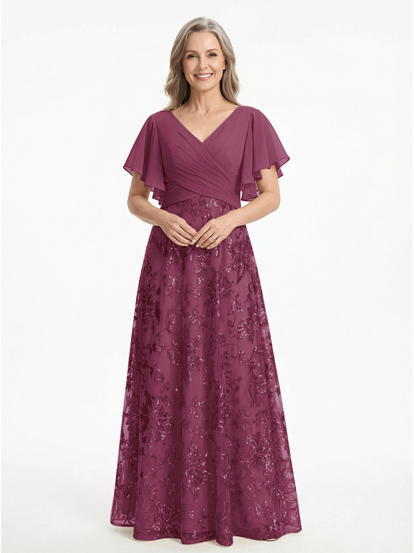 ChicSew V-Neck Short Sleeves Sequin Ruched A-Line Floor Length Chiffon Elegant Mother Of The Bride And Groom Dresses - ChicSew – ChicSew
