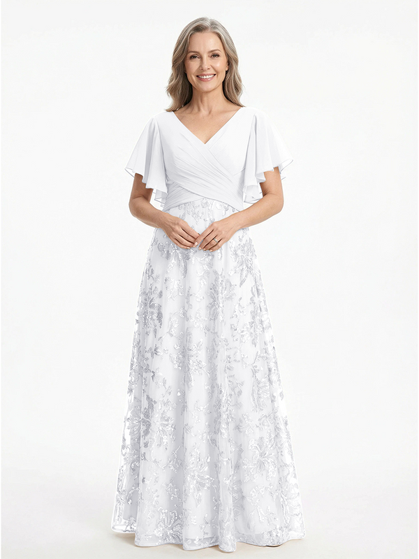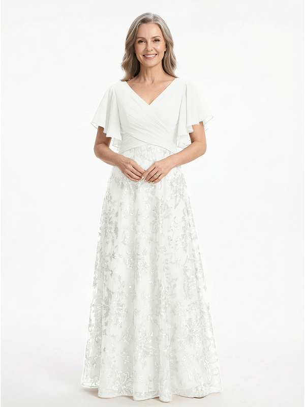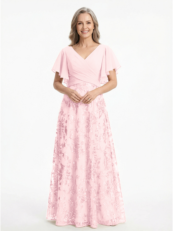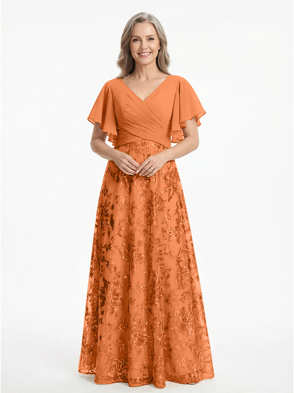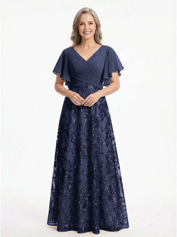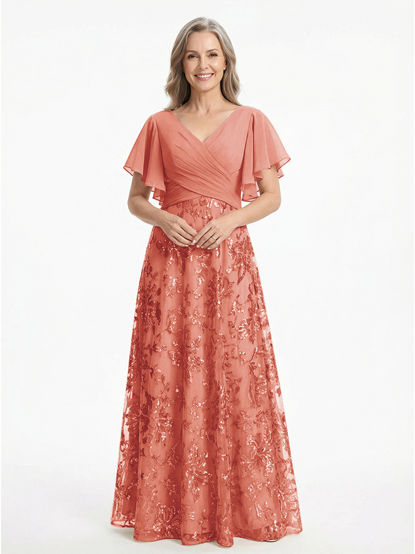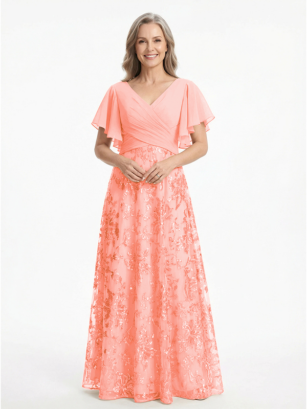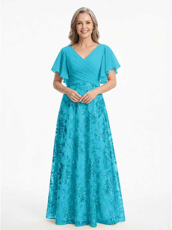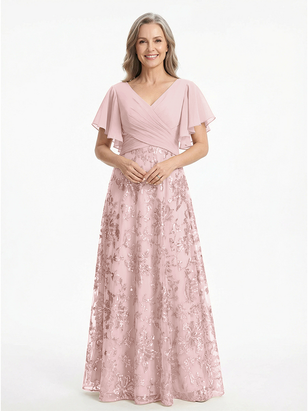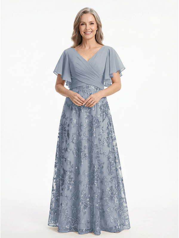 ChicSew V-Neck Short Sleeves Sequin Ruched A-Line Floor Length Chiffon Elegant Mother Of The Bride And Groom Dresses - ChicSew – ChicSew